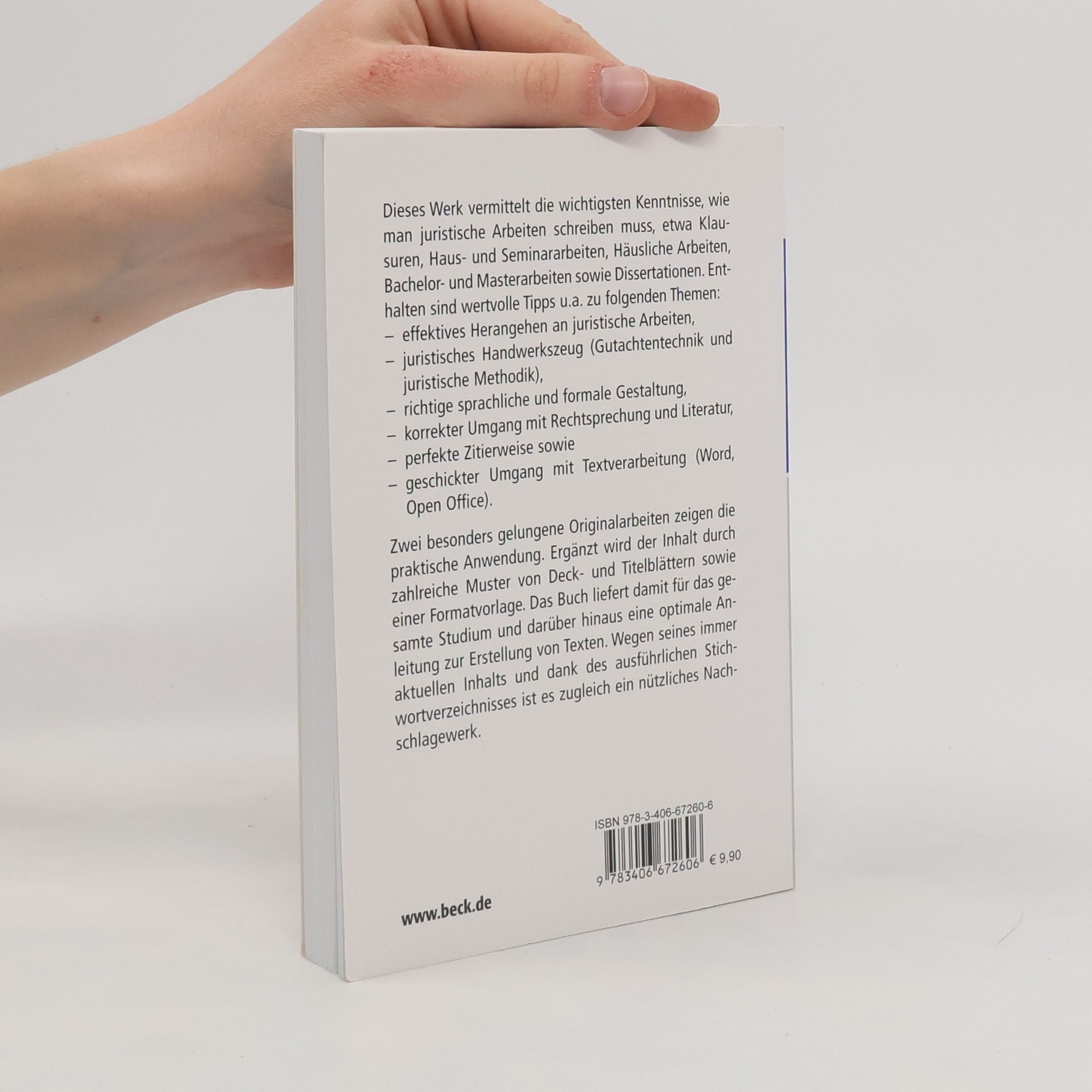 Dieses Werk vermittelt die essenziellen Kenntnisse zur Erstellung juristischer Arbeiten, einschließlich Klausuren und schriftlichen Arbeiten wie Hausarbeiten, Seminararbeiten, Dissertationen sowie Bachelor- und Masterarbeiten. Es bietet Empfehlungen für das Herangehen an schriftliche Arbeiten mit konkreten Arbeitsschritten und grundlegende Hinweise zur Sprache. Zudem enthält es eine umfassende Anleitung zur formalen Gestaltung, Hinweise zum Umgang mit Literatur und Rechtsprechung, insbesondere zur Zitierweise und zur Gestaltung von Fußnoten und Literaturverzeichnissen. Zwei komplette Musterarbeiten und zahlreiche Tipps für gängige Textverarbeitungsprogramme sind ebenfalls enthalten. Ergänzend werden Ratschläge zur Auswahl von Ausbildungsliteratur gegeben, sowie Vorlagen für Deck- und Titelblätter im Anhang bereitgestellt. Das Werk dient als Anleitungsbuch für die Erstellung von Texten während des gesamten Studiums und darüber hinaus. Die Neuauflage wurde inhaltlich und technisch aktualisiert und bietet nun Hinweise zur Umsetzung der Formalien unter Word 2013 und Open Office. Es richtet sich an alle, die schriftliche juristische Ausarbeitungen anfertigen wollen oder müssen, insbesondere an Studierende, Referendare, Doktoranden und Habilitanden.