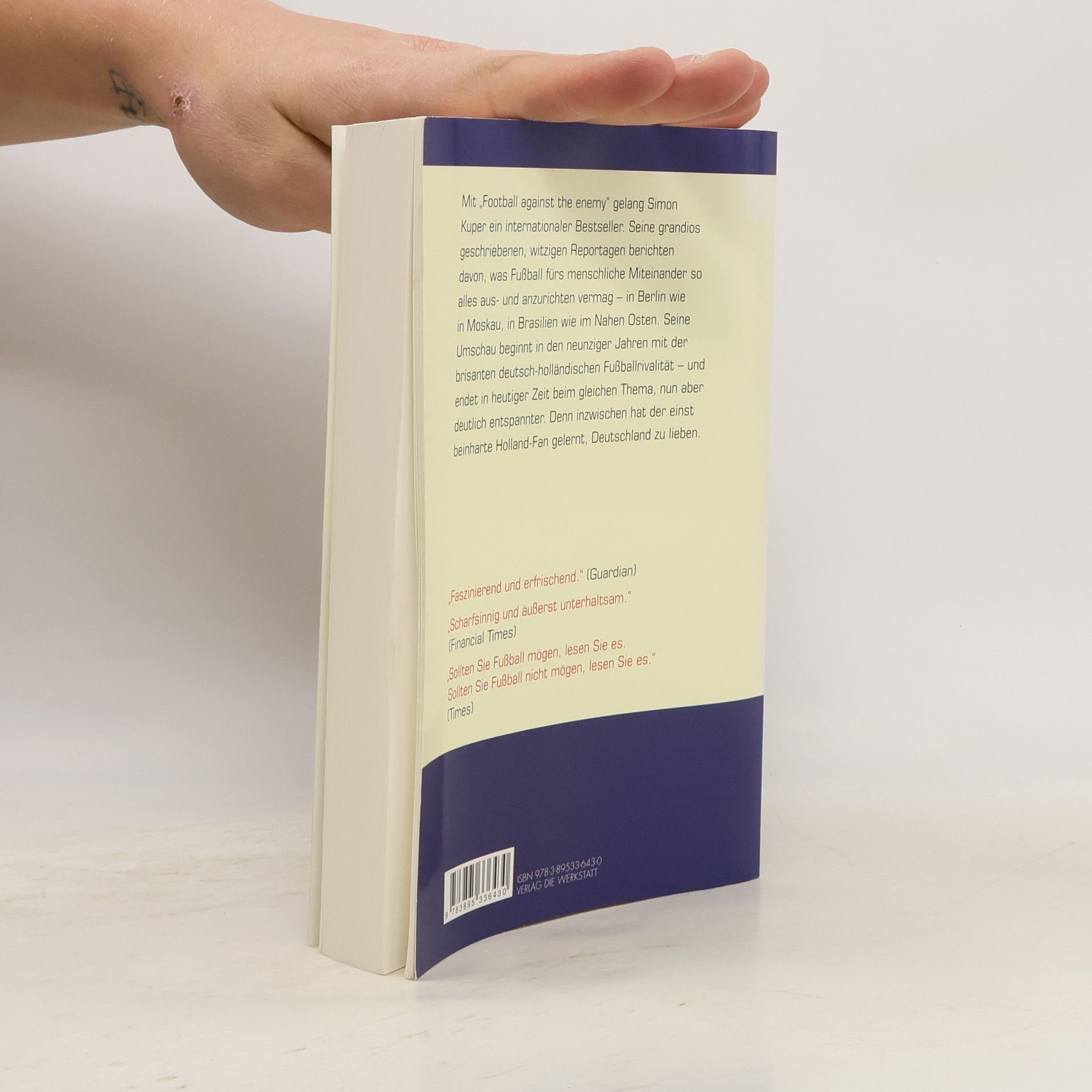 Das englische Fußballmagazin 'FourFourTwo' wählte es zum 'besten Fußballbuch aller Zeiten', und andere Kritiker waren nicht weniger euphorisch. 'Faszinierend und erfrischend' schwärmte der 'Guardian', 'scharfsinnig und äußerst unterhaltsam ' die 'Financial Times', 'überschäumend und witzig' der 'Independent', und die 'Times' riet: 'Sollten Sie Fußball mögen, lesen Sie es. Sollten Sie Fußball nicht mögen, lesen Sie es.' Simon Kuper gelang mit seinem 'Football against the enemy' ein ganz großer Wurf. Es wurde in mehrere Sprachen übersetzt – und erscheint in aktualisierter Fassung nun endlich auch auf Deutsch. Kuper bereist u. a. Berlin, Moskau, Brasilien, trifft interessante Protagonisten und lässt sich erzählen, was der Fußball fürs menschliche Miteinander so alles aus- und anzurichten vermag. Seine grandios geschriebenen, witzigen Reportagen beginnen in den neunziger Jahren mit der brisanten deutschholländischen Fußballrivalität – und enden 2008 beim gleichen Thema, nun aber deutlich entspannter. Denn inzwischen hat der einst beinharte Holland- Fan gelernt, Deutschland zu lieben.