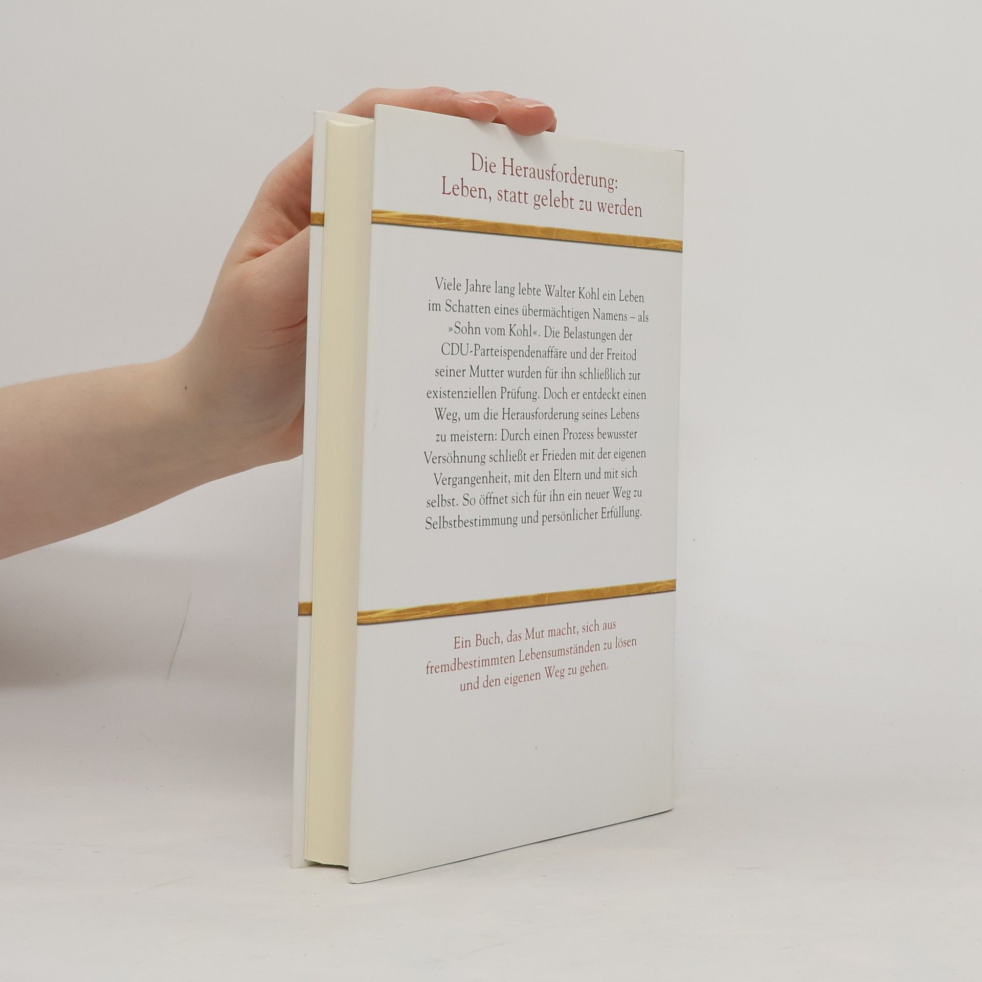 Die Herausforderung: leben, statt gelebt zu werden Viele Jahre lang lebte Walter Kohl ein Leben im Schatten eines übermächtigen Namens – als „Sohn vom Kohl“. Die Belastungen der CDU-Parteispendenaffäre und der Freitod seiner Mutter wurden für ihn schließlich zur existenziellen Prüfung. Doch er entdeckt einen Weg, um die Herausforderung seines Lebens zu meistern: Durch einen Prozess bewusster Versöhnung schließt er Frieden mit der eigenen Vergangenheit, mit den Eltern und mit sich selbst. So öffnet sich für ihn ein neuer Weg zu Selbstbestimmung und persönlicher Erfüllung. Ein Buch, das Mut macht, sich aus fremdbestimmten Lebensumständen zu lösen und den eigenen Weg zu gehen. Ausstattung: 8 Seiten Bildteil