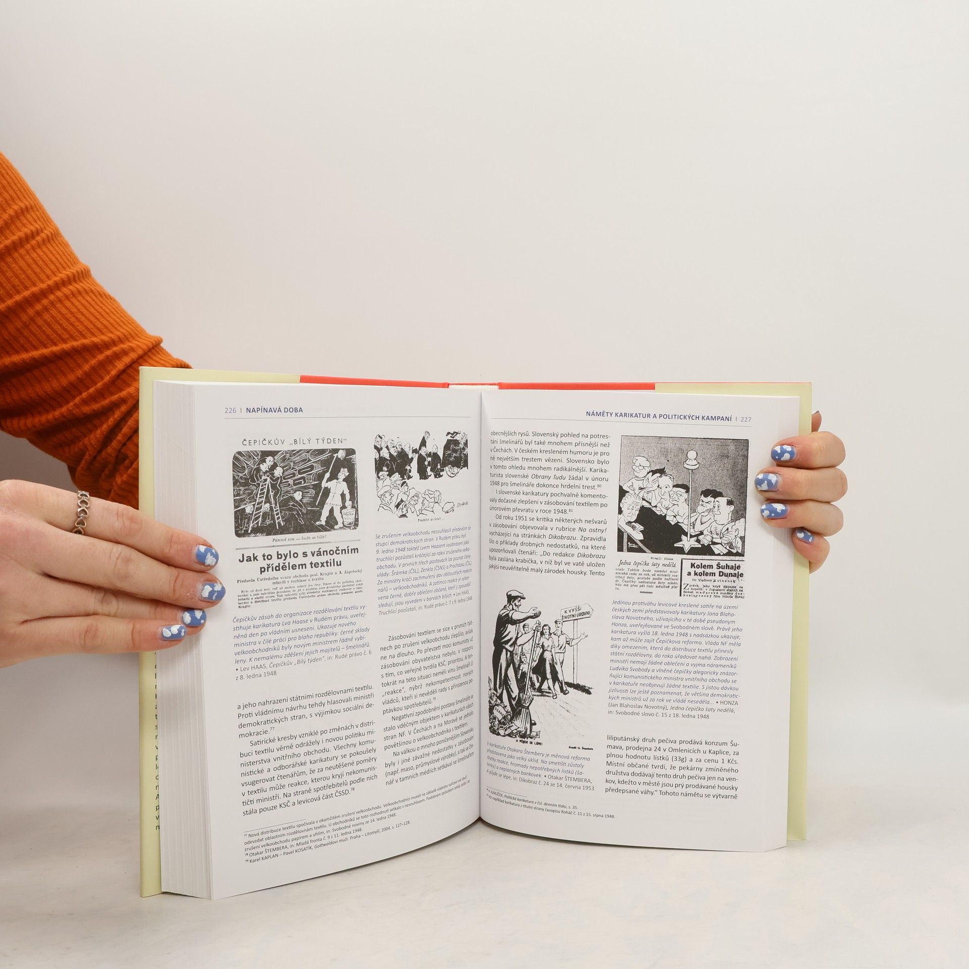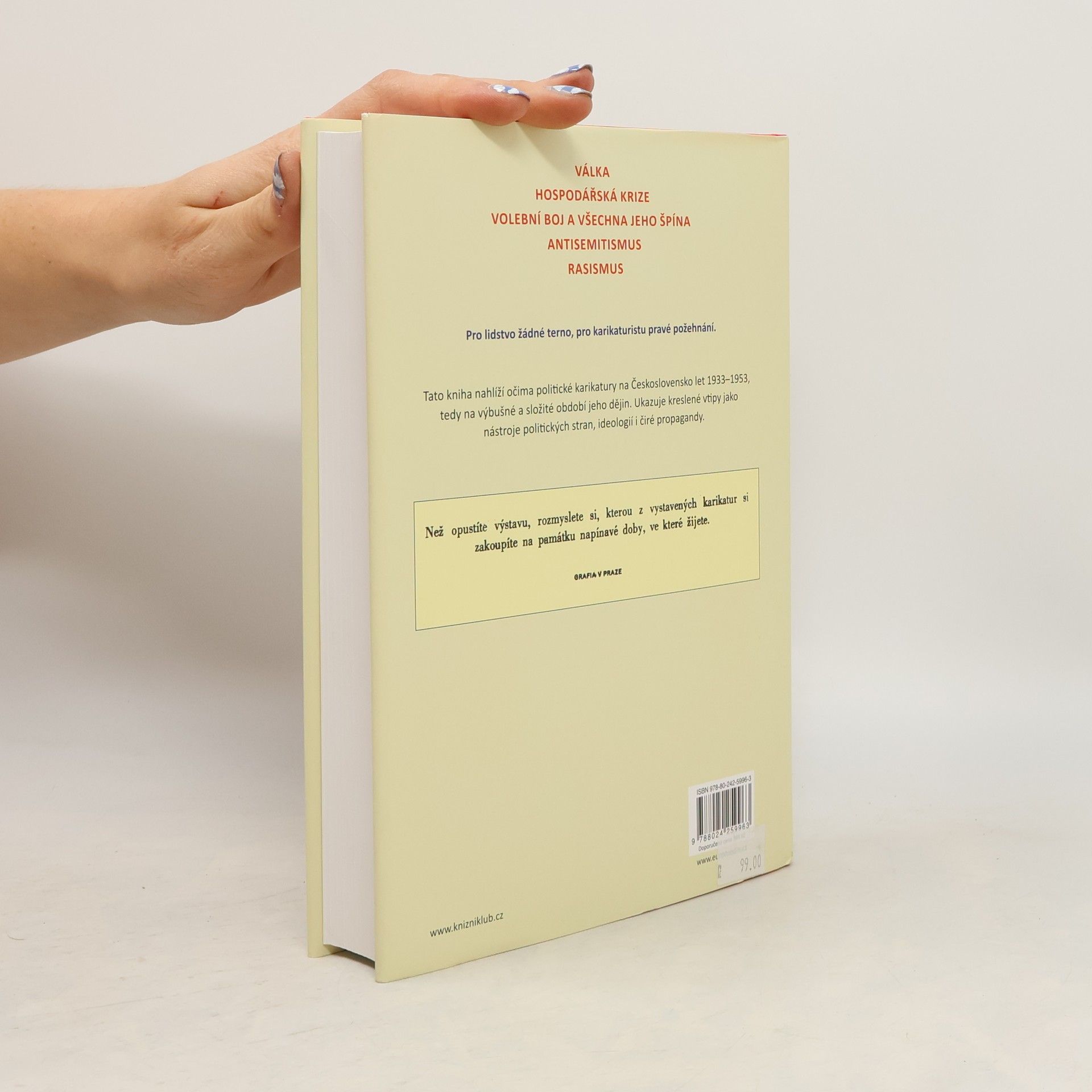 Politická karikatura je pozoruhodným zrcadlem společenských i historických událostí. Tato kniha mapuje velmi výbušné a složité období našich dějin z pohledu politické karikatury tak, jak vycházela v novinách či v humoristických časopisech. Zabývá se otázkami války a míru, volebním bojem v letech 1935–1954, antisemitismem a rasismem, obrazem hospodářské krize a nakonec se věnuje národnímu typu v humoru a kreslené satiře. Dokáže karikatury a satiru vystihnout ve všech jejích polohách: v úloze katalyzátoru obav a strachu, ale i nadějí, předsudků, stereotypů a mýtů. Ukazuje kreslené vtipy jako nástroje politických stran, ideologií i čiré propagandy. Postihuje jejich očistnou funkci při nastavování zrcadla lidské hlouposti, a zároveň poukazuje na jejich bídu, tupost a nízkost zvláště tam, kde je využíval vládnoucí totalitní režim.