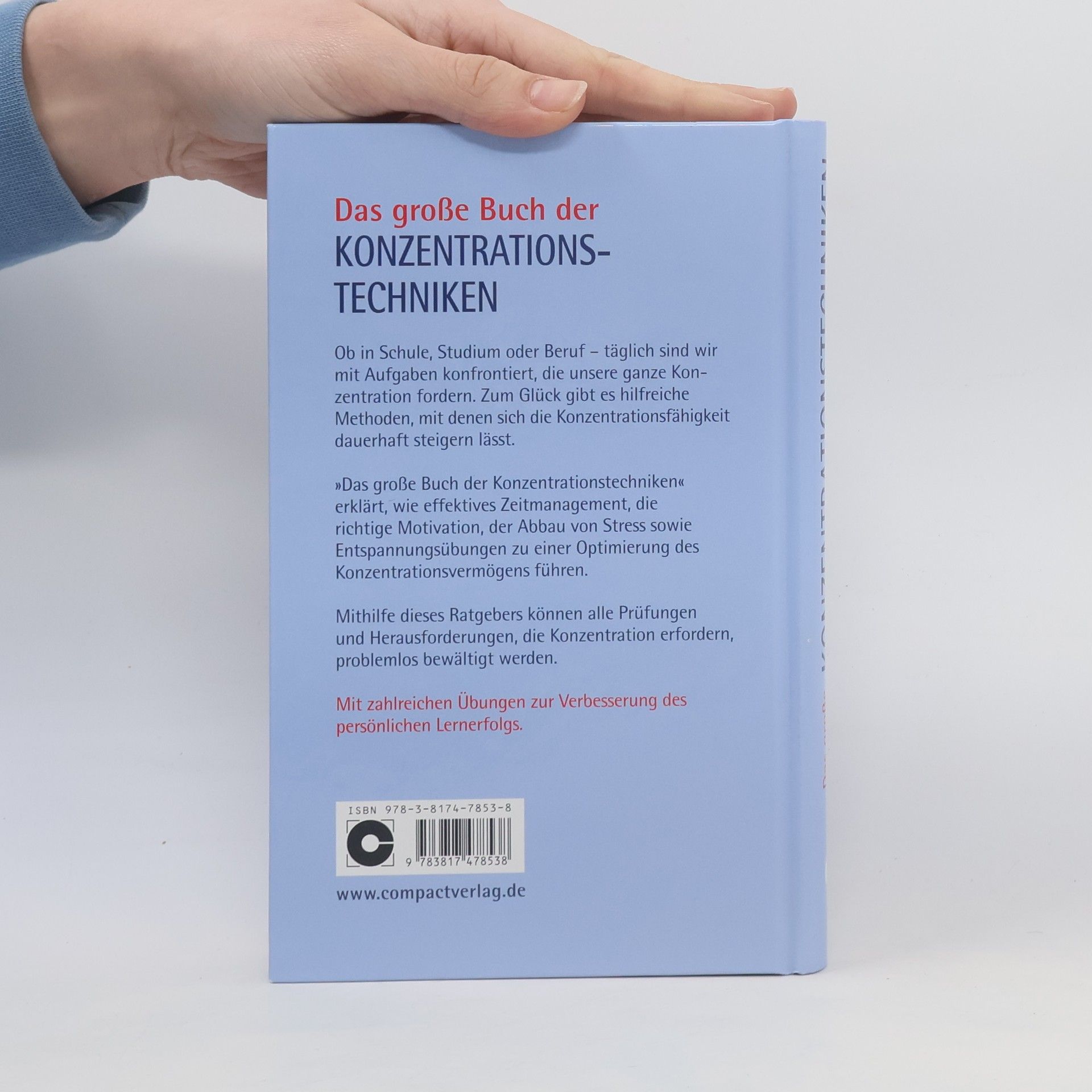 Konzentration ist der Schlüssel zu schulischem und beruflichem Erfolg. Das Große Buch der Konzentrationstechniken vom Compact Verlag bietet hilfreiche Methoden zur Steigerung der persönlichen Konzentrationsfähigkeit. Hier erfahren Sie, wie Sie mit effektivem Zeitmanagement, richtiger Motivation, Abbau von Stress und Entspannungsübungen Ihr Konzentrationsvermögen optimieren. Egal ob in Schule, Studium oder Beruf - mithilfe dieses Ratgebers bewältigen Sie die täglichen Herausforderungen spielend. - Tipps und Methoden für mehr Konzentration und Aufmerksamkeit - über 400 Übungen für das gezielte Training - Techniken zur Steigerung der Aufnahmefähigkeit - Entspannungsübungen für Stressphasen, Prüfungsangst und Nervosität - mit übersichtlichen Info- und Tippkästen - Für Schüler ab Sekundarstufe II, Studierende und Berufstätige