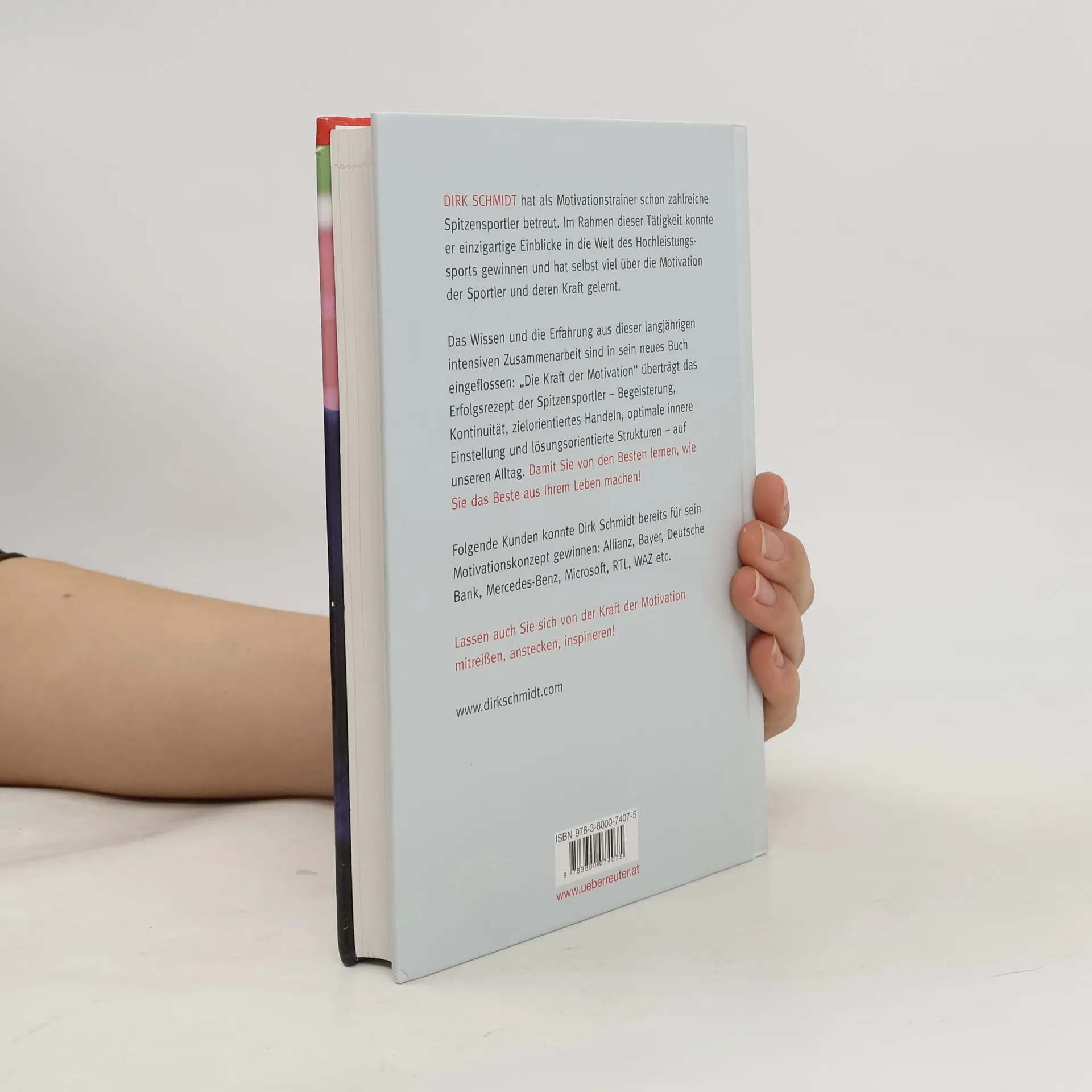 Dirk Schmidt hat als Motivationstrainer viele Spitzensportler betreut. Er hat dadurch einzigartige Einblicke in die Welt des Hochleistungssports erhalten und hat selbst viel von der Motivation der Sportler profitiert. All das Wissen und die Erfahrung dieser Zusammenarbeit sind in sein neues Buch eingeflossen: 'Die Kraft der Motivation' überträgt die Besonderheiten erfolgreicher Sportler – Beharrlichkeit, Kontinuität, Leidenschaft, zielorientiertes Handeln, klare Einstellung und klare Strukturen – auf unseren Alltag. Damit Sie von den Besten lernen können, um das Beste aus Ihrem Leben zu machen!