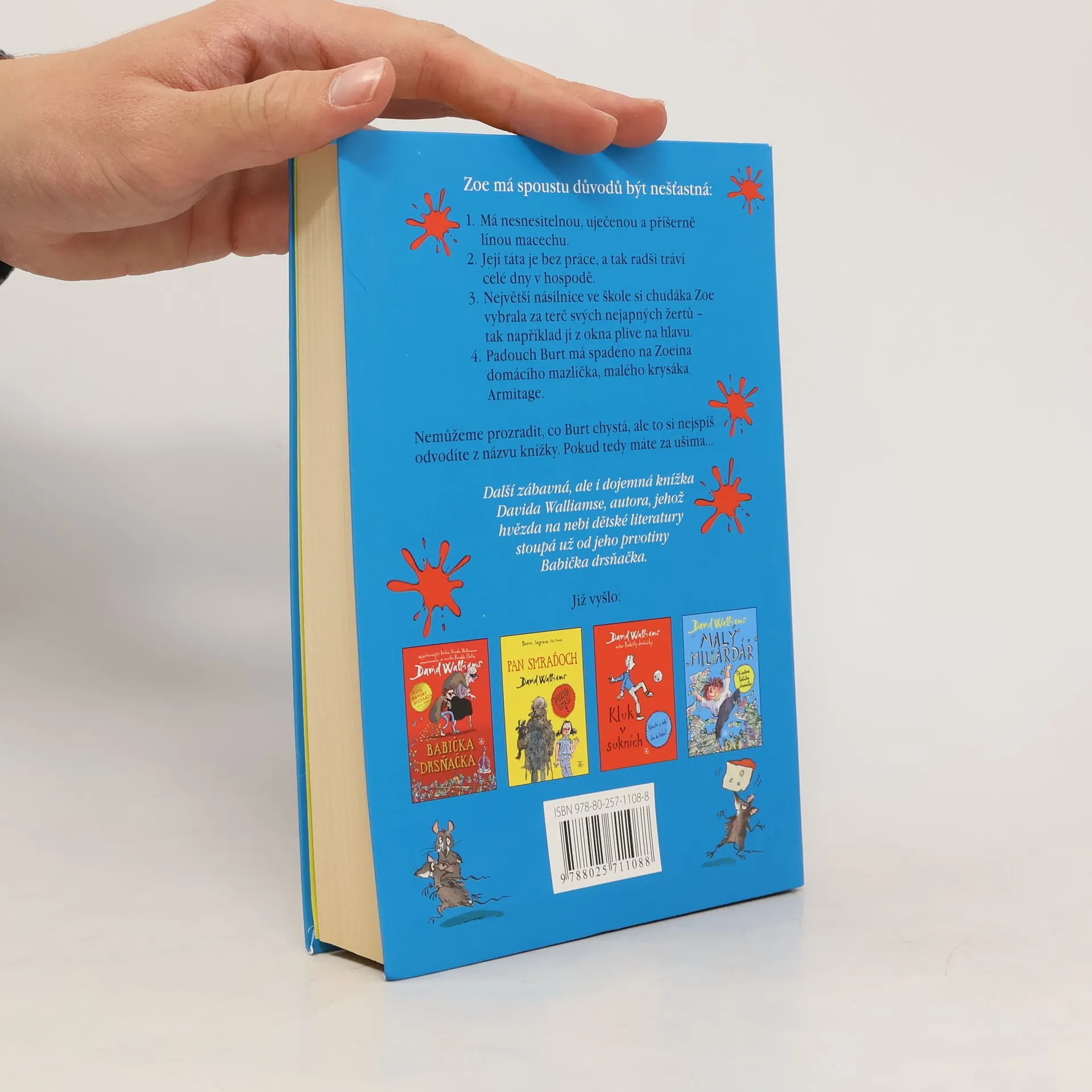 Další zábavná, ale i dojemná knížka Davida Walliamse, autora, jehož hvězda na nebi dětské literatury stoupá už od jeho prvotiny Babička drsňačka. Jak je u Walliamse obvyklé, nemají to jeho hrdinové v životě zrovna snadné. Ani Zoe není výjimkou. Její táta se po smrti Zoeiny mámy podruhé oženil, ale neměl v tomhle směru zrovna štěstí. Sheila je uječená a bezkonkurenčně nejlínější osoba pod sluncem, nebo aspoň v činžáku, kde rodina bydlí. Svoji nevlastní dceru bytostně nesnáší. A aby toho nebylo málo, největší násilnice ve škole si chudáka Zoe vybrala za terč svých nejapných žertů. Zoe se cítí osamělá a nešťastná. Proto se zaraduje, když jednoho dne do jejího pokoje zabloudí roztomilé krysí mládě – neděste se, může se to stát i v lepších rodinách. Holčička si ho rychle ochočí a začne ho učit cirkusovým kouskům. Na malého krysáka však číhá velké nebezpečí. Má na něj spadeno majitel firmy na výrobu... Čeho? To si snadno odvodíte z názvu knížky. První vydání.