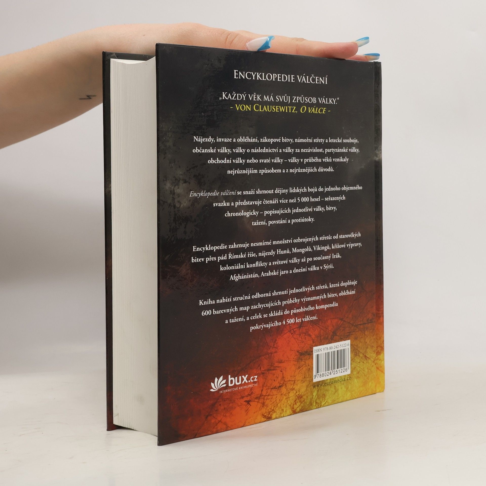 Věcná, textově bohatá encyklopedie válek, od starověku přes nájezdy, invaze a obléhání, zákopové války, námořní bitvy a letecké souboje, občanské války, guerrilové války, obchodní války a jadernou válku, náboženské války, války o následnictví či nezávislost. Obsahuje víc než 5 000 chronologicky řazených hesel o válkách, bitvách, ofenzivách, taženích, povstáních a protireakcích. 600 barevných map. Odráží současné studie vojenských historiků a je přístupná jak studentům, tak obecné veřejnosti. Kompendium téměř pěti tisíc let válčení.