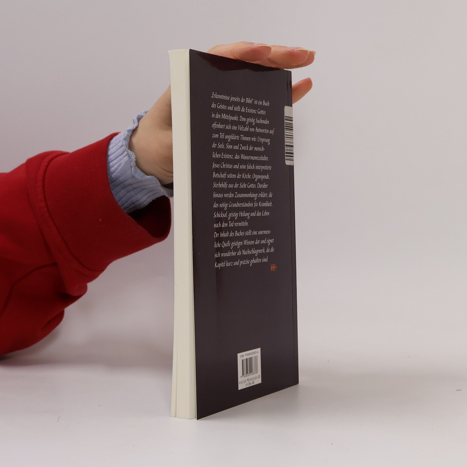 „Erkenntnisse jenseits der Bibel” ist ein Buch des Geistes und stellt die Existenz Gottes in den Mittelpunkt. Dem geistig Suchenden offenbart sich eine Vielzahl von Antworten auf zum Teil ungeklärte Themen wie: Ursprung der Seele, Sinn und Zweck der menschlichen Existenz, das Wassermannzeitalter, Jesus Christus und seine falsch interpretierte Botschaft seitens der Kirche, Organspende, Sterbehilfe aus der Sicht Gottes. Darüber hinaus werden Zusammenhänge erklärt, die das nötige Grundverständnis für Krankheit, Schicksal, geistige Heilung und das Leben nach dem Tod vermitteln. Der Inhalt des Buches stellt eine unermessliche Quelle geistigen Wissens dar und eignet sich wunderbar als Nachschlagewerk, da die Kapitel kurz und präzise gehalten sind.