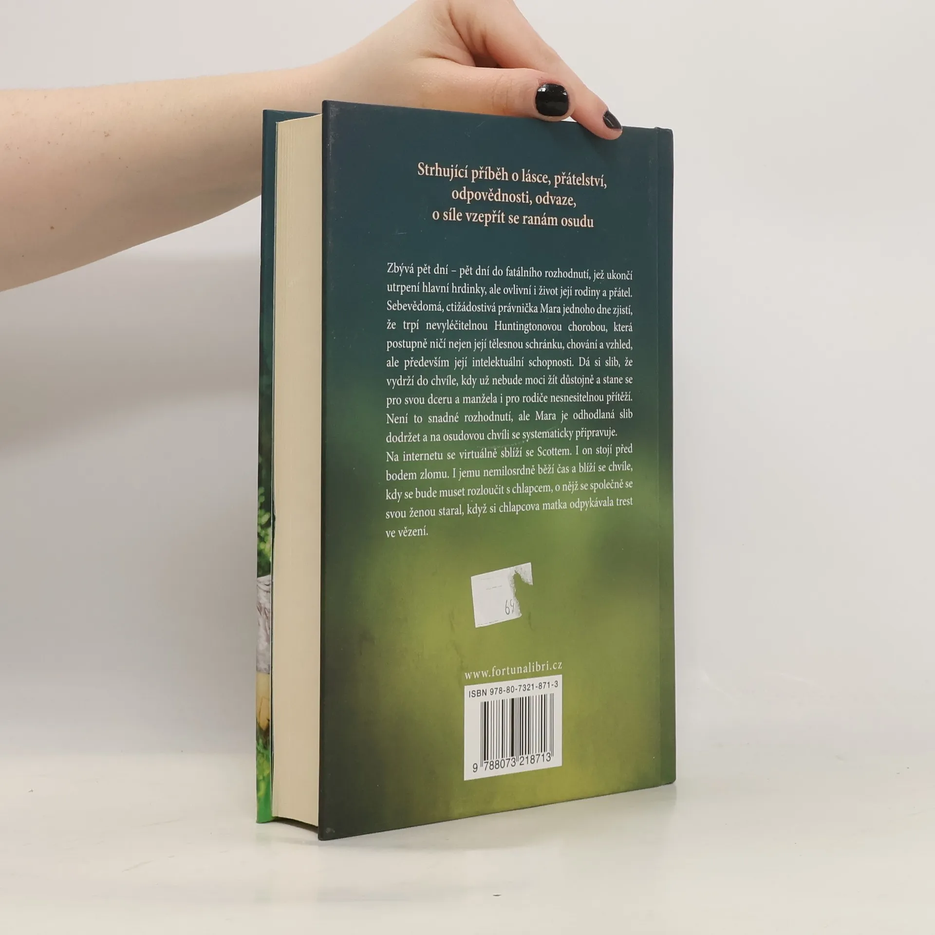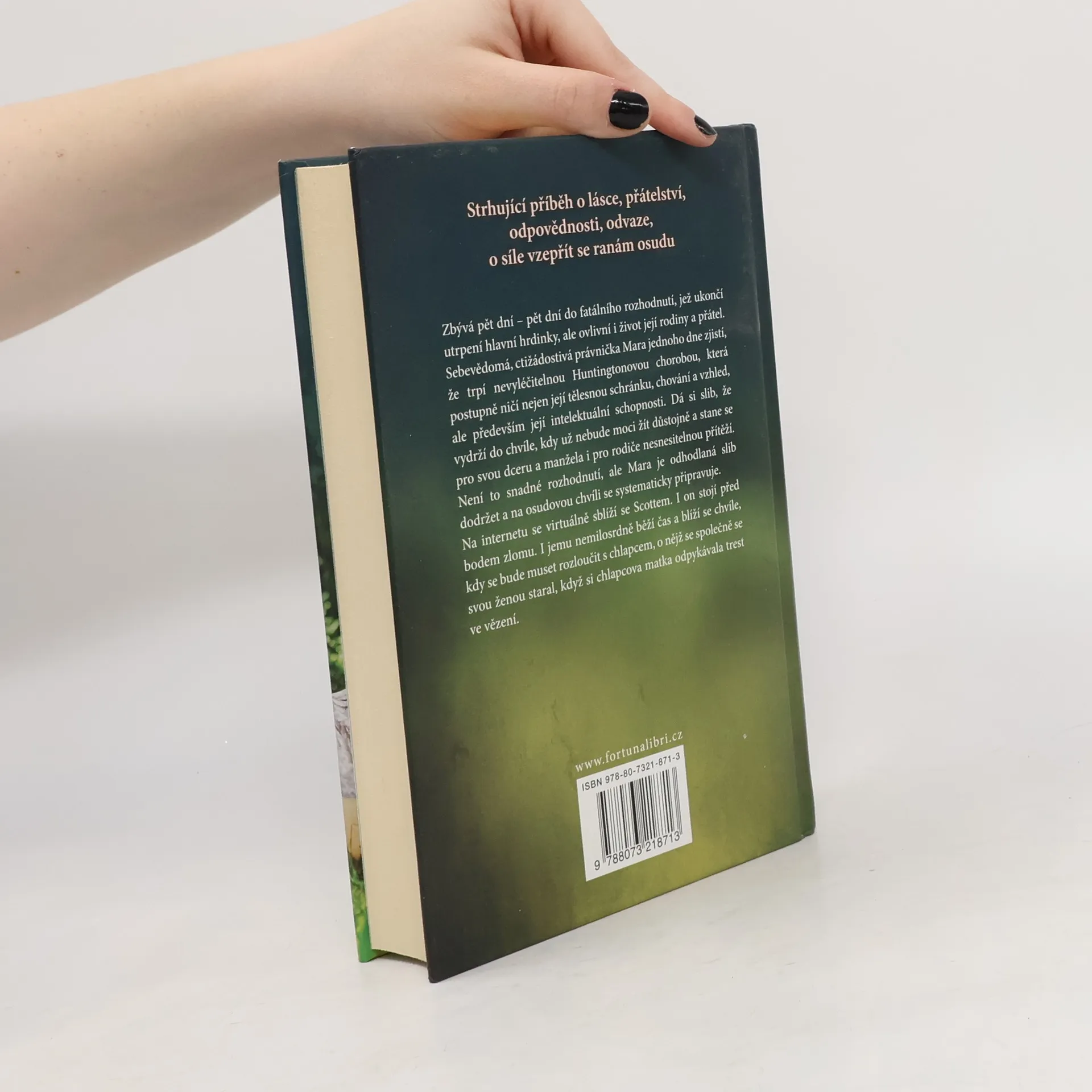 Strhující příběh o lásce, přátelství, odpovědnosti, odvaze, o síle vzepřít se ranám osudu. Zbývá pět dní - pět dní do fatálního rozhodnutí, jež ukončí utrpení hlavní hrdinky, ale ovlivní i život její rodiny a přátel. Sebevědomá, ctižádostivá právnička Mara jednoho dne zjistí, že trpí nevyléčitelnou Huntingtonovou chorobou, která postupně ničí nejen její tělesnou schránku, chování a vzhled, ale především její intelektuální schopnosti. Dá si slib, že vydrží do chvíle, kdy už nebude moci žít důstojně a stane se pro svou dceru a manžela i pro rodiče nesnesitelnou přítěží. Není to snadné rozhodnutí, ale Mara je odhodlaná slib dodržet a na osudovou chvíli se systematicky připravuje. Na internetu se virtuálně sblíží se Scottem. I on stojí před bodem zlomu. I jemu nemilosrdně běží čas a blíží se chvíle, kdy se bude muset rozloučit s chlapcem, o nějž se společně se svou ženou staral, když si chlapcova matka odpykávala trest ve vězení.