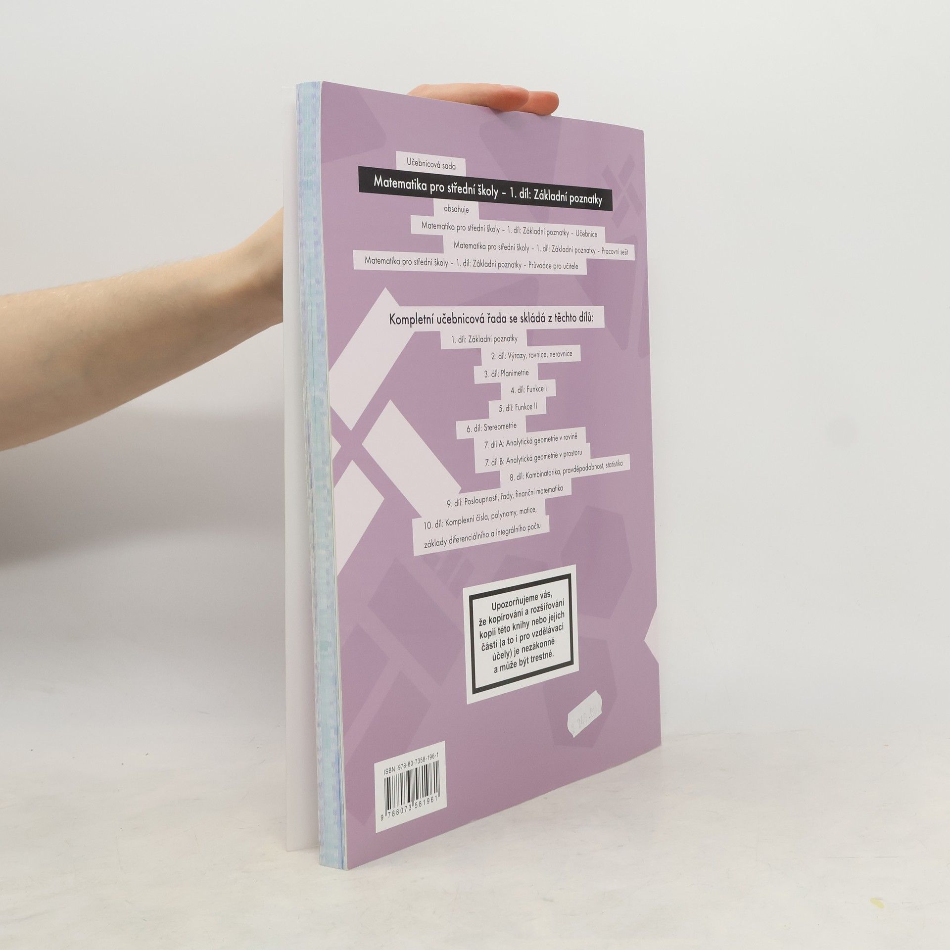 Přehledně, moderně a pro studenty přístupně zpracovaná učebnice vnáší nové možnosti do výuky matematiky na středních školách. Obsah první části zahrnuje základní poznatky o číselných oborech, výrokové logice a teorii množin. Učivo je srozumitelně a strukturovaně podáno ve výkladové části učebnice a je doplněno jednoduchými řešenými příklady.
