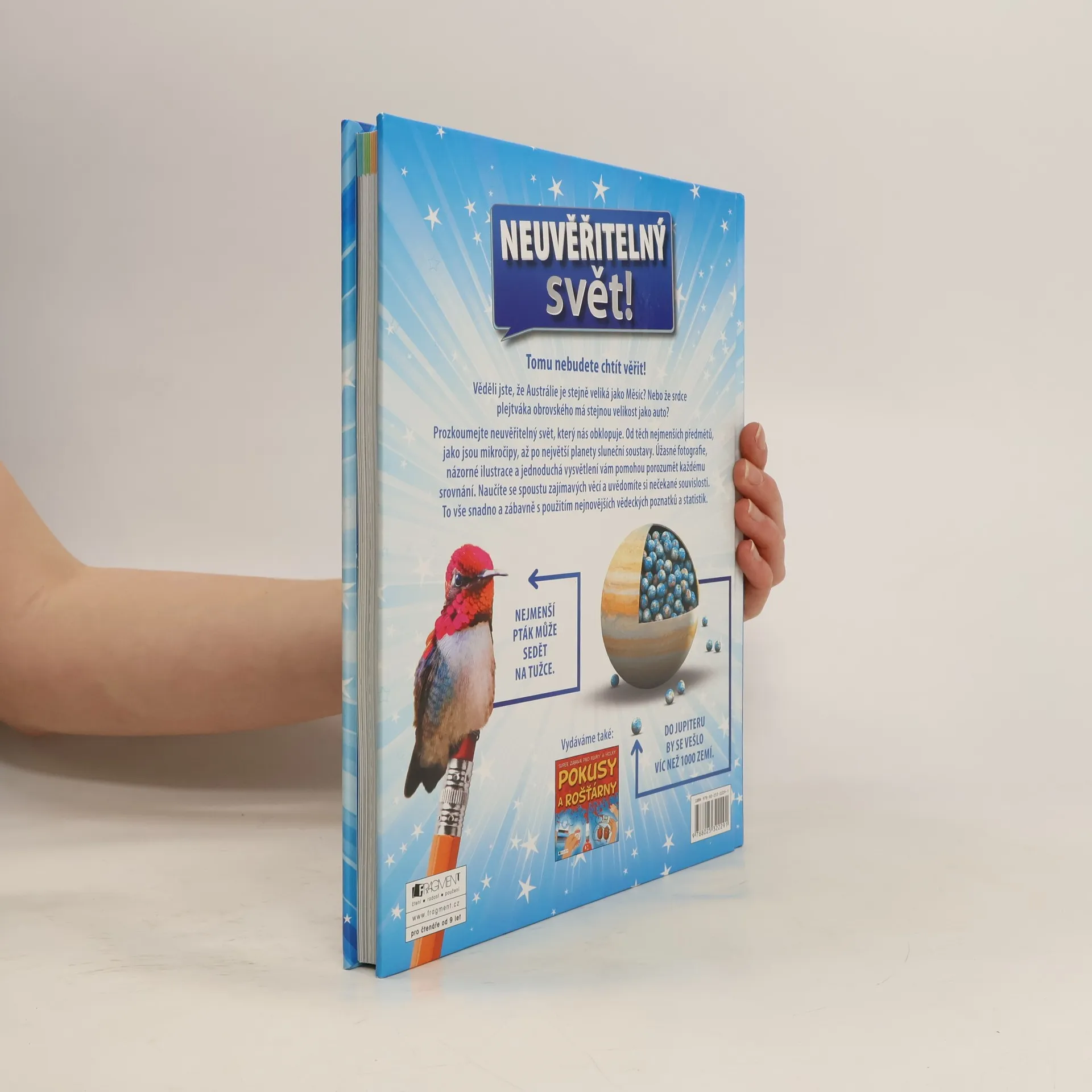 podnázev: ohromující obrazová srovnání. Tomu nebudete chtít věřit! Věděli jste, že Austrálie je stejně veliká jako Měsíc? Nebo že srdce plejtváka obrovského má stejnou velikost jako auto? Prozkoumejte neuvěřitelný svět, který nás obklopuje. Od těch nejmenších předmětů, jako jsou mikročipy, až po největší planety sluneční soustavy. Úžasné fotografie, názorné ilustrace a jednoduchá vysvětlení vám pomohou porozumět každému srovnání. Naučíte se spoustu zajímavých věcí a uvědomíte si nečekané souvislosti.