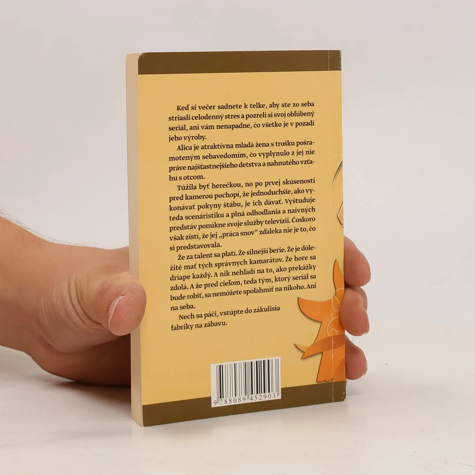 Šokujúci román zo zákulisia tvorby televíznych seriálov. Keď si večer sadnete k telke, aby ste zo seba striasli celodenný stres a pozreli si svoj obľúbený seriál, ani vás nenapadne, čo všetko je v pozadí jeho výroby. Alica je atraktívna mladá žena, s trošku pošramoteným sebavedomím, čo vyplynulo z jej nie práve najšťastnejšieho detstva a nahnutého vzťahu s otcom. Túžila byť herečkou, no po prvej skúsenosti pred kamerou pochopí, že jednoduchšie, ako vykonávať pokyny štábu, je ich dávať. Vyštuduje teda scenáristiku a plná odhodlania a naivných predstáv ponúkne svoje služby televízii. Čoskoro však zistí, že jej „práca snov“ zďaleka nie je to, čo si predstavovala. Že za talent sa platí. Že silnejší berie. Že je dôležité mať tých správnych kamarátov. Že hore sa driape každý. A nik nehľadí na to, ako prekážky zdolá. A že pred cieľom, teda tým, ktorý seriál sa bude robiť, sa nemôžete spoľahnúť na nikoho. Ani na seba.
