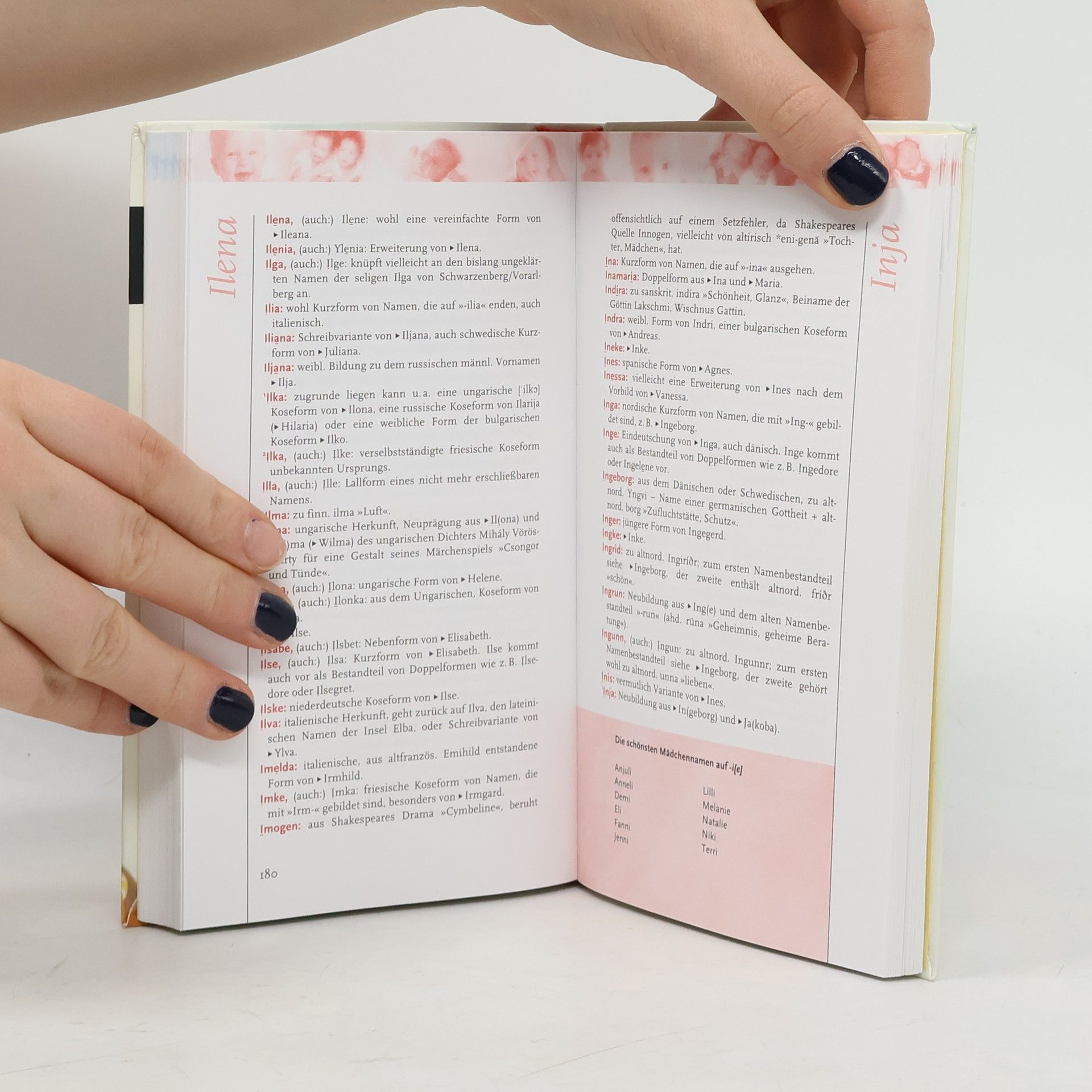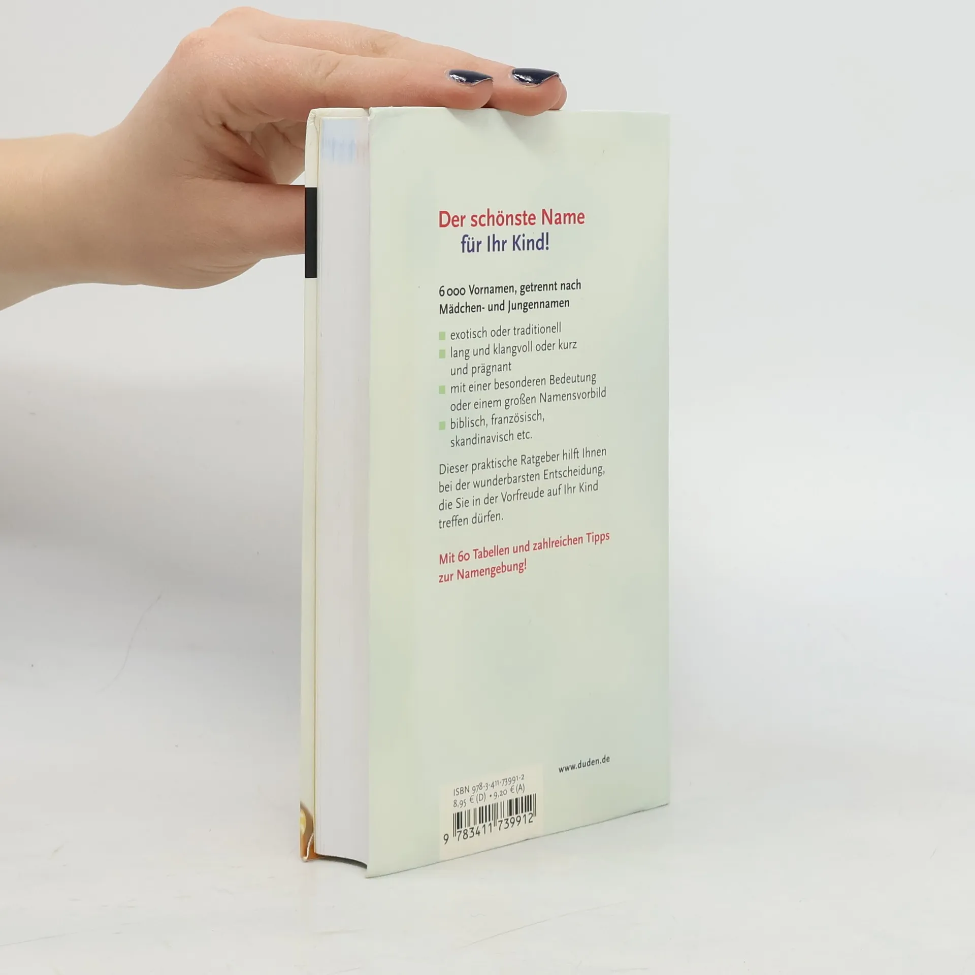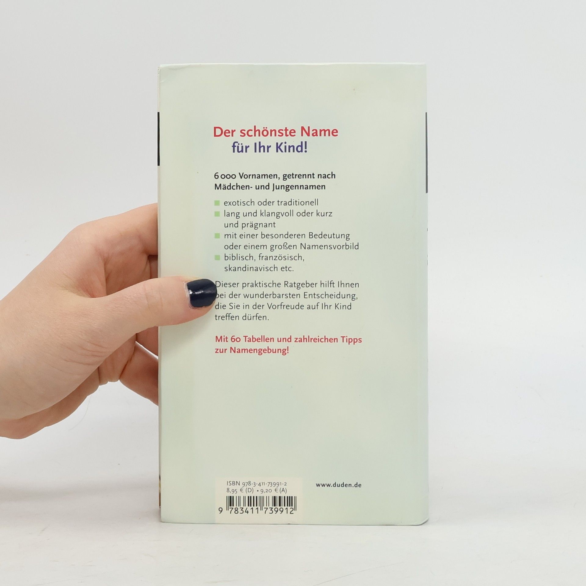 Dieser praktische Ratgeber hilft bei der Namensuche. Rund 6.000 Vornamen werden mit einer kurzen und prägnanten Herkunftsangabe vorgestellt. Mit zahlreichen Tipps zur Namengebung und Tabellen als Findehilfen, z. B. „Die schönsten Namen aus der Bibel“, „Namen auf -ian“ oder „Die schönsten Blumennamen“.