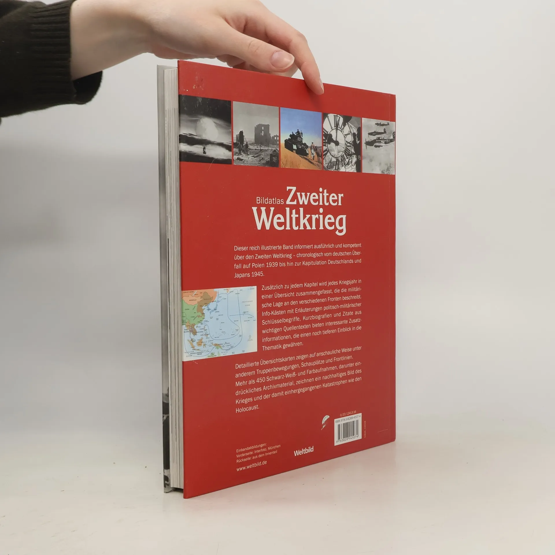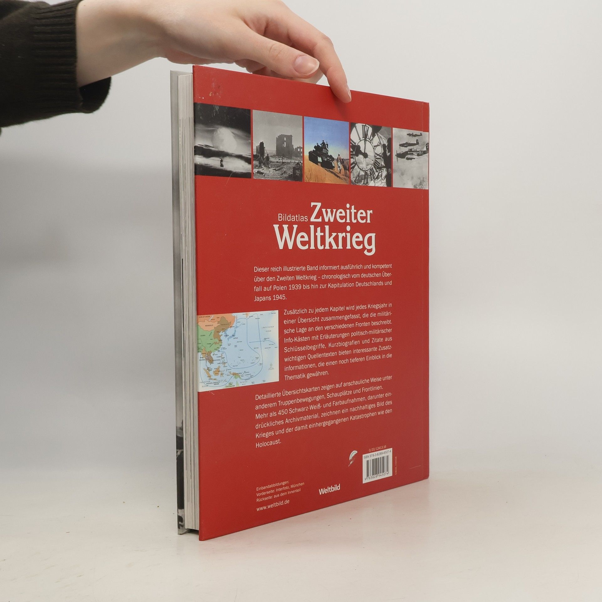 Der Zweite Weltkrieg in Karten und BildernDieser reich illustrierte Band informiert ausführlich und kompetent über den Zweiten Weltkrieg - chronologisch vom deutschen Überfall auf Polen 1939 bis hin zur Kapitulation Deutschlands und Japans 1945. Zusätzlich zu jedem Kapitel wird jedes Kriegsjahr in einer Übersicht zusammengefasst, die die militärische Lage an den verschiedenen Fronten beschreibt. Info-Kästen mit Erläuterungen politisch-militärischer Schlüsselbegriffe, Kurzbiografien und Zitaten aus wichtigen Quellentexten bieten interessante Zusatzinformationen, die einen noch tieferen Einblick in die Thematik gewähren.Detaillierte Übersichtskarten zeigen auf anschauliche Weise unter anderem Truppenbewegungen, Schauplätze und Frontlinien.Mehr als 450 Schwarz-Weiß- und Farbaufnahmen, darunter eindrückliches Archivmaterial, zeichnen ein nachhaltiges Bild des Krieges und der damit einhergegangenen Katastrophen wie den Holocaust.