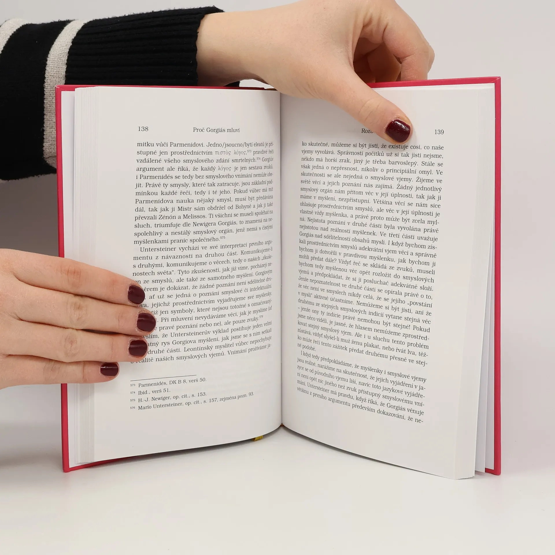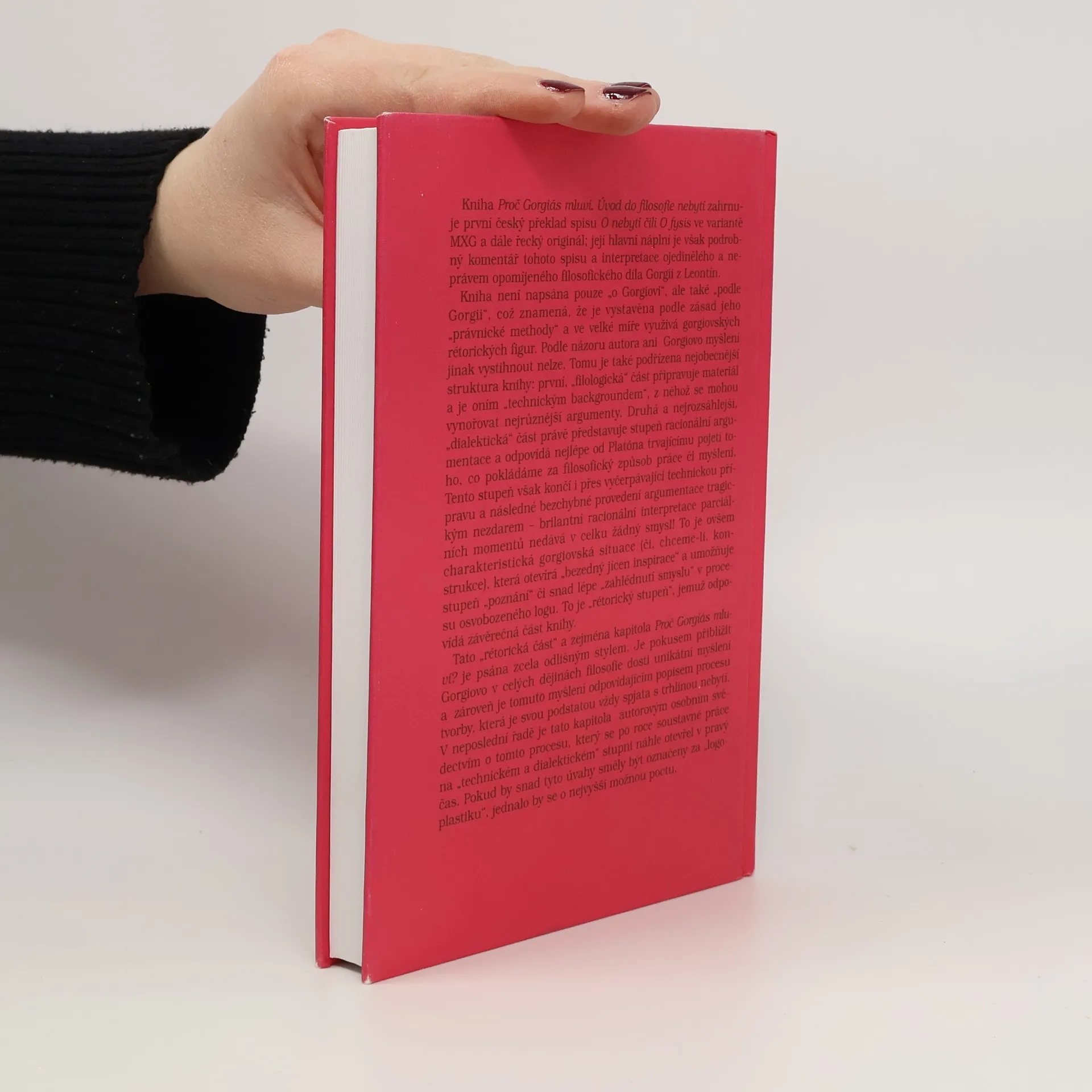 Kniha zahrnuje první český překlad spisu „O nebytí čili O fysis“ ve variantě MXG a dále řecký originál; její hlavní náplní je však podrobný komentář tohoto spisu a interpretace ojedinělého a neprávem opomíjeného filosofického díla Gorgii z Leontín. Výsledkem je obraz spisu jako pozoruhodného polemického díla na špičce dobové filosofie. První, „filologická část“, připravuje materiál a je oním „technickým backgroundem“, z něhož se mohou vynořovat nejrůznější argumenty. Druhá a nejrozsáhlejší, „dialektická část“, představuje stupeň racionální argumentace a odpovídá nejlépe od Platóna trvajícímu pojetí toho, co pokládáme za filosofický způsob práce či myšlení. „Rétorický stupeň“, jemuž odpovídá závěrečná část knihy, otevírá gorgiovský „bezedný jícen inspirace“ a umožňuje stupeň „poznání“ či snad lépe „zahlédnutí smyslu“ v procesu osvobozeného logu.