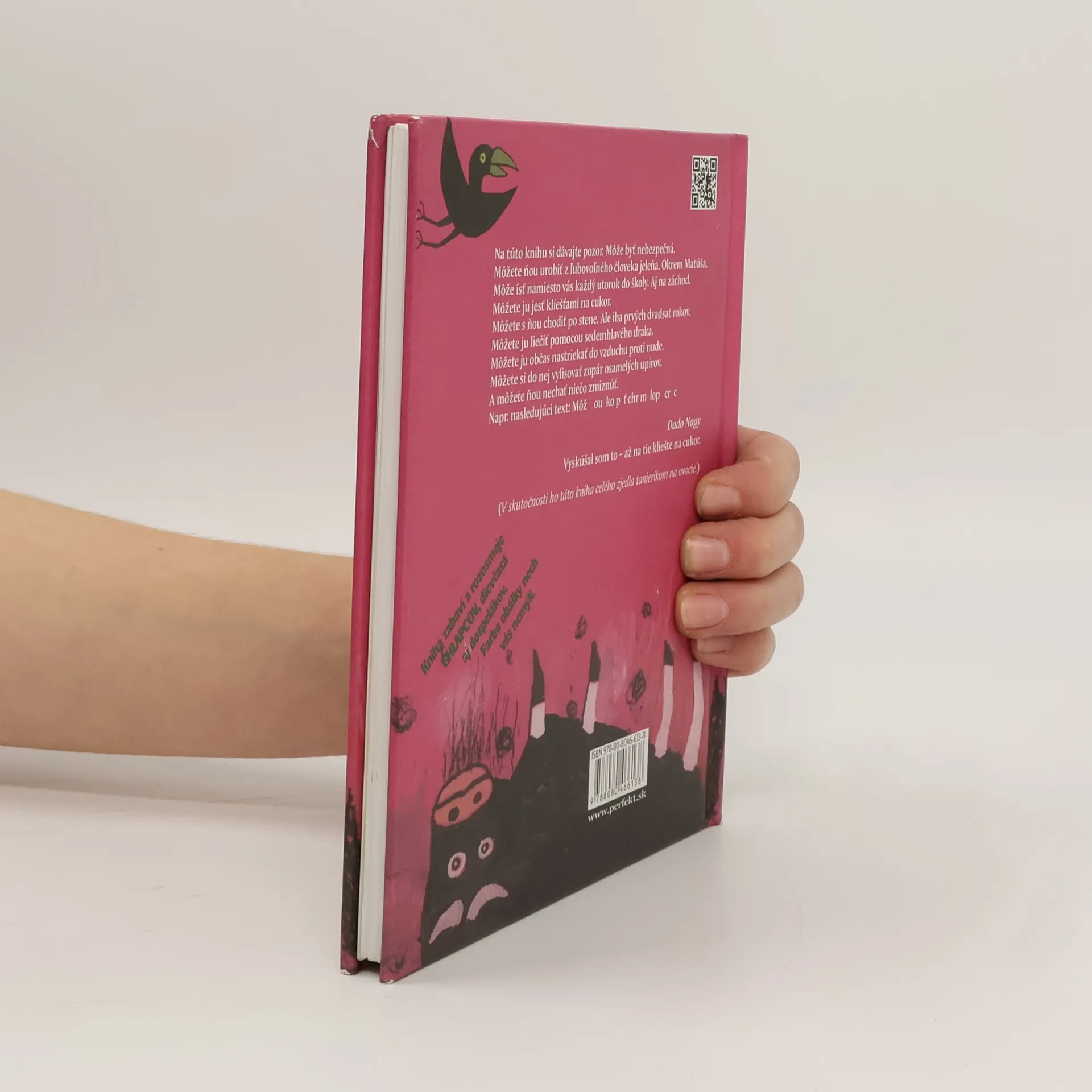 Na túto knihu si dávajte pozor. Môže byť nebezpečná. Môžete ňou urobiť z ľubovoľného človeka jeleňa. Okrem Matúša. Môže ísť namiesto vás každý utorok do školy. Aj na záchod. Môžete ju jesť kliešťami na cukor. Môžete s ňou chodiť po stene. Ale iba prvých dvadsať rokov. Môžete ju liečiť pomocou sedemhlavého draka. Môžete ju občas nastriekať do vzduchu proti nude. Môžete si do nej vylisovať zopár osamelých upírov. A môžete ňou nechať niečo zmiznúť. Napr. nasledujúci text : Môž ou ko p ť chr m lop cr c.