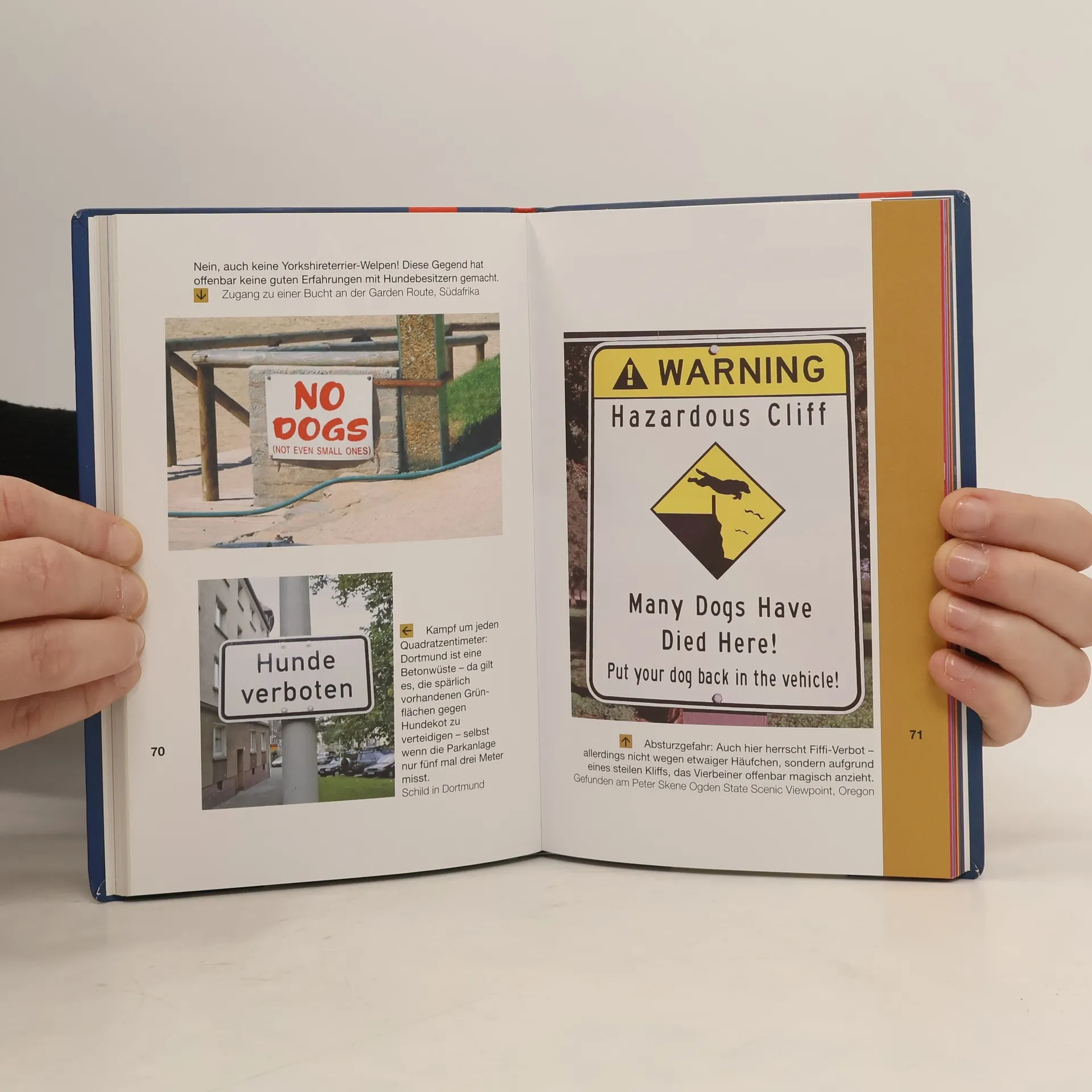 Geplant war das nicht: Spiegel online wollte nur einige skurrile Verkehrsschilder vorstellen, doch die Veröffentlichung führte zu einer Flut von Einsendungen. Die Kolumne Schräge Schilder entwickelte sich zur beliebtesten Bildkolumne des Online-Portals. Ungewöhnliche Herausforderungen für Verkehrsteilnehmer sind überall zu finden: Wo parken, wenn auf dem gesamten Parkplatz Halten verboten ist? Wo Kinder spielen lassen, wenn auf dem Spielplatz Spielen untersagt ist? In welche Richtung fahren, wenn in einer Einbahnstraße beide Richtungen empfohlen werden? Die Autofahrer scheinen nicht ganz unschuldig am Chaos – viele drastische Schilder sprechen für sich: „Denken Sie nicht einmal darüber nach, hier zu parken!“ oder „Für Autofahrer, die nur Singen & Klatschen in der Schule hatten: Dies ist eine Einfahrt!“. Die Gefahr durch Tiere im Straßenverkehr wird oft unterschätzt: In Wuppertal warnt ein Schild vor herabfallenden Elefanten, in Südafrika vor zu Fuß gehenden Eulen und in der Schweiz vor Kühen, die Kleidung fressen. Manchmal sind Tiere selbst die Adressaten: In Luzern wird Giraffen dringend geraten, das Parkhaus zu meiden. Thomas Hillenbrand hat die besten Einsendungen ausgewählt und kommentiert. Die Bilder am Straßenrand zeigen auf humorvolle Weise, was die Welt wirklich bewegt.