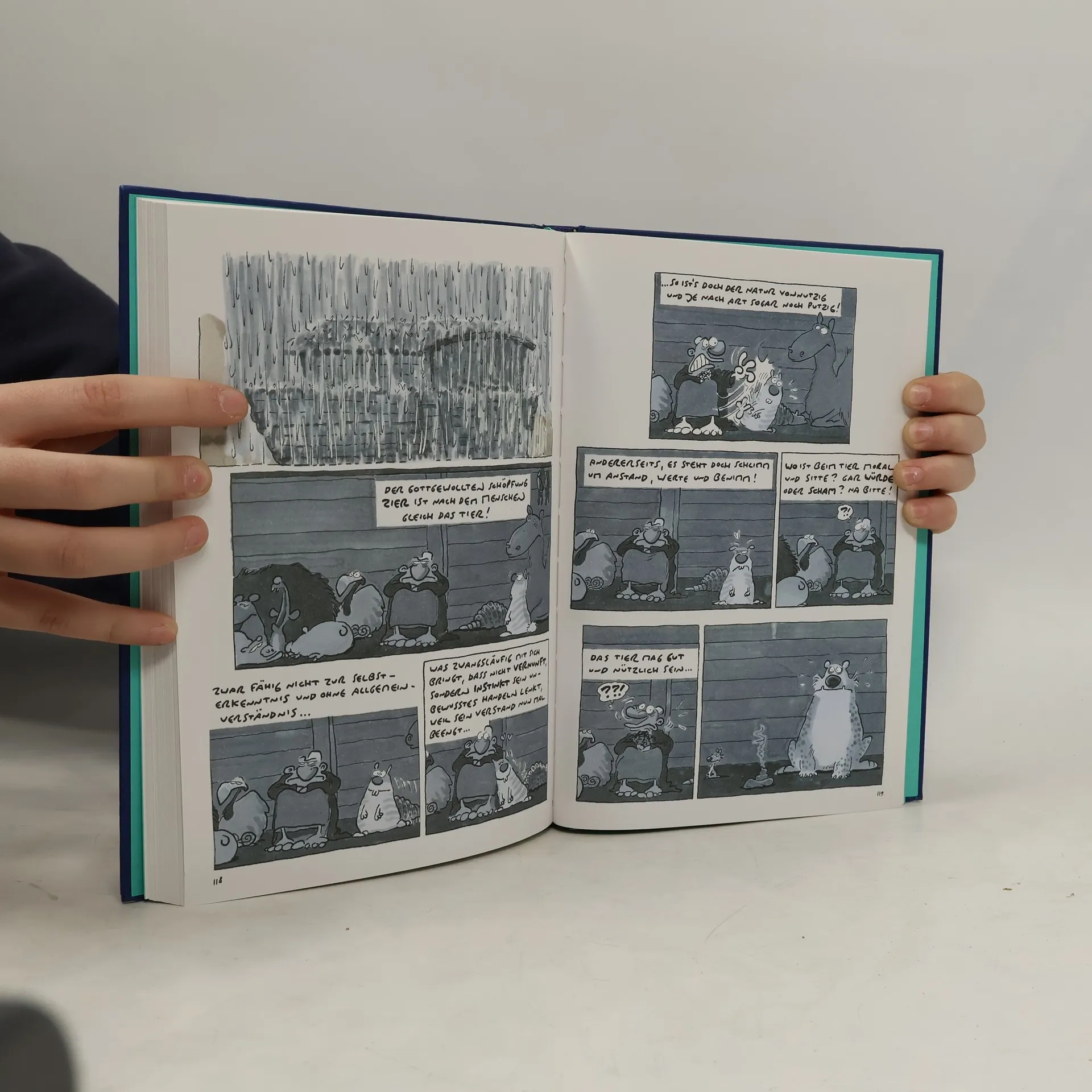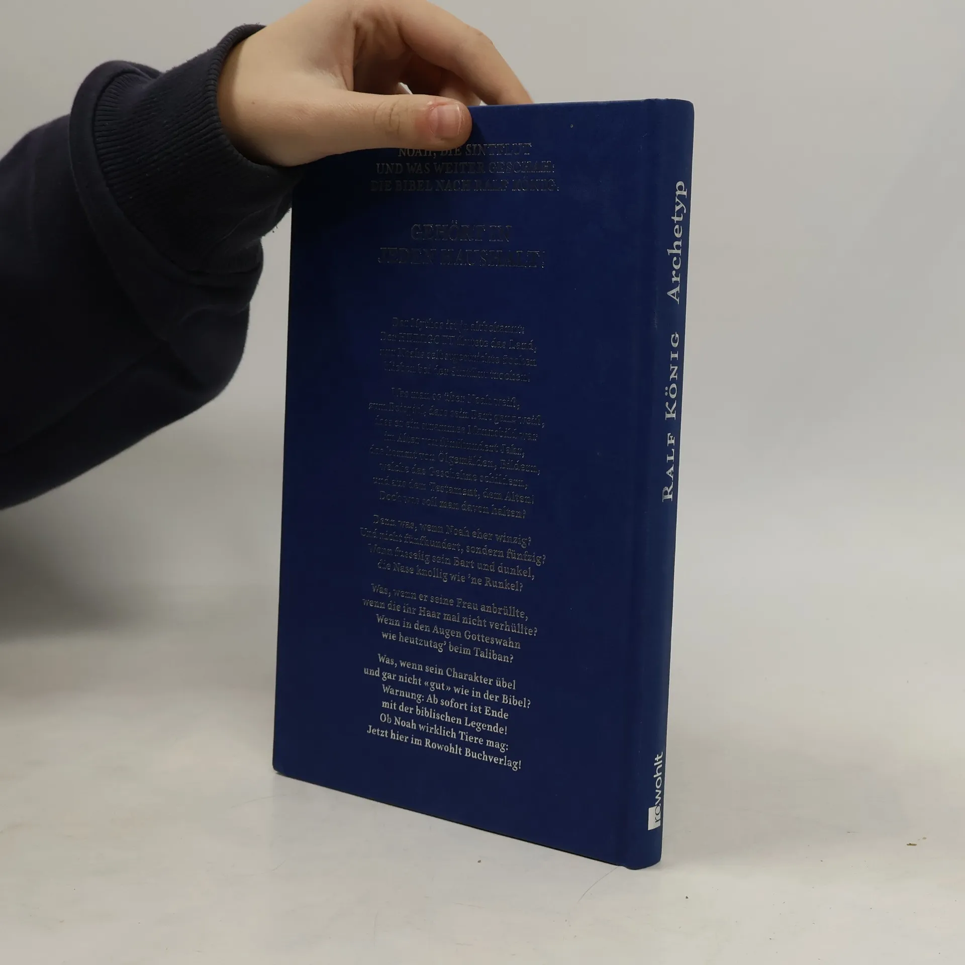 Noah, die Sintflut und was weiter geschah: Die Bibel nach Ralf König. Gehört in jeden Haushalt! Der Mythos ist ja altbekannt: Der HERRGOTT flutete das Land, nur Noahs selbstgestrickte Socken blieben bei der Sintflut trocken! Was man so über Noah weiß, zum Beispiel, dass sein Bart ganz weiß, dass er ein strammes Mannsbild war im Alter von fünfhundert Jahr, das kommt von Ölgemälden, Bildern, welche das Geschehne schildern, und aus dem Testament, dem Alten! Doch was soll man davon halten? Denn was, wenn Noah eher winzig? Und nicht fünfhundert, sondern fünfzig? Wenn fusselig sein Bart und dunkel, die Nase knollig wie ’ne Runkel? Was, wenn er seine Frau anbrüllte, wenn die ihr Haar mal nicht verhüllte? Wenn in den Augen Gotteswahn, wie heutzutag’ beim Taliban? Was, wenn sein Charakter übel und gar nicht « gut » wie in der Bibel? Warnung: Ab sofort ist Ende mit der biblischen Legende! Ob Noah wirklich Tiere mag: Jetzt hier im Rowohlt Buchverlag!