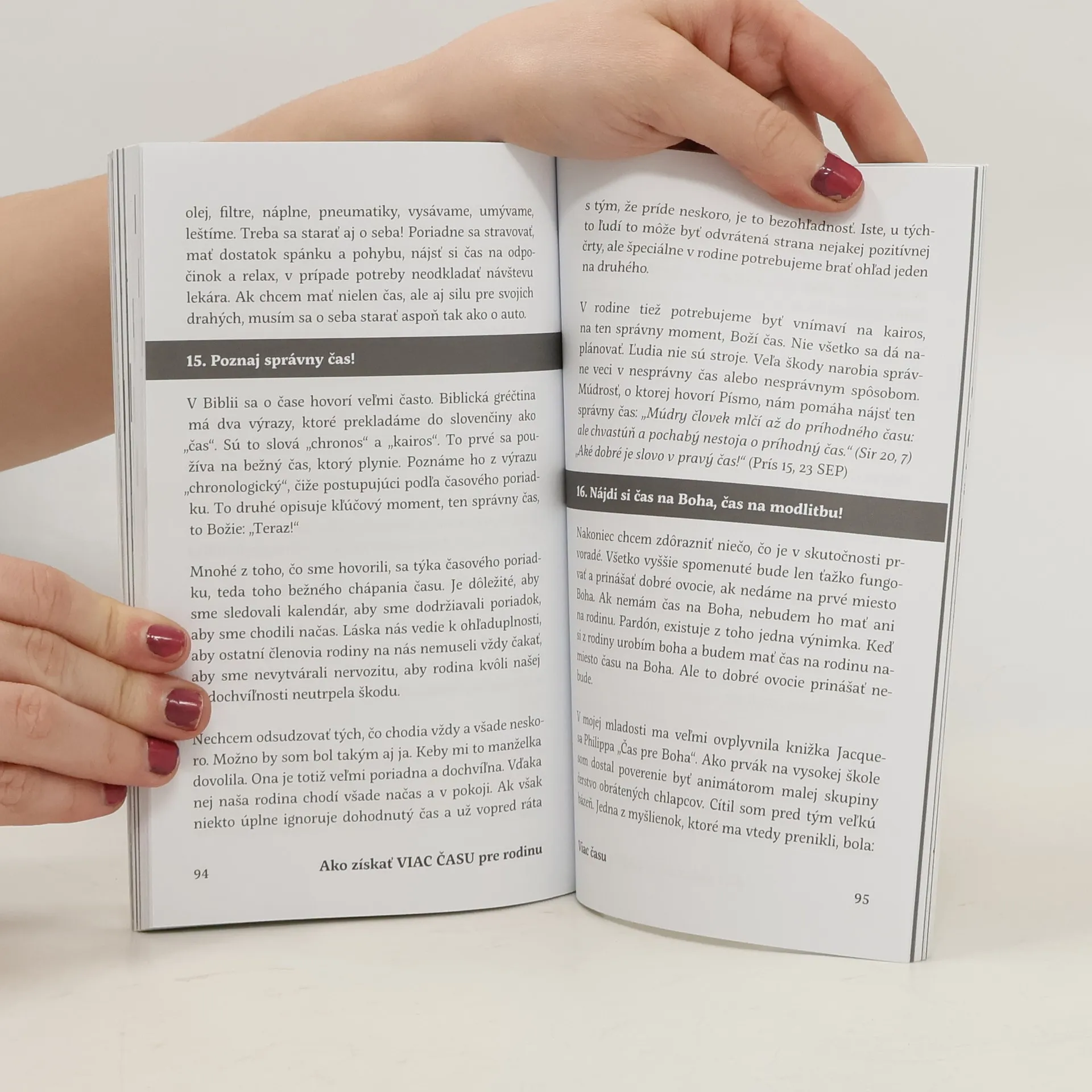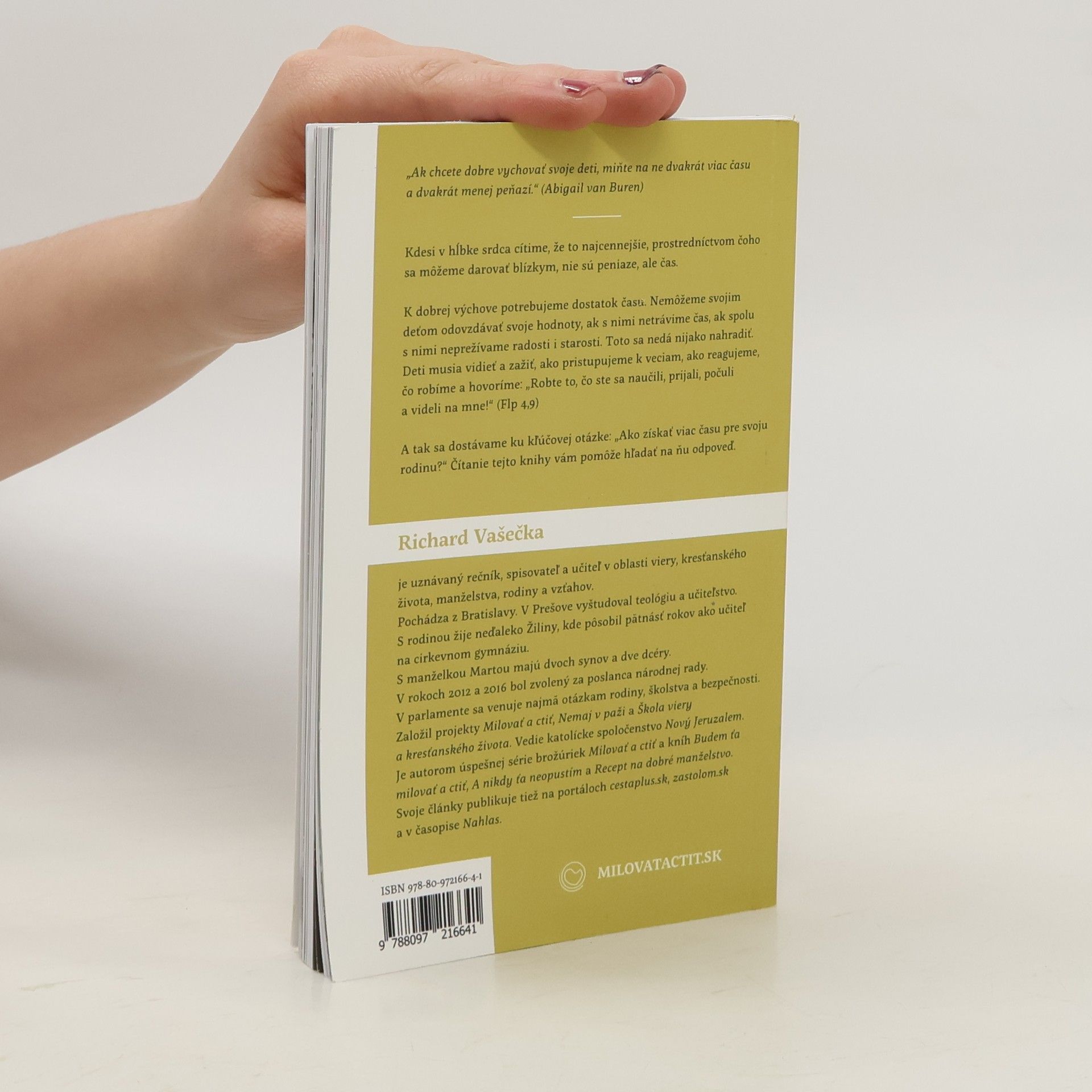 Pre mnohých rodičov odpoveď na otázku, či by chcel mať viac času pre svoju rodinu je úplne samozrejmá – áno. Každý by predsa chcel s deťmi, s manželom, či manželkou tráviť čo najviac času. Ťažšia je však odpoveď na otázku, kde tento čas vziať? Richard Vašečka vo svojej knihe Ako získať čas pre rodinu sa snaží konkrétnymi príkladmi pomôcť ľuďom, ktorí si svoj čas nevedia správne rozdeliť. Keď chceš povedať rodine „Áno!“, niekde musíš povedať „Nie!“ Deň má len 24 hodín a nikto z ľudí nekáže dňu pridať ani minútku. Ak máš rodinu a nemáš čas, potrebuješ sa naučiť byť efektívnym. Je potrebné vytvoriť si priority. Investovanie času do svojich blízkych je oveľa efektívnejšie ako investovať do nich peniaze. Úprimné vyjadrenie rodiča dieťaťu „mám na teba čas“ je najkrajším rodičovským vyznaním lásky.