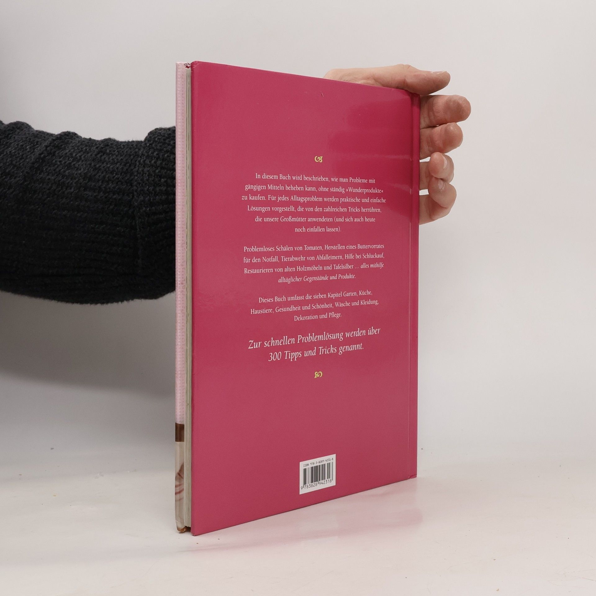 In diesem Buch wird beschrieben, wie man Probleme mit gängigen Mitteln beheben kann, ohne ständig „Wunderprodukte“ zu kaufen. Für jedes Alltagsproblem werden praktische und einfache Lösungen vorgestellt, die von den zahlreichen Tricks herrühren, die unsere Großmütter anwendeten (und sich auch heute noch einfallen lassen). Problemloses Schälen von Tomaten, Herstellen eines Buttervorrates für den Notfall, Tierabwehr von Abfalleimern, Hilfe bei Schluckauf, Restaurieren von alten Holzmöbeln und Tafelsilber. alles mithilfe alltäglicher Gegenstände und Produkte. Dieses Buch umfasst die sieben Kapitel Garten, Küche, Haustiere, Gesundheit und Schönheit, Wäsche und Kleidung, Dekoration und Pflege. Zur schnellen Problemlösung werden über 300 Tipps und Tricks genannt.