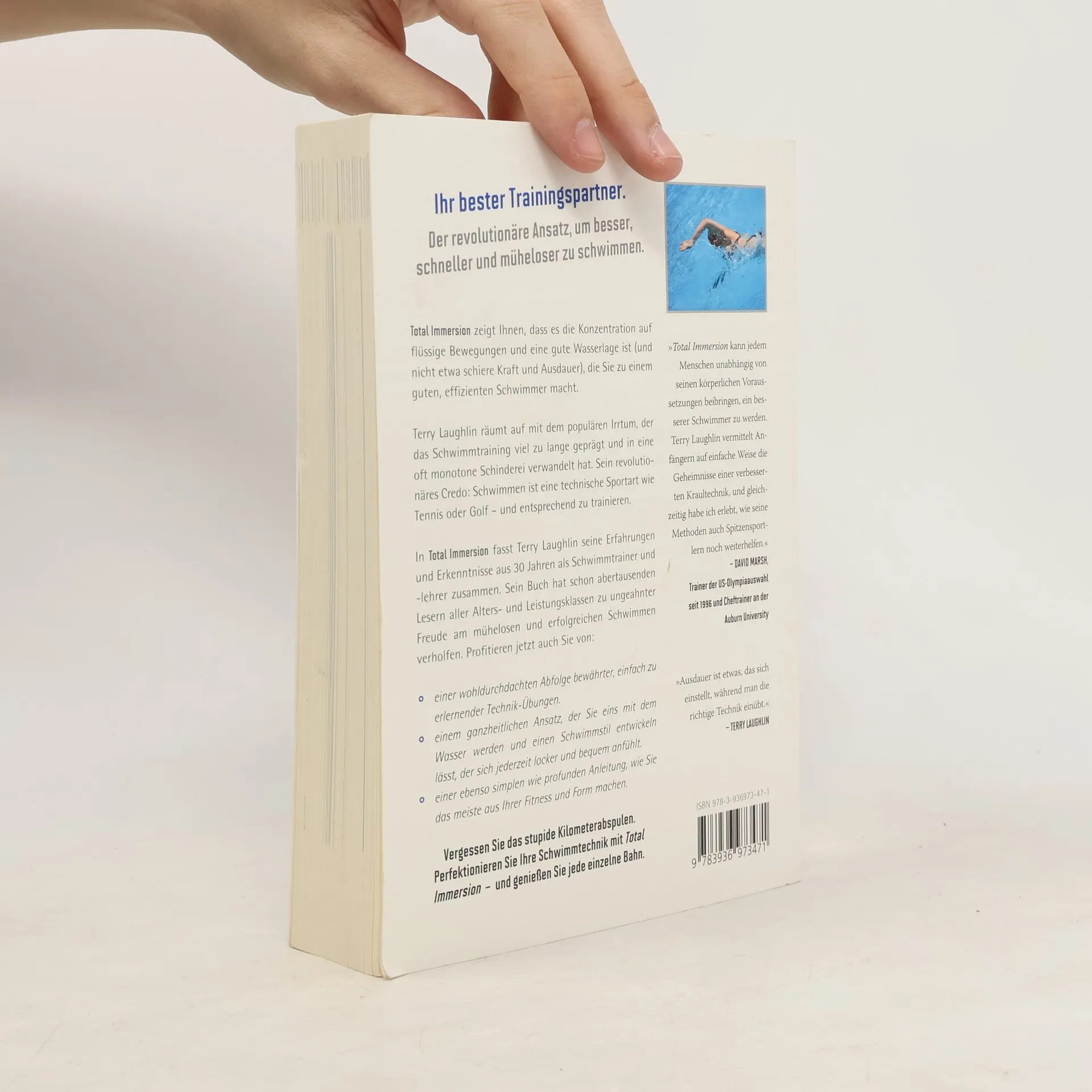 Terry Laughlins revolutionärer Ansatz für besseres und müheloses Schwimmen macht die richtige Kraul-Technik durch einfache Einzel-Übungen spielerisch erlernbar. Fitness-Schwimmer gleiten mit Grazie durchs Wasser, erfahrene Schwimmer brechen ihre Bestzeiten, und Triathleten sparen Energie für die Rad- und Laufstrecke. Diese gelenkschonende Sportart wird zum Jungbrunnen für Körper und Geist. Laughlin fordert alle Schwimmer auf, das monotone Kilometerabspulen und das Kraftraumtraining hinter sich zu lassen: Stattdessen sollen sie in lockerem Tempo an ihrer Wasserlage und Schwimmtechnik feilen. Er räumt mit dem Irrtum auf, dass Schwimmtraining nur aus Ausdauer und Kraft besteht. Schwimmen ist eine technische Sportart, die entsprechend trainiert werden muss. Laughlin beweist, dass die Konzentration auf flüssige Bewegungen entscheidend für einen effizienten Schwimmer ist. In diesem Buch fasst er seine Erfahrungen aus dreißig Jahren als Schwimmtrainer zusammen und zeigt, wie Leser aller Alters- und Leistungsklassen Freude am mühelosen Schwimmen finden können. Es bietet einen ganzheitlichen Ansatz mit bewährten, leicht erlernbaren Technik-Übungen, um einen lockeren und bequemen Schwimmstil zu entwickeln. Der Fitness- und Gesundheitsnutzen ergibt sich automatisch, während die richtige Technik eingeübt wird.