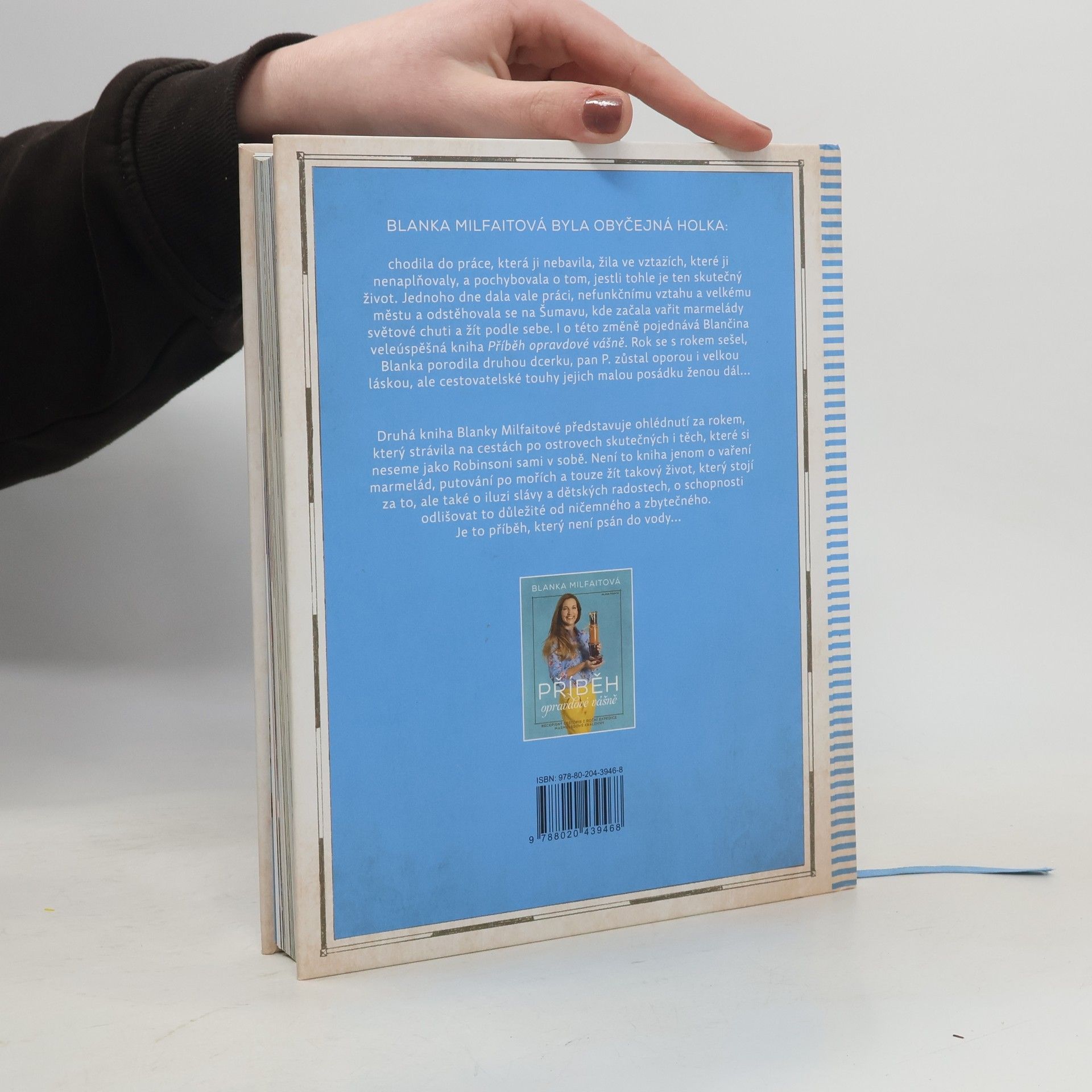Blanka Milfaitová byla obyčejná holka: chodila do práce, která ji nebavila, žila ve vztazích, které ji nenaplňovaly, a pochybovala o tom, jestli tohle je ten skutečný život. Jednoho dne dala vale práci, nefunkčnímu vztahu a velkému městu a odstěhovala se na Šumavu, kde začala vařit marmelády světové chuti a žít podle sebe. I o této změně pojednává Blančina veleúspěšná kniha Příběh opravdové vášně. Její druhá kniha představuje ohlédnutí za rokem, který strávila na cestách po ostrovech skutečných i těch, které si neseme jako Robinsoni sami v sobě. Není to kniha jenom o vaření marmelád, putování po mořích a touze žít takový život, který stojí za to, ale také o iluzi slávy a dětských radostech, o schopnosti odlišovat to důležité od ničemného a zbytečného. Je to příběh, který není psán do vody…