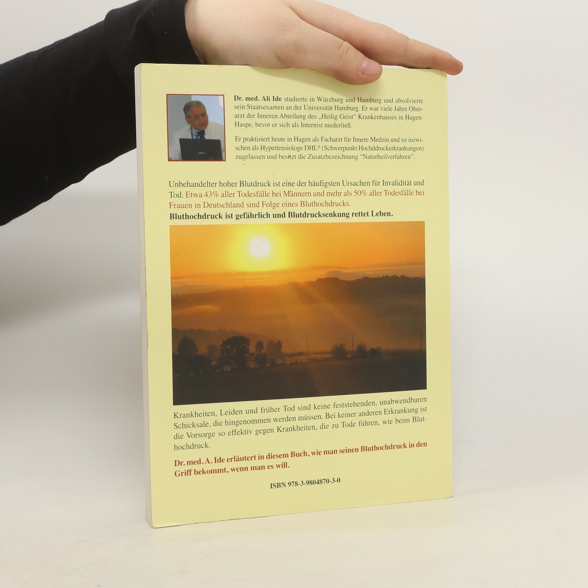 Dr. med. A. Ide erläutert in diesem Buch, wie man seinen Bluthochdruck in den Griff bekommt, wenn man es will. Unbehandelter hoher Blutdruck ist eine der häufigsten Ursachen für Invalidität und Tod. Etwa 43% aller Todesfälle bei Männern und mehr als 50% aller Todesfällen bei Frauen in Deutschland sind Folge eines Bluthochdrucks. Bluthochdruck ist gefährlich und Blutdrucksenkung rettet Leben. Krankheiten, Leiden und früher Tod sind keine feststehenden, unabwendbaren Schicksale, die hingenommen werden müssen. Bei keiner anderen Erkrankung ist die Vorsorge so effektiv gegen Krankheiten, die zu Tode führen, wie beim Bluthochdruck.