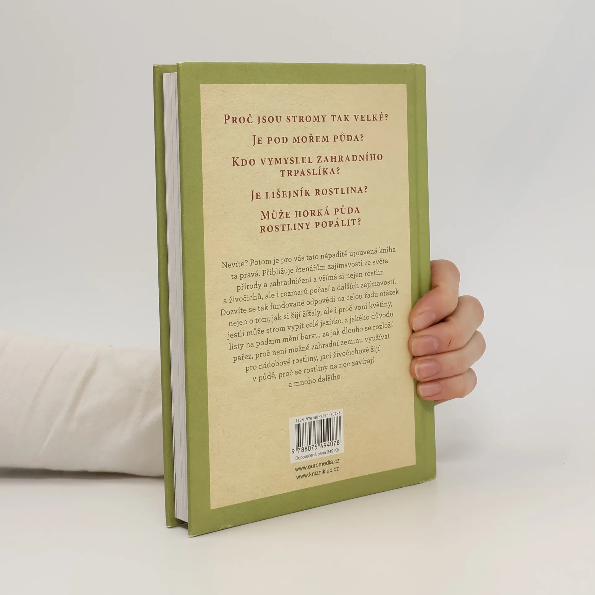 Nápaditě upravená publikace přibližuje čtenářům zajímavosti ze světa přírody a zahradničení. Je rozdělená na části, pracovně nazvané: Rostliny a semena, Květiny a ovoce, Pod zemí, Počasí, klima a roční období a Na zahradě. Všímá si rostlin, živočichů, rozmarů počasí a kromě obecných informací rozebírá i některé konkrétní zahradnické postupy, jako je například prořezávání rostlin či zavlažování. Dozvíte se tak fundované odpovědi na celou řadu otázek, nejen o tom, jak si žijí žížaly, ale i proč voní květiny, jestli může strom vypít celé jezírko, z jakého důvodu listy na podzim mění barvu, proč některé stromy mají jehličí a jiné rostliny zase trny, za jak dlouho se rozloží pařez, proč není možné zahradní zeminu využívat pro nádobové rostliny, jací živočichové žijí v půdě, jak rychle rostou stromy, proč se rostliny na noc zavírají a mnoho dalšího.