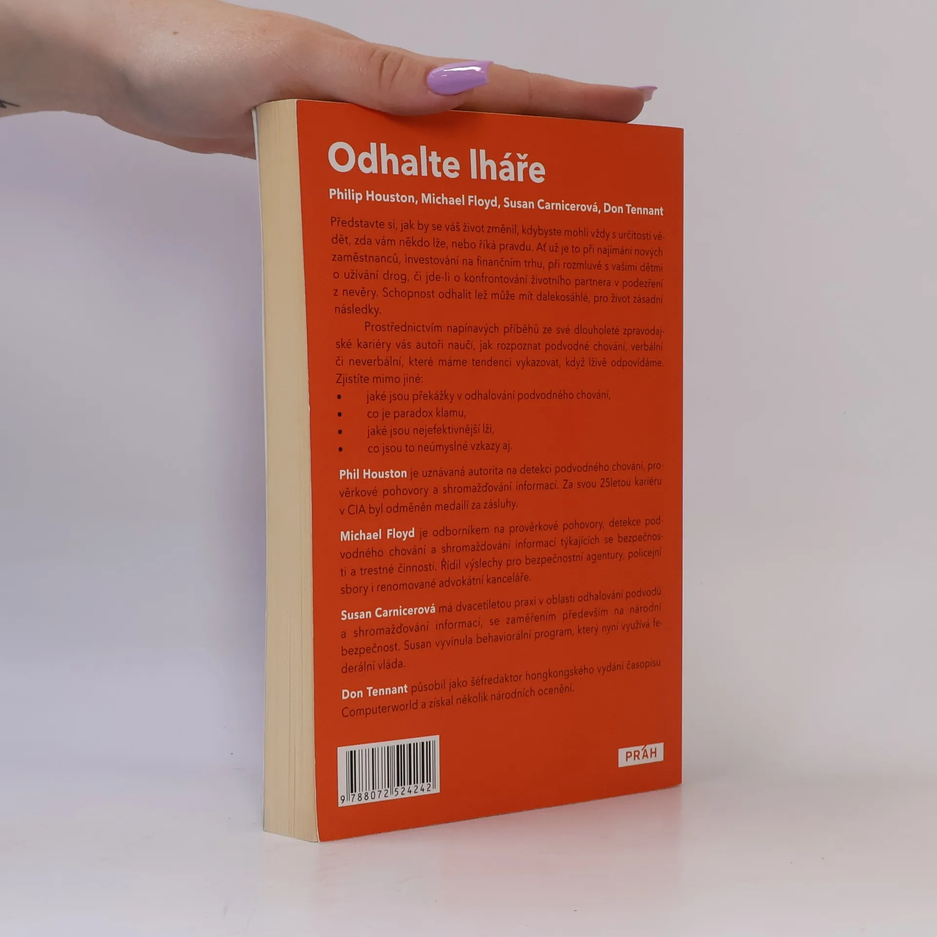 Představte si, jak by se váš život změnil, kdybyste mohli vždy s určitostí vědět, zda vám někdo lže, nebo říká pravdu. Ať už je to při najímání nových zaměstnanců, investování na finančním trhu, při rozmluvě s vašimi dětmi o užívání drog, či jde-li o konfrontování životního partnera v podezření z nevěry. Mít schopnost odhalit lež může mít dalekosáhlé, pro život zásadní následky. Prostřednictvím napínavých příběhů ze své dlouholeté zpravodajské kariéry vás autoři naučí, jak rozpoznat podvodné chování, verbální či neverbální, které máme tendenci vykazovat, když lživě odpovídáme. Zjistíte mimo jiné: " jaké jsou překážky v odhalování podvodného chování, " co je paradox klamu, " jaké jsou nejefektivnější lži, " co jsou to neúmyslné vzkazy aj.