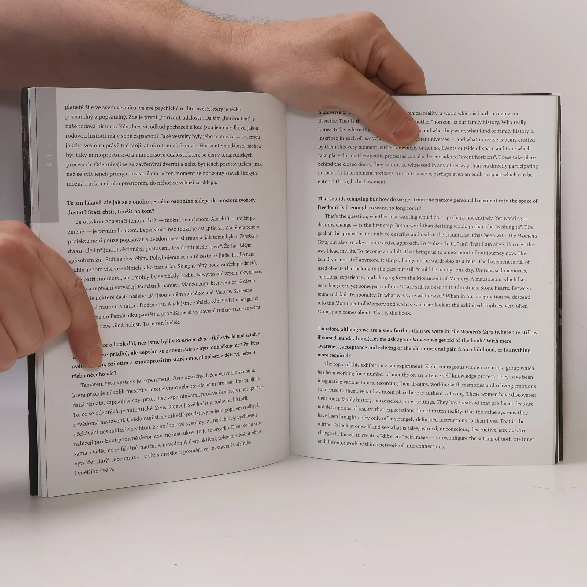 Kamila Ženatá je umělkyní, která se na české výtvarné scéně prosadila komplexní prací s výstavním prostorem a důrazem na osobní zážitek. Horizont událostí je unikátní projekt, při jehož realizaci sestavila experimentální skupinu osmi žen, které pracovaly na sebepoznávání v autorčině ateliéru. Z jejich výpovědí Ženatá vytvořila znepokojivou site-specific instalaci v prostorách legendárního uměleckého centra Karlin Studios v Praze. „Památník paměti“, součást instalace, odhaluje cestu do nevědomí a podsvětí. Tento výtvarný akt vybízí k účasti na procesu, který odkrývá intimní a skrytá území lidské psychiky. Výsledkem je autentické svědectví žen, které opustily uzavřené území a vstoupily do veřejného prostoru, čímž přinášejí inspiraci. Dvojjazyčný katalog dokumentuje celý tento originální exkurz do spodních proudů našich životů prostřednictvím autorských textů a obrazové dokumentace. Ženatá se ve své tvorbě soustavně zabývá pamětí, vzpomínkami, sny a nevědomím, a také sledováním přírodních jevů. Společné pole obou zájmů tvoří chápání světa jako cyklu proměn, kde se energie plynule transformují v příbězích a souvislostech.