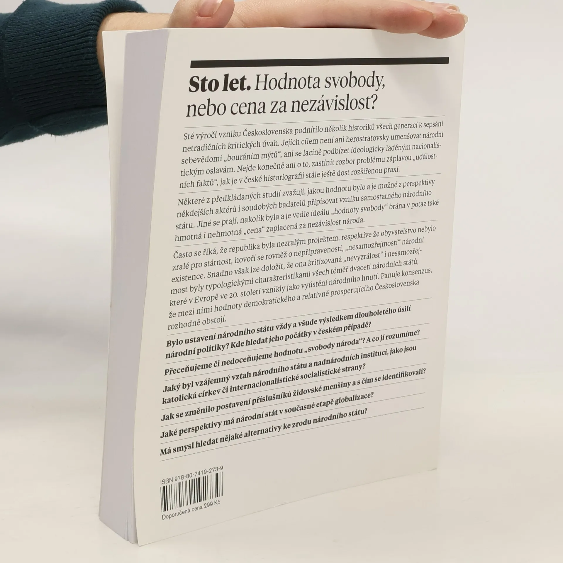 Sté výročí vzniku Československa inspirovalo historiky různých generací k sepsání kritických úvah, které se nesnaží zmenšovat národní sebevědomí ani se podbízet nacionalistickým oslavám. Cílem není zastínit analýzu problému množstvím „událostních faktů“, ale zvažovat hodnotu vzniku samostatného národního státu z pohledu tehdejších aktérů a současných badatelů. Některé studie se zaměřují na cenu zaplacenou za nezávislost, včetně hmotných a nehmotných aspektů. Často se diskutuje o tom, zda byla republika nezralým projektem a zda obyvatelstvo bylo připraveno na státnost. Kritizovaná „nevyzrálost“ byla však běžnou charakteristikou mnoha národních států, které vznikly v Evropě ve dvacátém století. Konsenzus panuje v tom, že Československo mělo hodnoty demokratického a prosperujícího státu. Otázky se týkají dlouhodobého úsilí o národní stát, jeho počátků, hodnoty „svobody národa“ a vztahu k nadnárodním institucím. Jak se měnilo postavení židovské menšiny a s čím se identifikovali? Jaké perspektivy má národní stát v globalizaci? Je smysluplné hledat alternativy ke vzniku národního státu? Autorský tým zahrnuje několik renomovaných historiků.