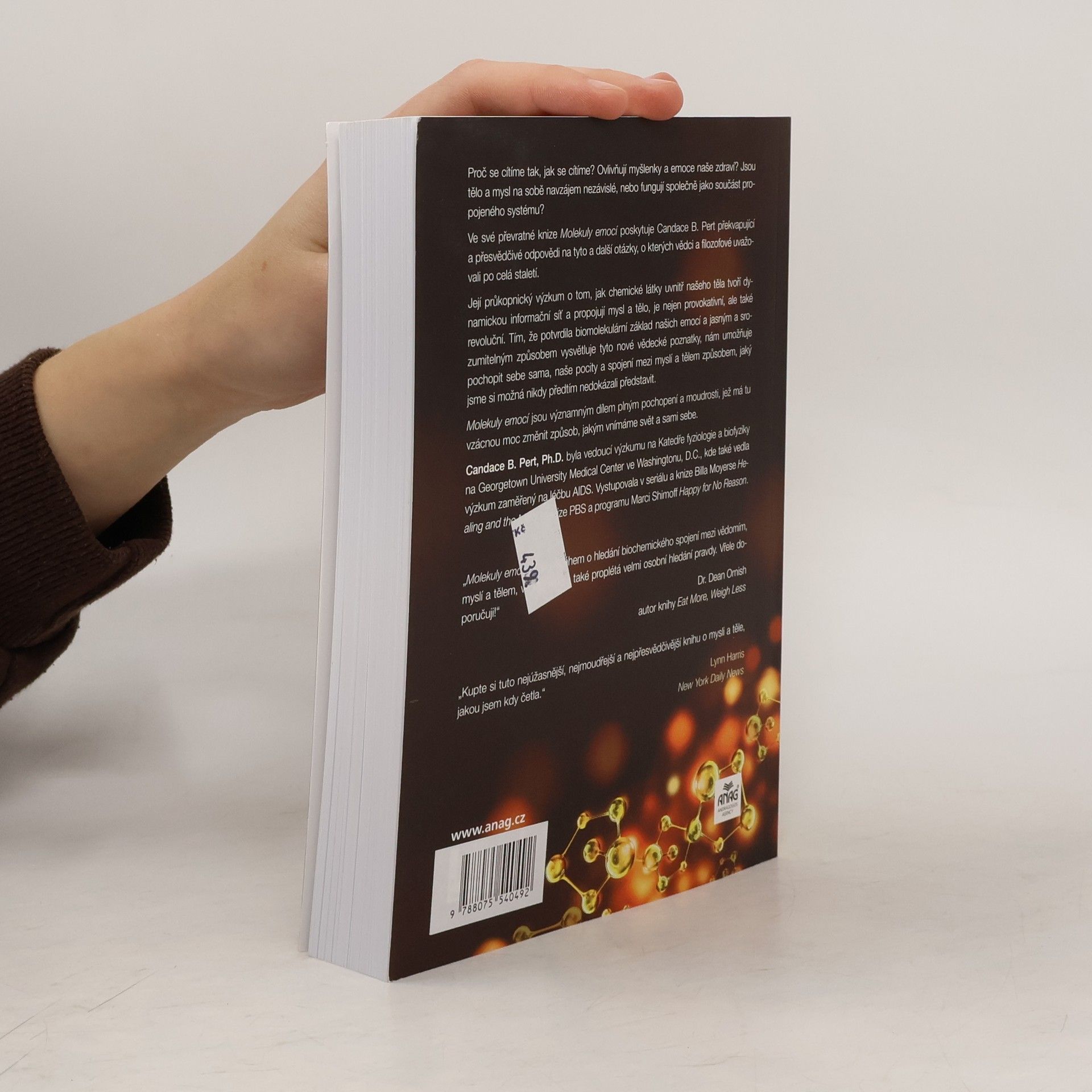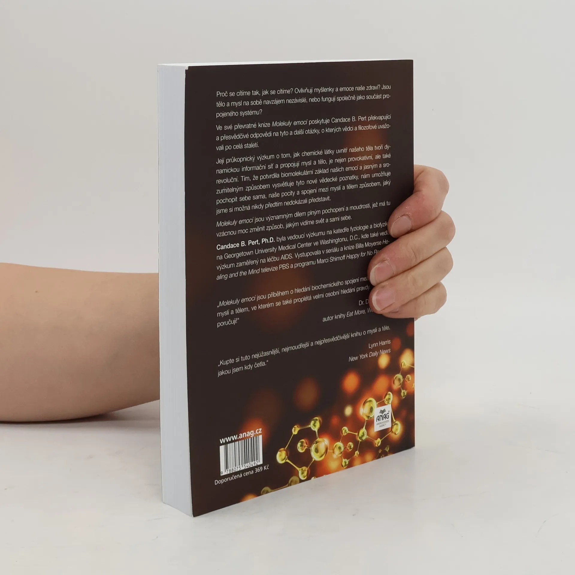 Proč se cítíme tak, jak se cítíme? Jak naše myšlenky a emoce ovlivňují naše zdraví? Jsou naše tělo a mysl od sebe navzájem odlišné, nebo fungují společně jako součást propojeného systému? Propojení těla a mysli. Ve své průkopnické knize Molekuly emocí Candace Pert poskytuje překvapivé a přesvědčivé odpovědi na tyto a další náročné otázky, o kterých vědci a filozofové uvažovali už po staletí. Její průkopnický výzkum o tom, jak chemikálie uvnitř našich těl tvoří dynamickou informační síť, propojující mysl a tělo, není pouze provokativní, nýbrž revoluční. Na základě stanovení biomolekulárního základu našich emocí a vysvětlení těchto nových vědeckých poznatků jasným a přístupným způsobem nám autorka umožňuje pochopit sama sebe, své pocity a spojení mezi naší myslí a naším tělem – těla-mysli – způsobem, který jsme si možná nikdy předtím nemohli představit. Molekuly emocí je dominantní dílo, plné pochopení a moudrosti a ovládnutí této vzácné síly ke změně způsobu, jakým vidíme svět a sami sebe.