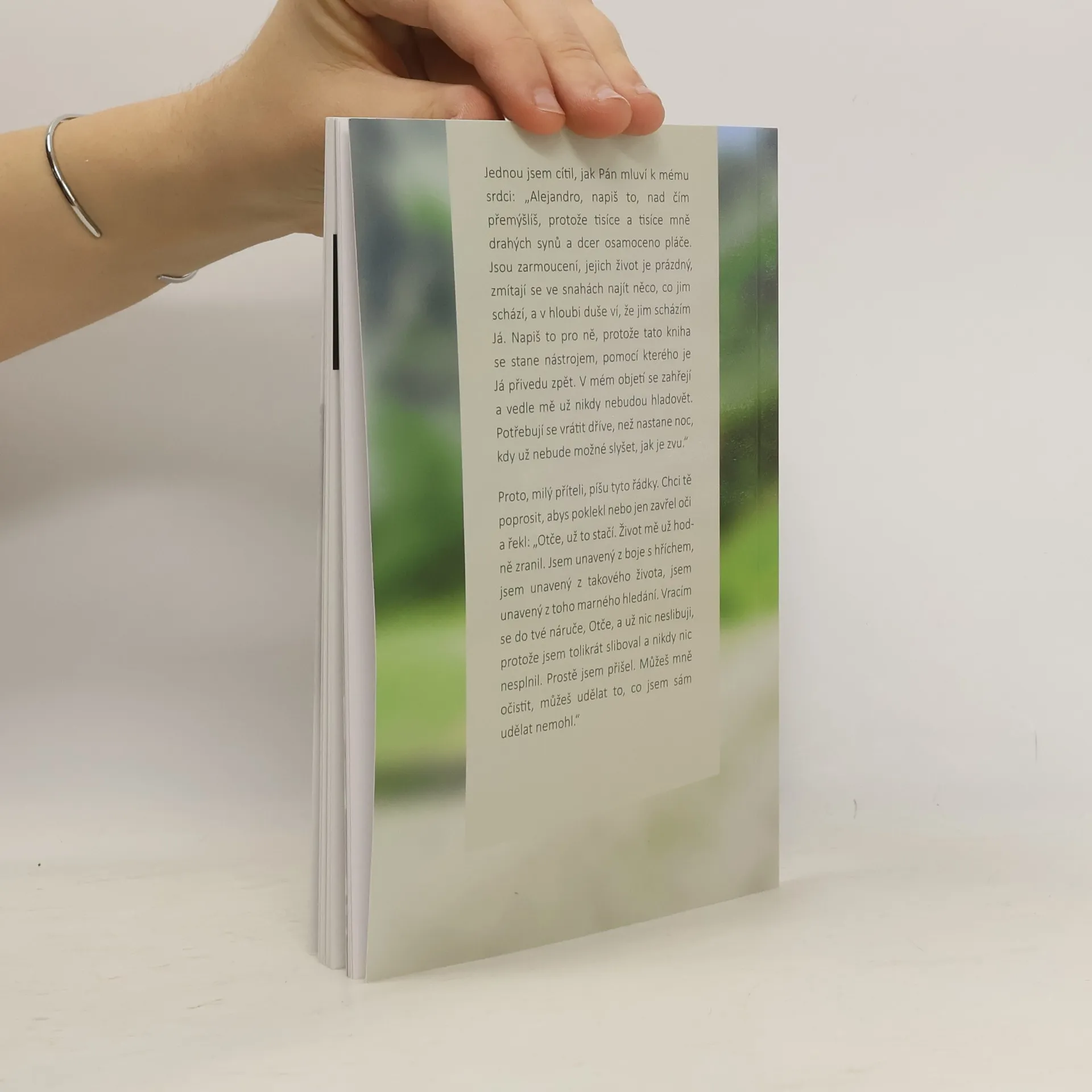 Jednou jsem cítil, jak Pán mluvil k mému srdci: „Allejandro, napiš to, nad čím přemýšlíš, protože tisíce a tisíce mě drahých synů a dcer osamoceno pláče. Jsou zarmouceni, jejich život je prázdný, zmítají se v snahách najít něco, co jim schází, a v hloubi duše ví, že jim scházím Já. Napiš to pro ně, protože tato kniha se stane nástrojem, pomocí kterého je přivedu zpět. V mém objetí se zahřejí a vedle Mě už nikdy nebudou hladovět. Potřebují se vrátit dříve, než nastane noc, kdy už nebude možné slyšet, jak je zvu." Proto milý příteli, píšu tyto řádky. Chci tě poprosit, abys poklekl, nebo jen zavřel oči a řekl: „Otče už to stačí. Život mě už hodně zranil. Jsem unavený s bojem s hříchem, jsem unavený z takového života, jsem unavený z toho marného hledání. Vracím se do Tvé náruče, Otče, a už nic neslibuji, protože jsem tolikrát sliboval a nikdy nic nesplnil. Prostě jsem přišel. Můžeš mně očistit, můžeš udělat to, co jsem sám udělat nemohl."