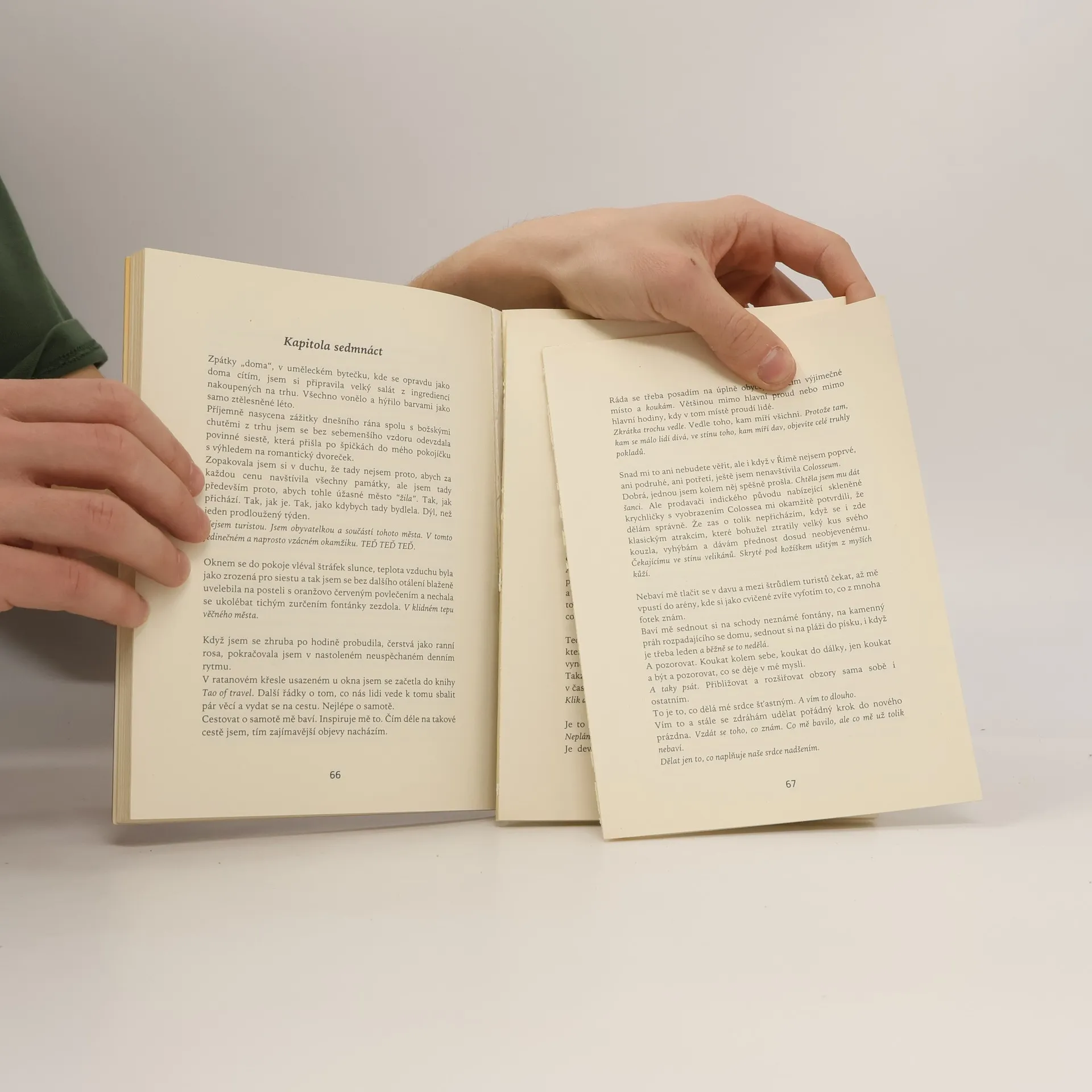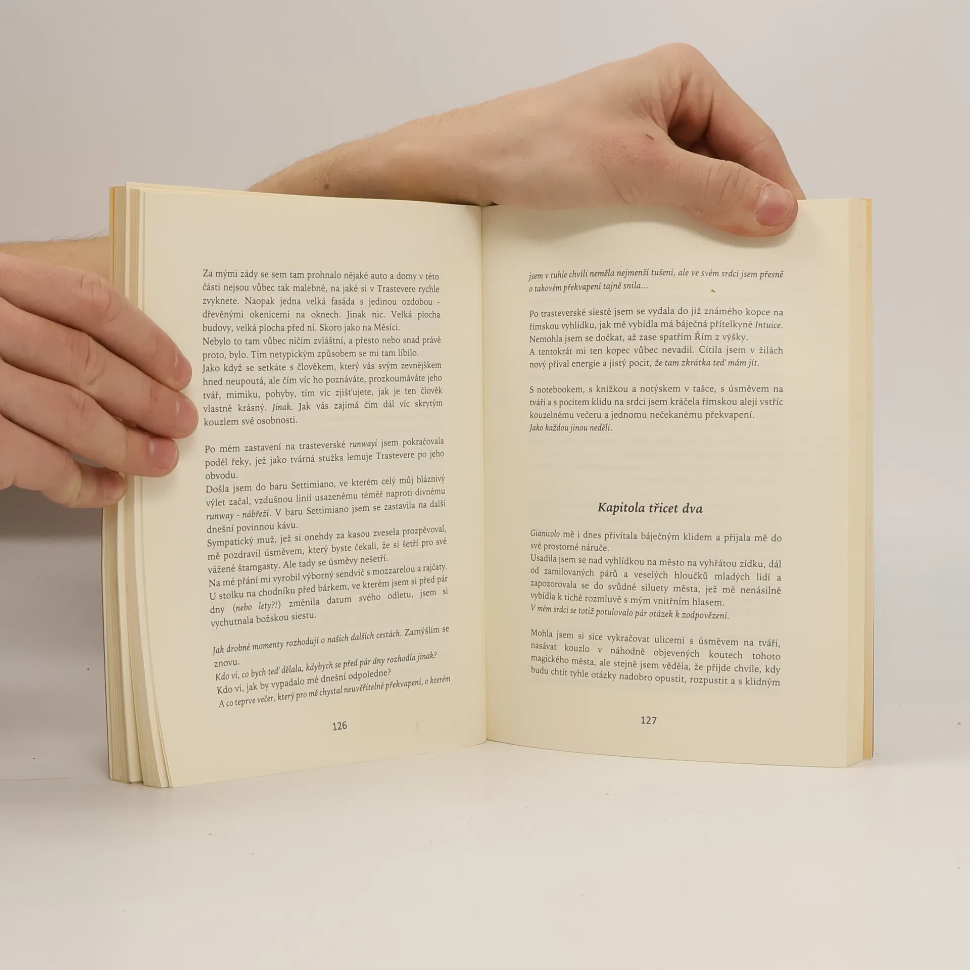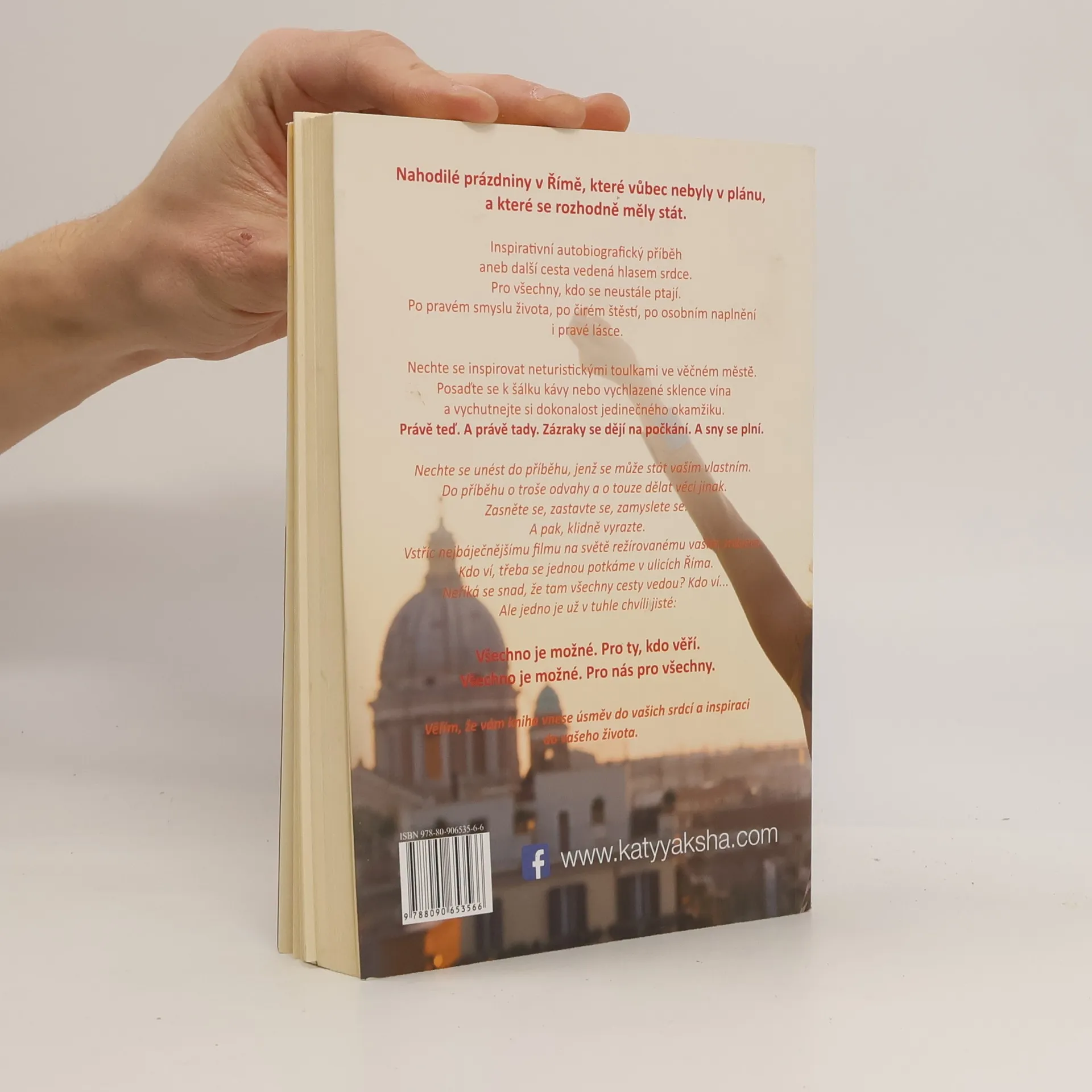 Autobiografický inspirativní příběh, který osvětluje cestu vedenou hlasem srdce, je určen pro ty, kteří hledají pravý smysl života, štěstí, osobní naplnění a lásku. Jeden sen, jeden okamžik, náhlé vnuknutí může nasměrovat naše kroky k vysněnému cíli. Pokud neposlechneme pocit, který nás vybízí skočit do neznáma, vzdáváme se jedinečné příležitosti splnit si sen. Řím, město, které se od první návštěvy před deseti lety nesmazatelně otisklo do srdce, mě opět přitahuje. Magický Řím mě přiměl se na chvíli zastavit a díky tomu jsem prožila svou osobní verzi oblíbeného filmu, našla odpovědi a nový směr. Setkání, náhody a šálky kávy mě vedou k tomu nejdůležitějšímu: užívat si každý moment a žasnout nad přítomností. Spolehám se na intuici, která mě zavede tam, kde toužím být. Okouzlující kulisy romantického města, zahalené do letního závoje, mě vtahují do vzrušujícího děje, který se odehrává doopravdy. Každý, kdo riskne a poslechne hlas srdce, se může vydat na dobrodružství, které čeká na ty, kdo se odváží.