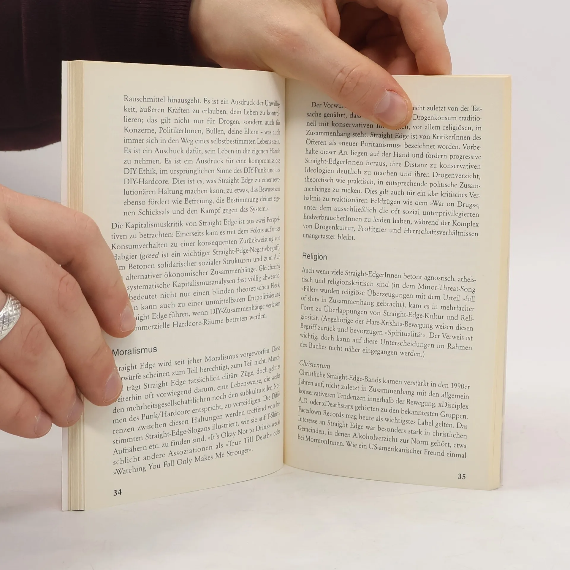 Eine Analyse drogenfreier Hardcore-Punk-Kultur. Straight Edge entstand Anfang der 1980er Jahre als eine drogenfreie Subkultur innerhalb der Hardcore-Punk-Szene. Bald entwickelte sich daraus eine Bewegung, die sich auf alle Kontinente ausdehnte. 1981 schrieb Ian MacKaye, damals Sänger der Washington-D. C.-Hardcore-Band Minor Threat, den Song „Straight Edge“, um seinen Verzicht auf Alkohol-, Nikotin- und Drogenkonsum innerhalb der Hardcore-Punk-Szene zu verteidigen. Er initiierte damit – gegen seine ausdrücklichen Intentionen – eine Bewegung, die bis heute eine fixe Größe in der Welt des Hardcore-Punk darstellt. Dieses Buch zeichnet die Geschichte der Straight-Edge-Bewegung nach: von den Anfängen in Washington, D. C. über die sogenannten Youth-Crew-Bands der späten 1980er Jahre und die Vegan-Straight-Edge-Bewegung der 1990er bis hin zu der vielfältigen Straight-Edge-Kultur der Gegenwart. Ein besonderes Augenmerk liegt auf der ambivalenten politischen Dimensionen der Bewegung, die seit jeher zwischen konservativem Puritanismus und linksradikalem Aktivismus pendeln. Analysiert werden unter anderem die Rolle von Geschlecht, Sexualität, Kapitalismus/Konsumkultur, Tierrechten, Naturschutz und Religion innerhalb der Straight-Edge-Szene.
