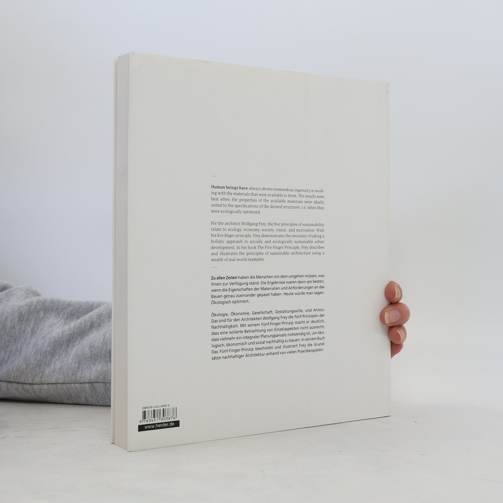 For the architect Wolfgang Frey, the five principles of sustainability relate to ecology, economy, society, vision, and motivation. In his book The Five Finger Principle, Frey illustrates the principles of socially and ecologically sustainable architecture using a wealth of real-world examples. Among others the Frey Architectural Firm presented concepts and projects for sustainable architecture and urban development on behalf of the city of Freiburg at the EXPO 2010 in Shanghai.Ökologie, Ökonomie, Gesellschaft, Gestaltungswille und Anreiz: Das sind für den Architekten Wolfgang Frey die fünf Prinzipien der Nachhaltigkeit. In seinem Buch ,, Das Fünf-Finger-Prinzip" illustriert er die Grundsätze einer ökologisch und sozial nachhaltigen Architektur anhand von vielen Praxisbeispielen. Neben anderen präsentierten Frey Architekten Konzepte und Projekte nachhaltiger Architektur und Stadtentwicklung für die Stadt Freiburg auf der EXPO 2010 in Shanghai.