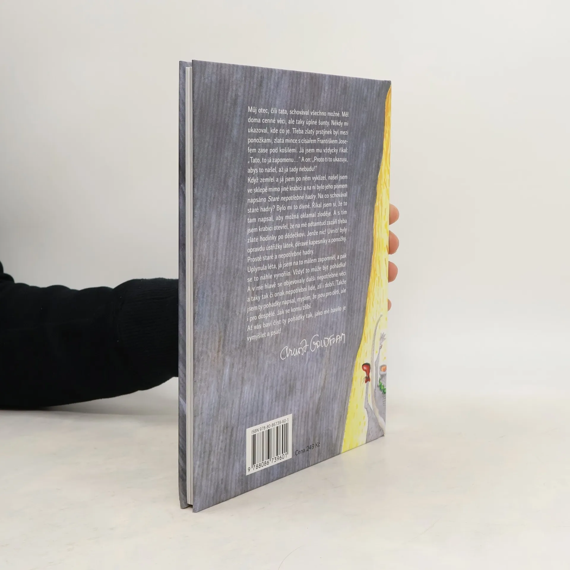 Oblíbený autor originálních pohádkových příběhů přichází se 14 novými pohádkami, plnými svérázné poetiky a neotřelých nápadů. „Můj otec schovával všechno možné. Měl doma cenné věci, ale taky úplné šunty. Někdy mi ukazoval, kde co je. Třeba zlatý prstýnek byl mezi ponožkami, zlatá mince s císařem Františkem Josefem zase pod košilemi. Našel jsem po něm ve sklepě mimo jiné krabici a na ní bylo jeho písmem napsáno Staré nepotřebné hadry. Říkal jsem si, že to tam napsal, aby možná oklamal zloděje. A s tím jsem krabici otevřel, že na mě odtamtud zazáří třeba zlaté hodinky po dědečkovi. Jenže nic! Uvnitř byly opravdu ústřižky látek, děravé kapesníky a ponožky. Uplynula léta, já jsem na to málem zapomněl, a pak se to náhle vynořilo. Vždyť to může být pohádka! A v mé hlavě se objevovaly další nepotřebné věci a taky tak či onak nepotřební lidé, zlí i dobří. Takže jsem ty pohádky napsal, myslím, že jsou pro děti, ale i pro dospělé. Jak se komu zlíbí. Ať vás baví číst ty pohádky tak, jako mě bavilo je vymýšlet a psát!“
