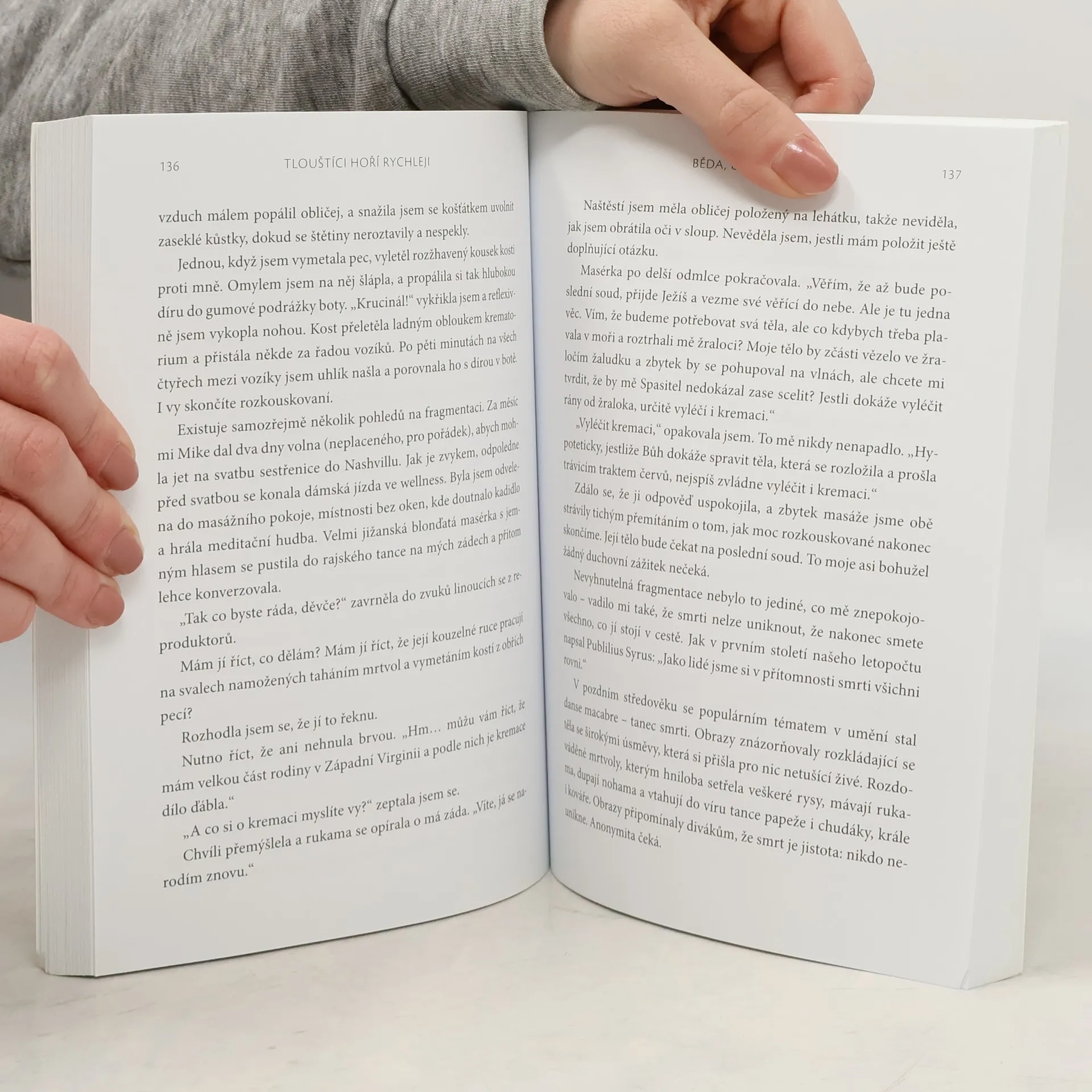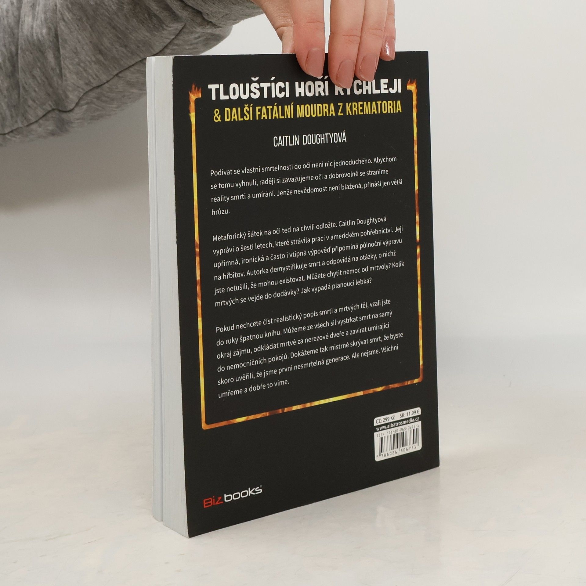 Podívat se vlastní smrtelnosti do očí není nic jednoduchého. Abychom se tomu vyhnuli, raději si zavazujeme oči a dobrovolně se straníme reality smrti a umírání. Jenže nevědomost není blažená, přináší jen větší hrůzu. Metaforický šátek na oči teď na chvíli odložte. Caitlin Doughtyová vypráví o šesti letech, které strávila prací v americkém pohřebnictví. Její upřímná, ironická a často i vtipná výpověď připomíná půlnoční výpravu na hřbitov. Autorka demystifikuje smrt a odpovídá na otázky, o nichž jste ani nevěděli, že je máte. Můžete chytit nemoc od mrtvoly? Kolik mrtvých se vejde do dodávky? Jak vypadá planoucí lebka? Pokud nechcete číst realistický popis smrti a mrtvých těl, vzali jste do ruky špatnou knihu. Můžeme ze všech sil vystrkat smrt na samý okraj zájmu, odkládat mrtvé za nerezové dveře a zavírat umírající do nemocničních pokojů. Dokážeme tak mistrně skrývat smrt, že byste skoro uvěřili, že jsme první nesmrtelná generace. Ale nejsme. Všichni umřeme a dobře to víme.