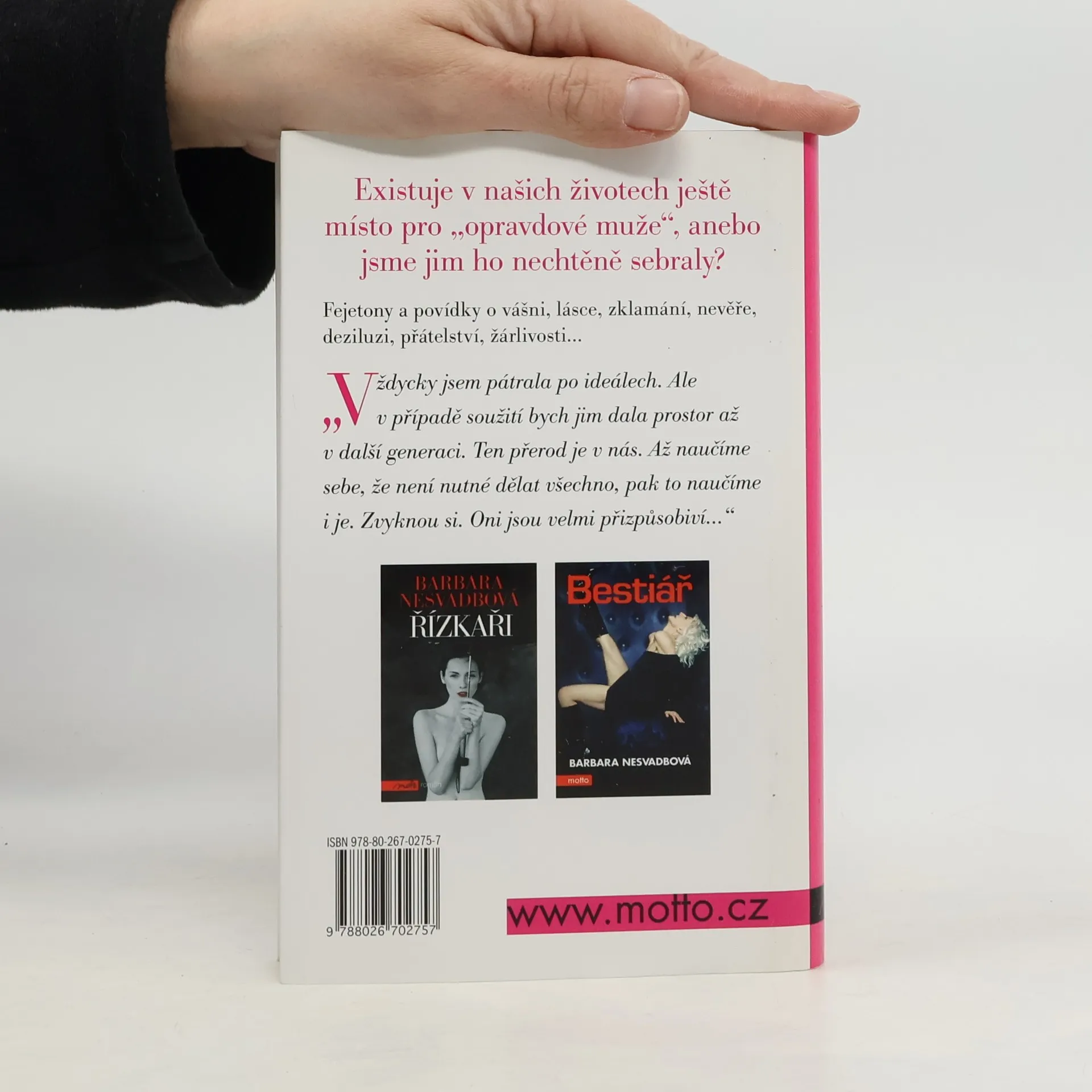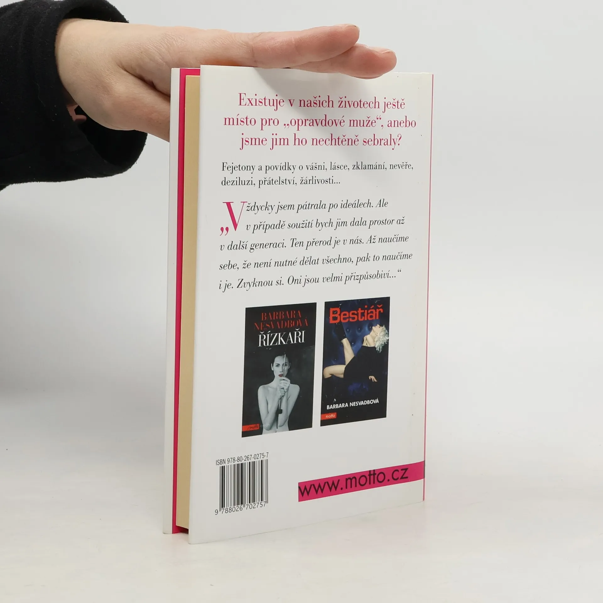 Existuje v našich životech ještě místo pro „opravdové muže“, a nebo jsme jim ho nechtěně sebraly? Fejetony a povídky Barbary Nesvadbové o vášni, lásce, zklamání, nevěře, deziluzi, zášti, přátelství i žárlivosti.