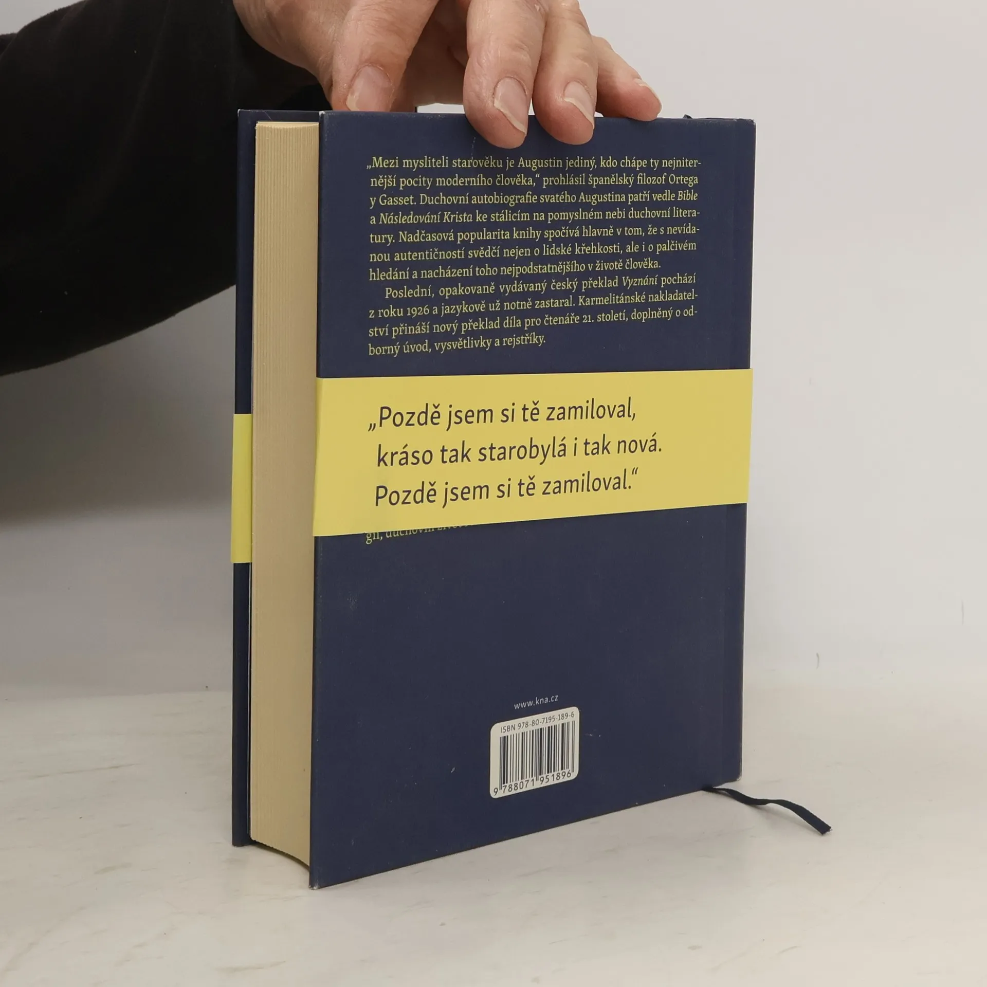„Mezi mysliteli starověku je Augustin jediný, kdo chápe ty nejniternější pocity moderního člověka,“ prohlásil španělský filosof Ortega y Gasset. Duchovní autobiografie svatého Augustina patří vedle Bible a Následování Krista ke stálicím na pomyslném nebi duchovní literatury. Nadčasová popularita knihy spočívá hlavně v tom, že s nevídanou autentičností svědčí nejen o lidské křehkosti, ale i o palčivém hledání a nacházení toho nejpodstatnějšího v životě člověka. Poslední, opakovaně vydávaný český překlad Vyznání pochází z roku 1926 a jazykově už notně zastaral. Karmelitánské nakladatelství přináší nový překlad díla pro čtenáře 21. století, doplněný o odborný úvod, vysvětlivky a rejstříky.