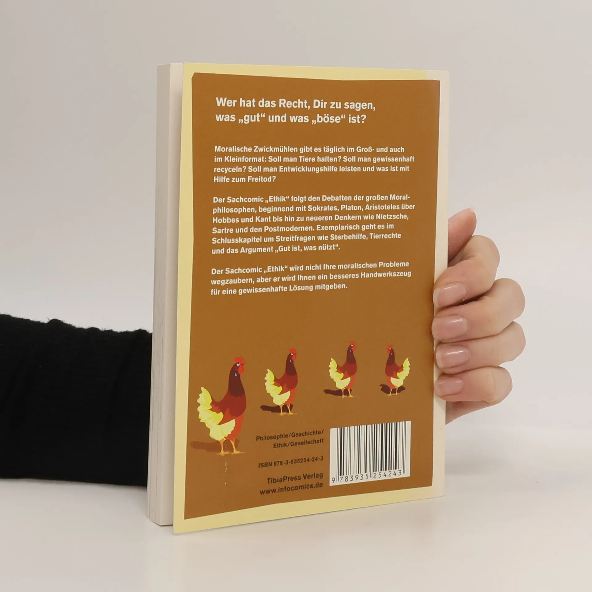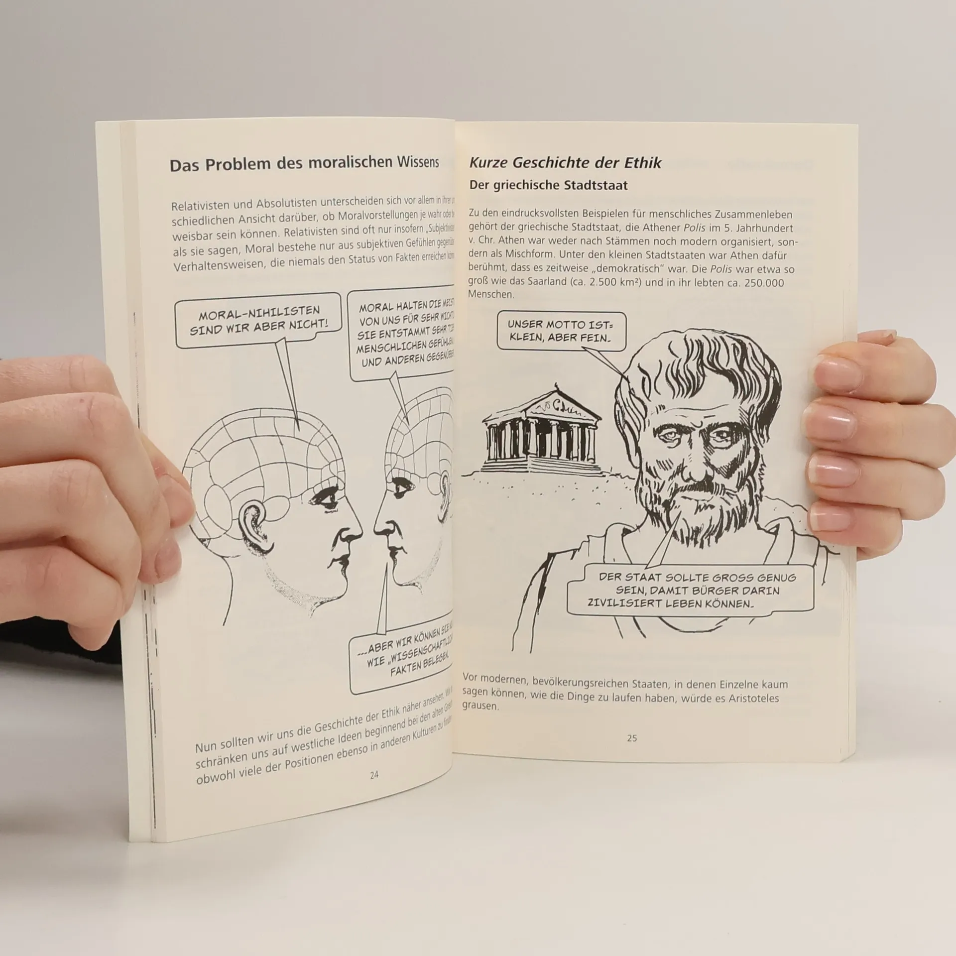 Ethik Wer hat das Recht, Dir zu sagen was „gut“ und was „böse“ ist? Werteentscheidungen kann niemand aus dem Weg gehen. Moralische Zwickmühlen gibt es im Groß- und im Kleinformat: soll man Tiere halten; soll man gewissenhaft recyceln; soll man Entwicklungshilfe leisten, und was ist mit Sterbehilfe? Der Sachcomic Ethik folgt den Debatten der großen Moralphilosophen, beginnend mit Sokrates, Platon, Aristoteles über Hobbes und Kant, bis hin zu modernen Denkern wie Nietzsche, Sartre und den Postmodernen. Exemplarisch geht es zum Schluss um Streitfragen wie Sterbehilfe, Tierrechte und das Argument „Gut ist, was nützt“. Dieser Sachcomic wird nicht gleich alle Ihre moralischen Probleme wegzaubern, aber er wird Ihnen besseres Handwerkszeug zu einer gewissenhaften Lösung mitgeben.
