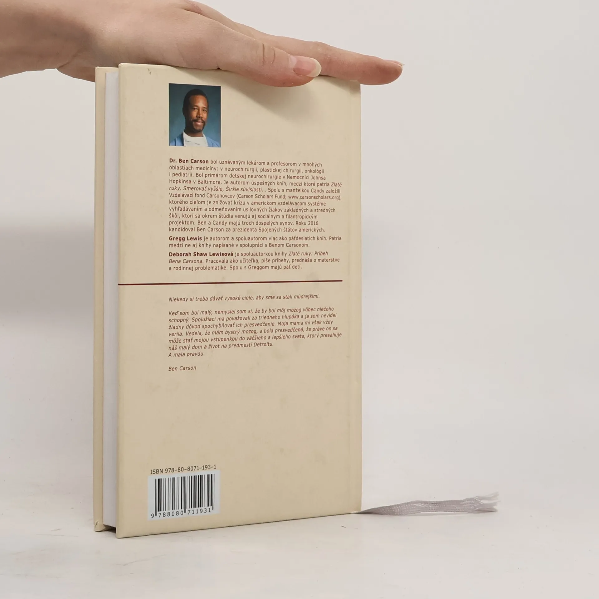 Niekedy si treba dávať vysoké ciele, aby sme sa stali múdrejšími. Keď som bol malý, nemyslel som si, že by bol môj mozog vôbec niečoho schopný. Spolužiaci ma považovali za triedneho hlupáka a ja som nevidel žiadny dôvod spochybňovať ich presvedčenie. Moja mama mi však vždy verila. Vedela, že mám bystrý mozog, a bola presvedčená, že práve on sa môže stať mojou vstupenkou do väčšieho a lepšieho sveta, ktorý presahuje náš malý dom a život na predmestí Detroitu. A mala pravdu. Dr. Ben Carson bol uznávaným lekárom a profesorom v mnohých oblastiach medicíny: v neurochirurgii, plastickej chirurgii, onkológii i pediatrii. Bol primárom detskej neurochirurgie v Nemocnici Johnsa Hopkinsa v Baltimore. Je autorom úspešných kníh, medzi ktoré patria Zlaté ruky, Smerovať vyššie, Širšie súvislosti… Spolu s manželkou Candy založili Vzdelávací fond Carsonovcov, ktorého cieľom je znižovať krízu v americkom vzdelávacom systéme vyhľadávaním a odmeňovaním usilovných žiakov základných a stredných škôl, ktorí sa okrem štúdia venujú aj sociálnym a filantropickým projektom. Ben a Candy majú troch dospelých synov. Roku 2016 kandidoval Ben Carson za prezidenta Spojených štátov amerických.