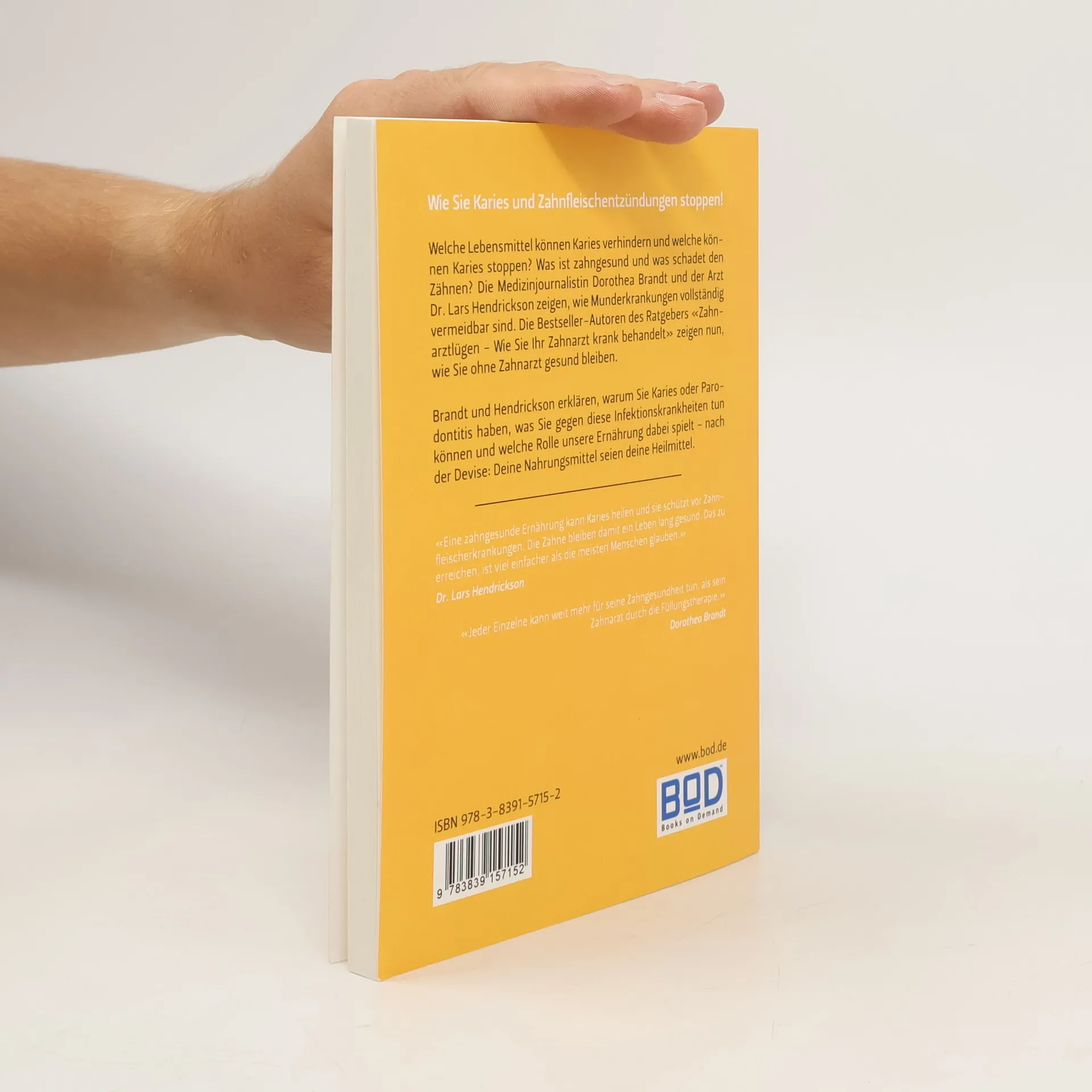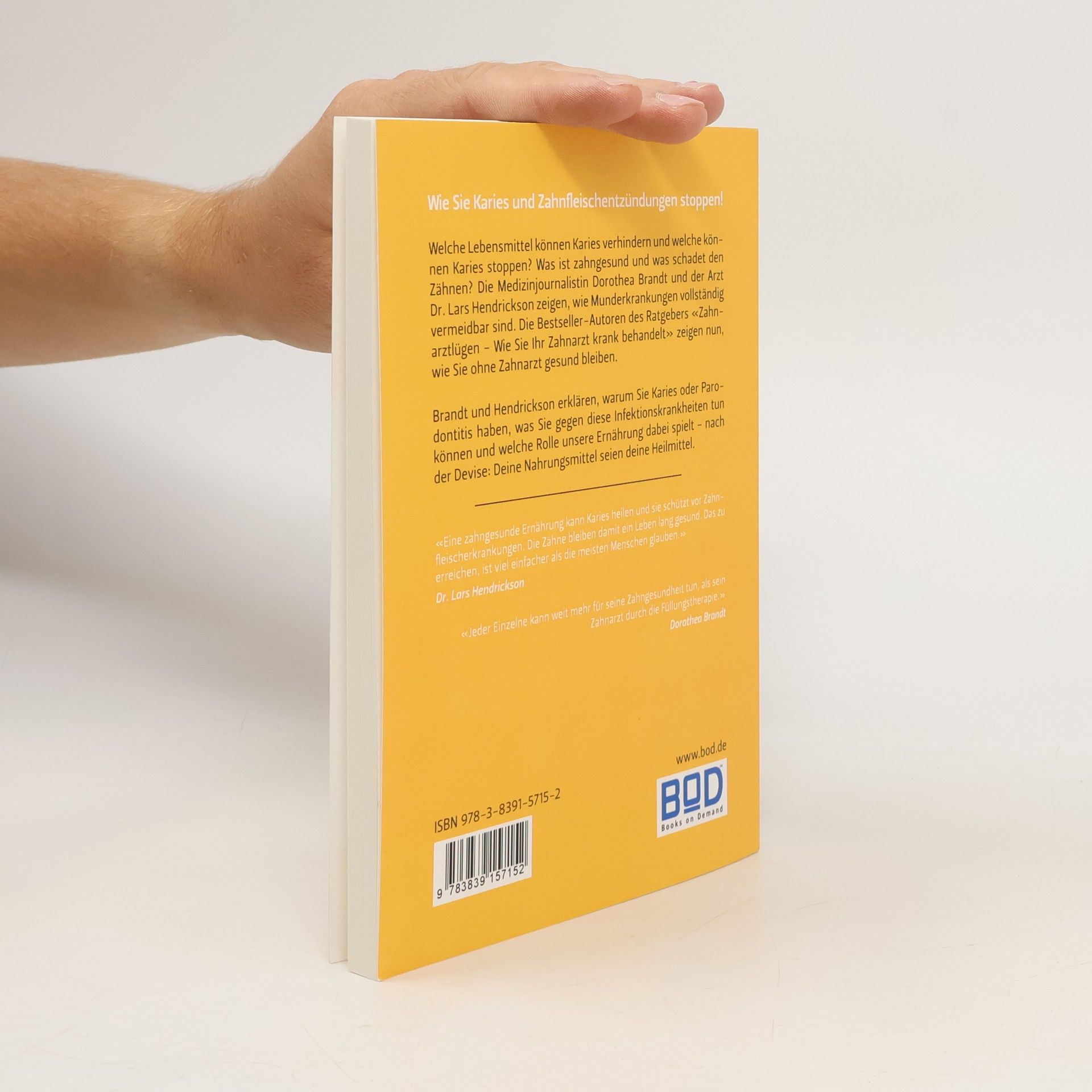 Wie Sie Karies und Zahnfleischentzündungen stoppen! Welche Lebensmittel können Karies verhindern und welche können Karies stoppen? Was ist zahngesund und was schadet den Zähnen? Die Medizinjournalistin Dorothea Brandt und der Arzt Dr. Lars Hendrickson zeigen, wie Munderkrankungen vollständig vermeidbar sind. Die Bestseller-Autoren des Ratgebers «Zahnarztlügen – Wie Sie Ihr Zahnarzt krank behandelt» zeigen nun, wie Sie ohne Zahnarzt gesund bleiben. Brandt und Hendrickson erklären, warum Sie Karies oder Parodontitis haben, was Sie gegen diese Infektionskrankheiten tun können und welche Rolle unsere Ernährung dabei spielt – nach der Devise: Deine Nahrungsmittel seien deine Heilmittel. «Eine zahngesunde Ernährung kann Karies heilen und sie schützt vor Zahnfleischerkrankungen. Die Zähne bleiben damit ein Leben lang gesund. Das zu erreichen, ist viel einfacher als die meisten Menschen glauben.» Dr. Lars Hendrickson «Jeder Einzelne kann weit mehr für seine Zahngesundheit tun, als sein Zahnarzt durch die Füllungstherapie.» Dorothea Brandt