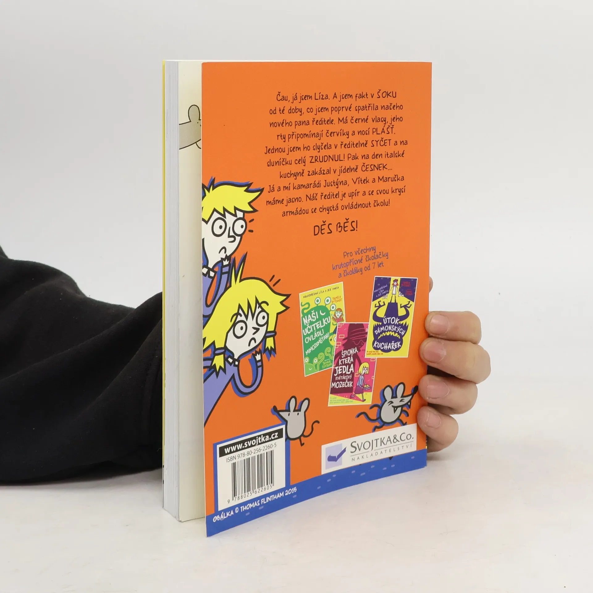 Ve škole hrozí vážné nebezpečí, a do některých míst je dokonce přísný zákaz vstupu. Zatéká do střechy? Nebo je pravda, co se říká, a třídy jsou zamořené krysami? Nový ředitel tomu nasadí korunu – podle jeho chování je zcela jasné, že je to upír! Parta ze 3.A musí shromáždit důkazy, aby mohla povolat armádu. Protože tohle je jejich škola a oni se rozhodně nehodlají vzdát bez boje! Humorný příběh ze školního prostředí vypráví jeho hlavní protagoniska Líza, která si nebere servítky a vše komentuje s upřímností a bezprostředností sobě vlastní. Kniha pobaví děti od sedmi let i jejich rodiče. A že vše bude nakonec úplně jinak, než se zdá? To zjistíme. Rozhodně se při tom krutopřísně nasmějeme, až budeme cenit špičáky.