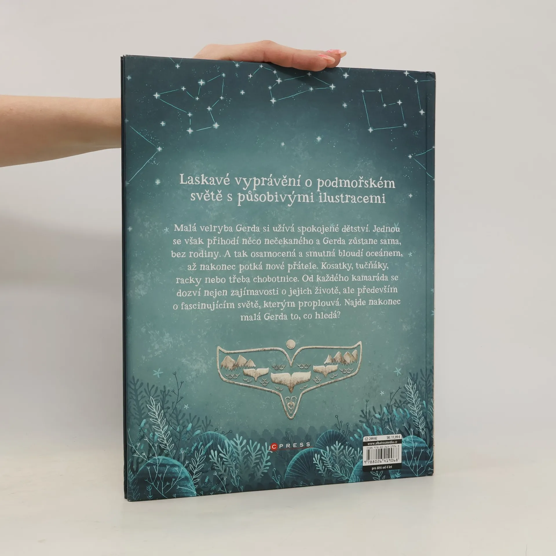 Laskavé vyprávění o podmořském světě s působivými ilustracemi. Malá velryba Gerda si užívá spokojené dětství. Jednou se však přihodí něco nečekaného a Gerda zůstane sama, bez rodiny. A tak osamocená a smutná bloudí oceánem, až nakonec potká nové přátele. Kosatky, tučňáky, racky nebo třeba chobotnice. Od každého kamaráda se dozví nejen zajímavosti o jejich životě, ale především o fascinujícím světě, kterým proplouvá. Najde nakonec malá Gerda to, co hledá?