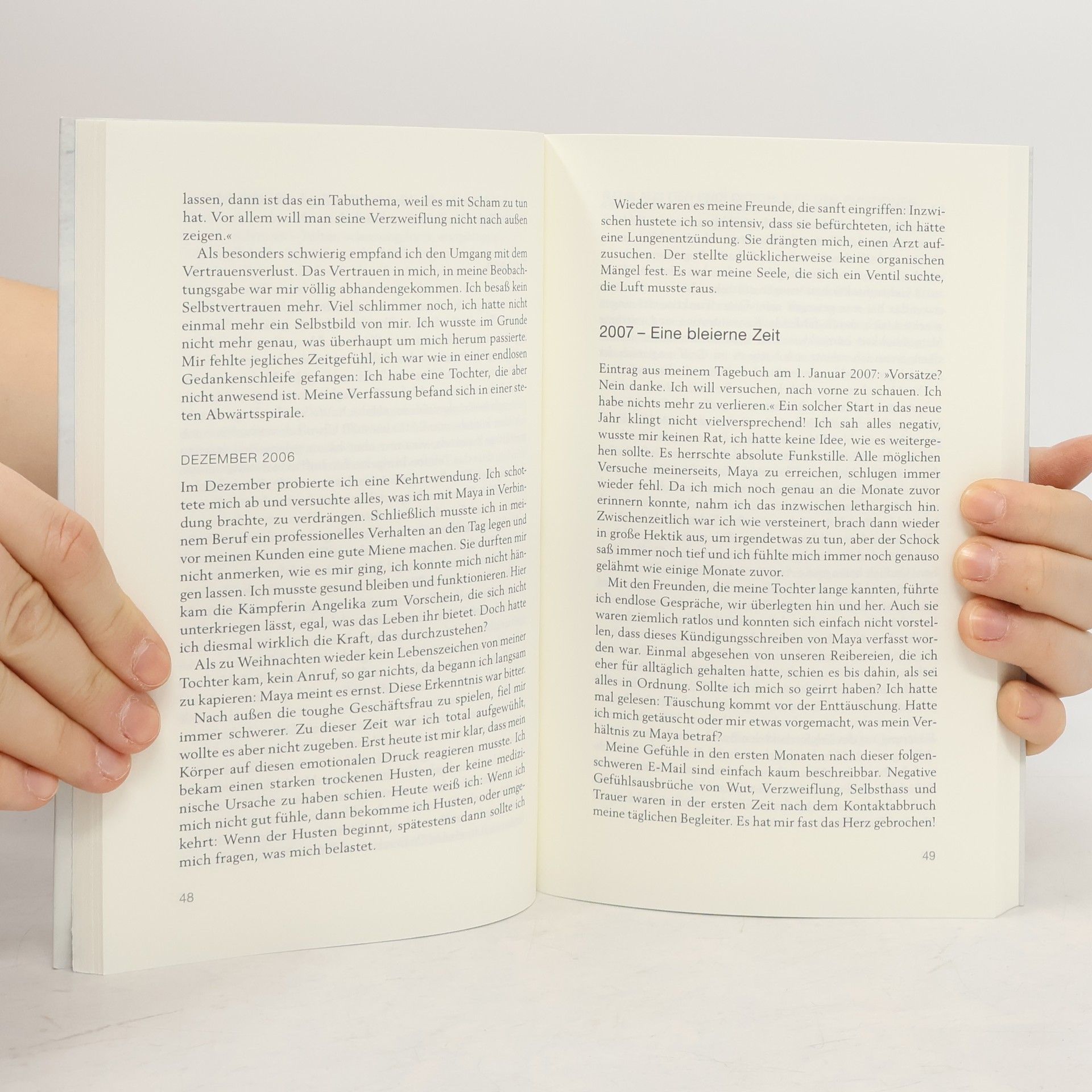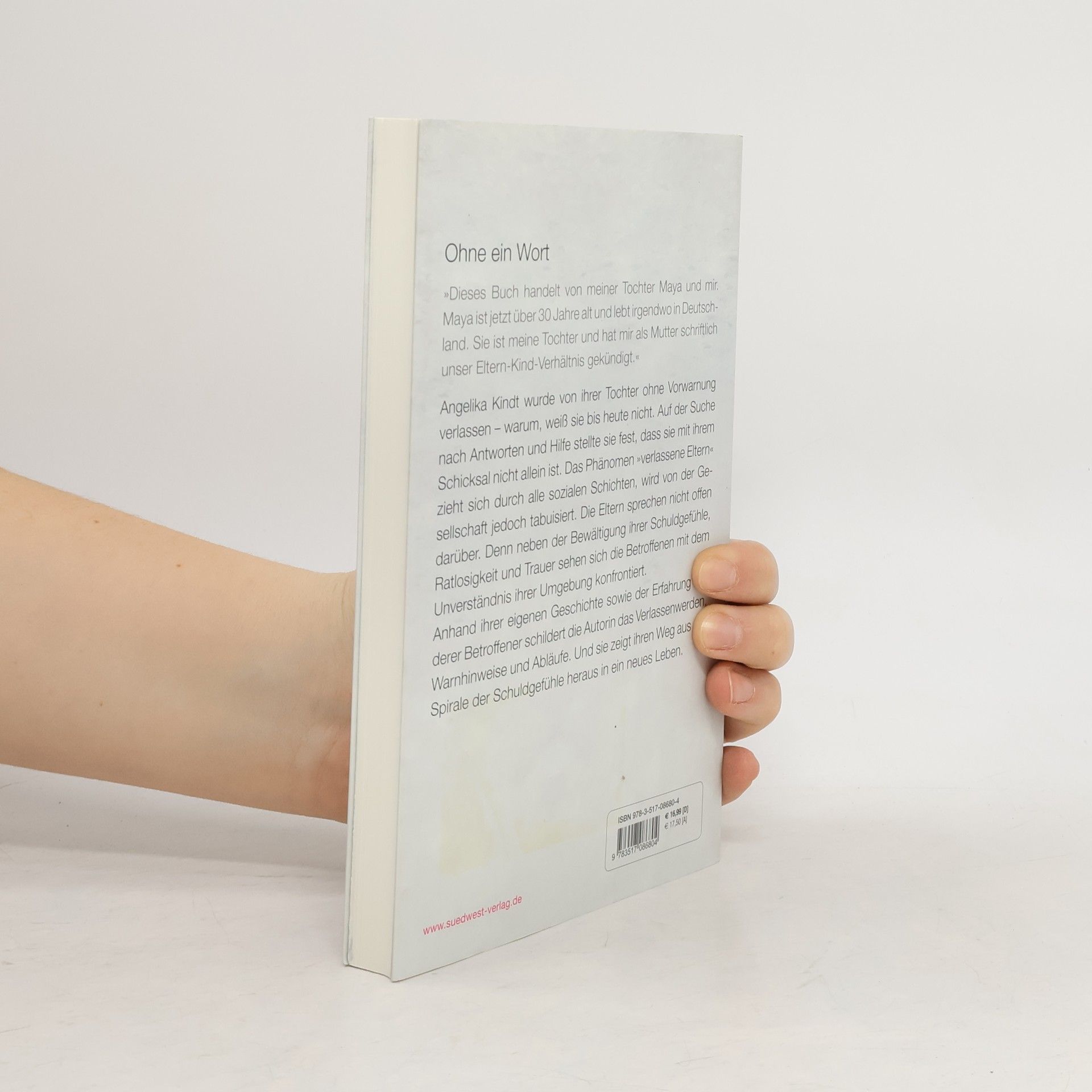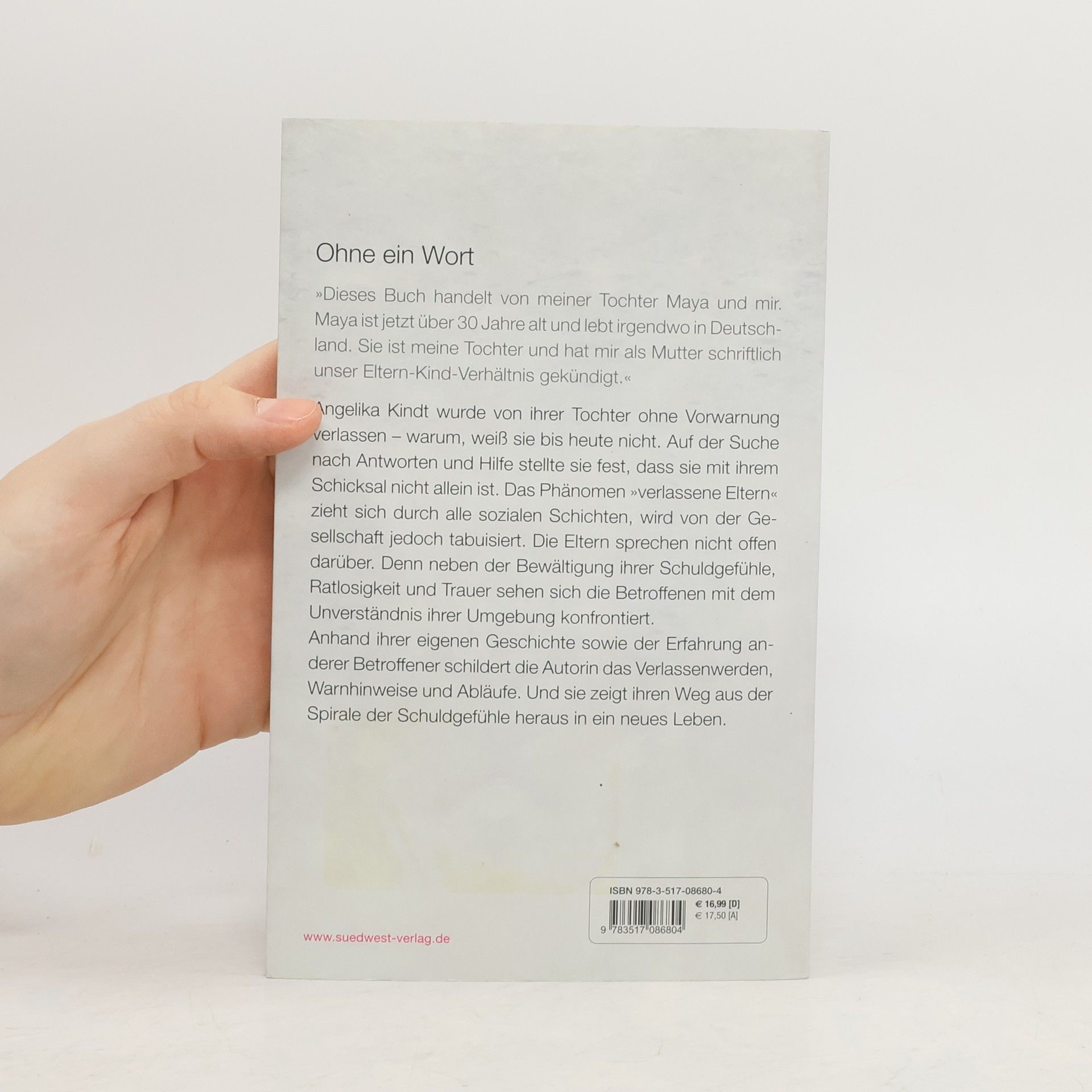 Verlassen werden ohne Vorwarnung - ein tabuisiertes Thema Angelika Kindt wurde von ihrer Tochter ohne Vorwarnung verlassen – warum, weiß sie bis heute nicht. Auf der Suche nach Antworten und Hilfe stellte sie fest, dass sie damit nicht allein ist. Das Phänomen „Verlassene Eltern“ zieht sich durch alle sozialen Schichten, wird von der Gesellschaft jedoch tabuisiert. Neben der Bewältigung ihrer Schuldgefühle, Ratlosigkeit und Trauer sehen sich die Betroffenen auch noch mit der Ablehnung und Ächtung durch die Umgebung konfrontiert. Anhand ihrer eigenen Geschichte sowie der Erfahrung anderer Betroffener schildert die Autorin den Prozess des „Verlassenwerdens“, die Warnhinweise und Abläufe. In Zusammenarbeit mit einer Psychologin werden Strategien und Handlungsvorschläge genannt, die betroffenen Eltern den Umgang mit ihrer schwierigen Situation erleichtern.