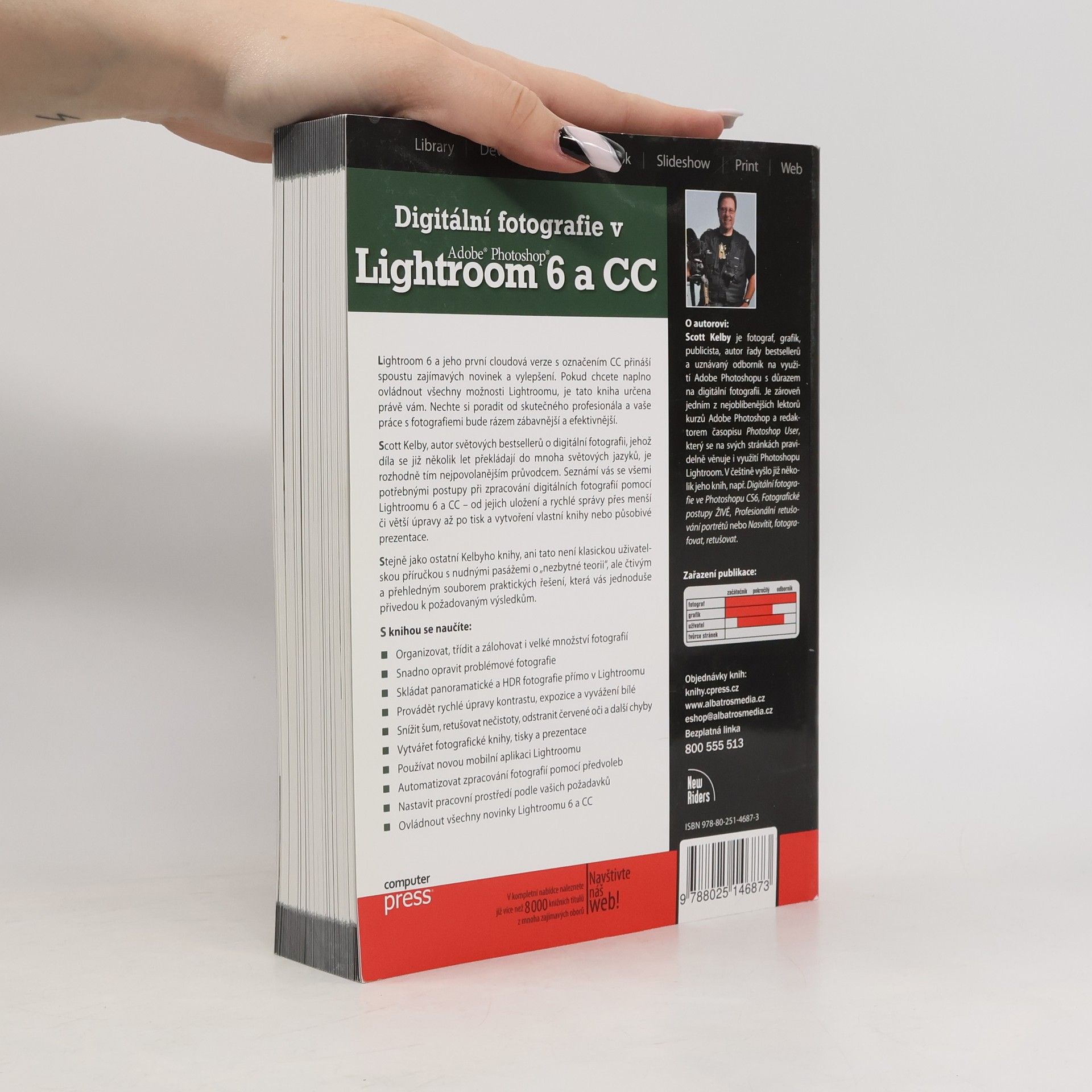 Nejoblíbenější příručka na Lightroom na světě přináší spoustu novinek a vylepšení, které vám pomohou naplno ovládnout všechny možnosti Lightroomu. Tato kniha je určena pro ty, kteří chtějí zefektivnit a zpříjemnit svou práci s fotografiemi. Scott Kelby, autor bestsellerů o digitální fotografii, seznámí vás se všemi potřebnými postupy při zpracování digitálních fotografií pomocí Lightroomu 6 a CC – od uložení a správy fotografií po úpravy, tisk a tvorbu prezentací. Kniha není klasickou uživatelskou příručkou, ale přehledným souborem praktických řešení, která vás snadno dovedou k požadovaným výsledkům. Naučíte se organizovat, třídit a zálohovat velké množství fotografií, snadno opravovat problémové snímky, skládat panoramatické a HDR fotografie přímo v Lightroomu, provádět rychlé úpravy kontrastu, expozice a vyvážení bílé, a také snižovat šum, retušovat nečistoty a odstraňovat červené oči. Dále se dozvíte, jak vytvářet fotografické knihy, tisky a prezentace, používat novou mobilní aplikaci Lightroomu, automatizovat zpracování fotografií pomocí předvoleb a přizpůsobit pracovní prostředí vlastním požadavkům. Ovládnete všechny novinky Lightroomu 6 a CC.