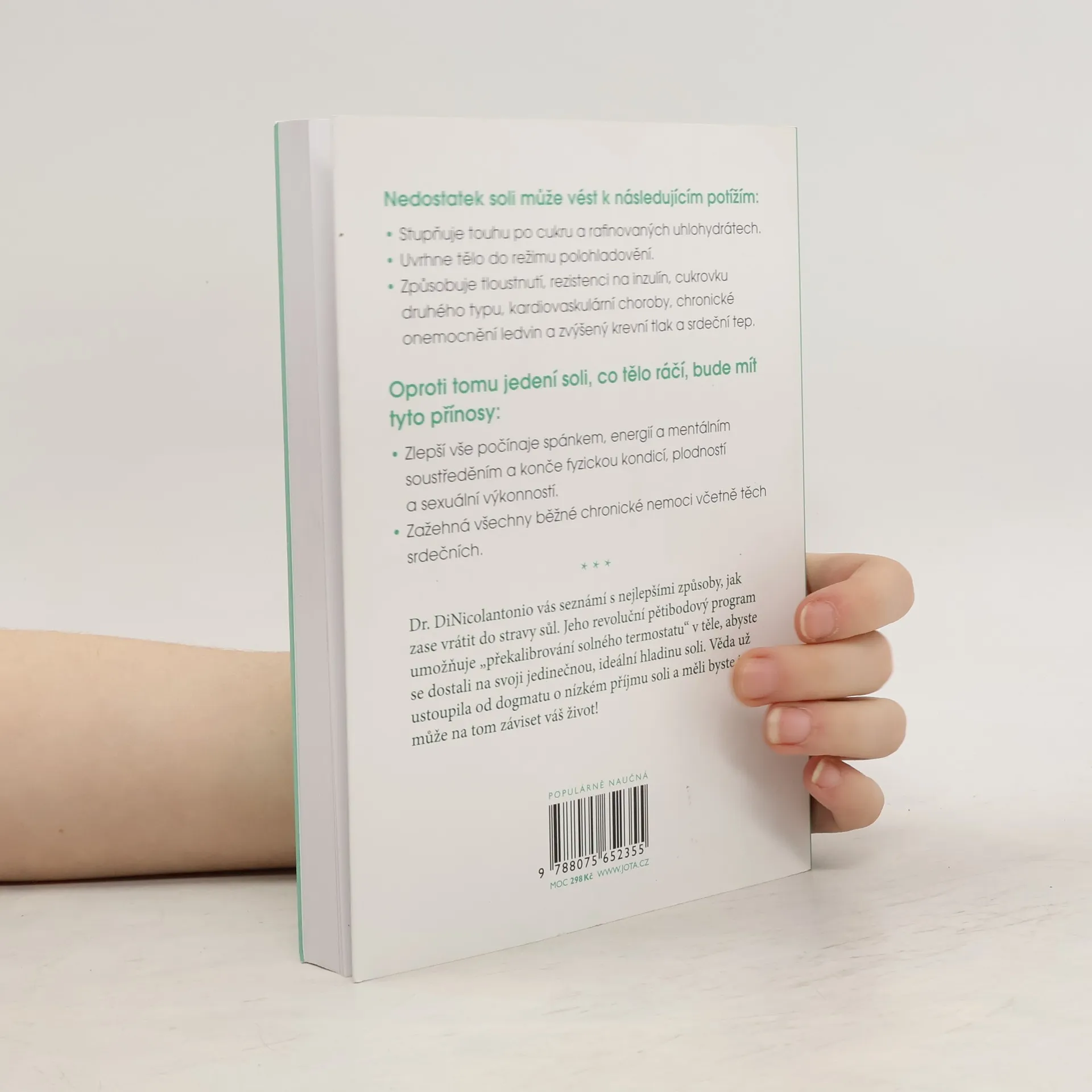 Lži odborníků o látce, bez které nemůžeme žít. Jak vám vydatné solení může zachránit život? Všichni jsme slyšeli doporučení o omezení příjmu soli na jednu čajovou lžičku denně, ale co když je to mylné? Dr. James DiNicolantonio, přední vědec v oblasti kardiovaskulárního výzkumu, zkoumal více než 500 publikací a dospěl k ohromujícímu závěru: většina z nás by měla jíst více soli. Kniha odhaluje nespravedlivou démonizaci soli a ukazuje, jak byla sůl nesprávně spojována s cukrem. Nedostatek soli může vést k vážným problémům, jako je zvýšená touha po cukru, polohladovění, obezita, inzulínová rezistence, cukrovka druhého typu, kardiovaskulární choroby, chronické onemocnění ledvin a zvýšený krevní tlak. Naopak, dostatečný příjem soli zlepšuje spánek, energii, mentální soustředění, fyzickou kondici a plodnost, a pomáhá předcházet chronickým onemocněním. Dr. DiNicolantonio představuje pětibodový program, který pomůže vrátit sůl do vaší stravy a „překalibrovat solný termostat“ v těle, abyste dosáhli ideální hladiny soli. Věda se posunula od dogmatu o nízkém příjmu soli, a měli byste se k tomu připojit – může to zachránit váš život!