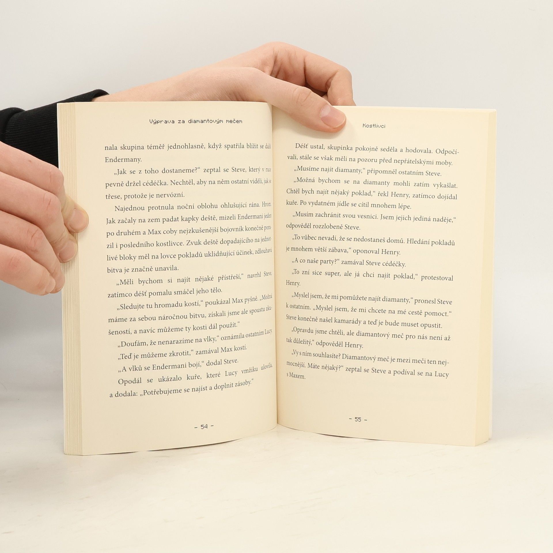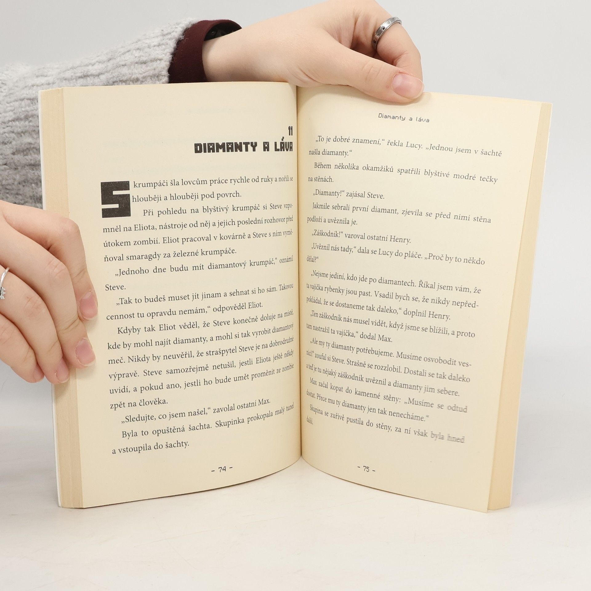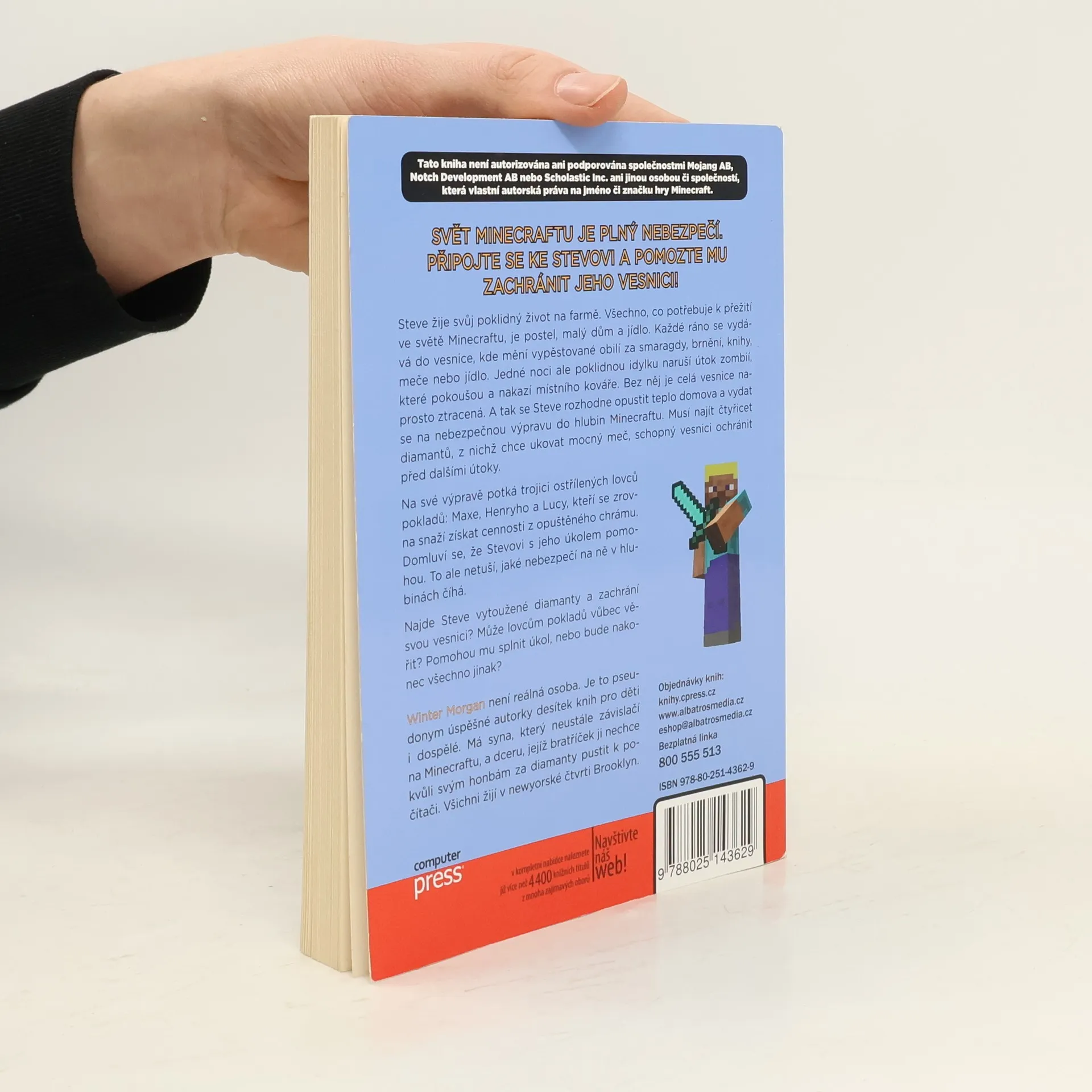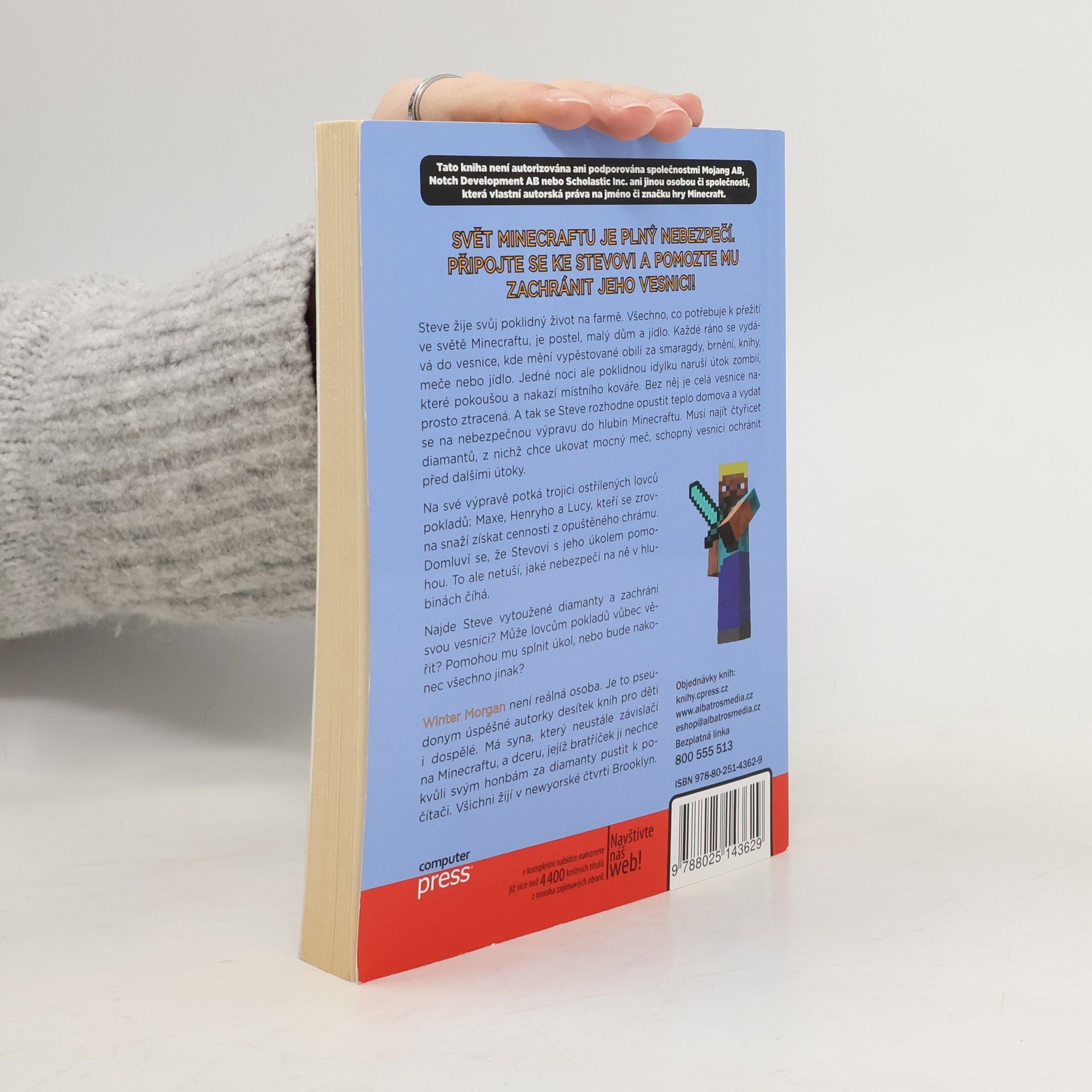Steve žije klidný život na farmě, kde má vše potřebné k přežití: postel, malý dům a jídlo. Každé ráno navštěvuje vesnici, aby vyměnil obilí za smaragdy, brnění, knihy, meče nebo jídlo. Jedné noci však jeho idylku naruší útok zombií, které pokoušou místního kováře. Bez něj je vesnice v ohrožení, a tak se Steve rozhodne opustit domov a vyrazit na nebezpečnou výpravu do hlubin Minecraftu. Jeho cílem je najít čtyřicet diamantů, aby ukoval mocný meč, který vesnici ochrání před dalšími útoky. Na své cestě potká trojici lovců pokladů: Maxe, Henryho a Lucy, kteří se snaží získat cennosti z opuštěného chrámu. Dohodnou se, že Stevovi pomohou, aniž by tušili, jaké nebezpečí na ně čeká. Dokáže Steve najít diamanty a zachránit vesnici? Může lovcům pokladů věřit? Pomohou mu splnit úkol, nebo se vše obrátí jinak? Winter Morgan není reálná osoba, ale pseudonym úspěšné autorky knih pro děti i dospělé, která žije v Brooklynu se svým synem a dcerou.