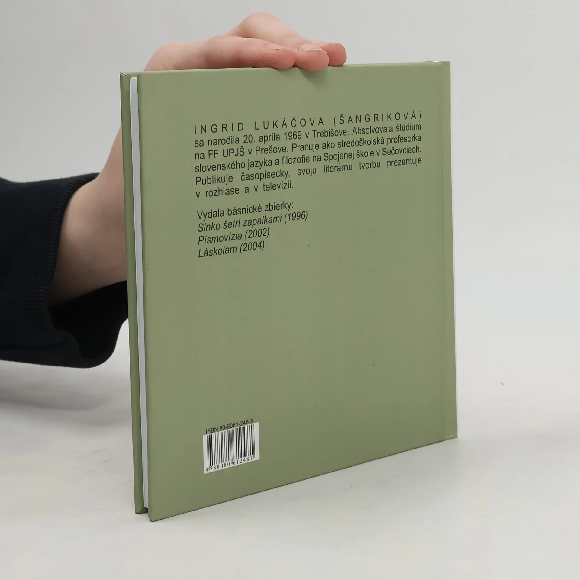 Ingrid Lukáčová, stredoškolská profesorka slovenského jazyka a filozofie, má už sa sebou vydanie troch básnických zbierok: Slnko šetrí zápalkami (1996), Písmovízia (2002) a Láskolam (2004). Preto sa v jej prípade čitateľ môže tešiť na zrelý, harmonický prejav. Rukopis obsahuje 48 básní kompozične roz-delených do dvoch častí (Rezonancia, Si a Ja). Tvorba Ingrid Lukáčovej "ráta" s vnímavou, citovo bohatou čitateľskou verejnosťou, ktorej schopnosti sú naplno rozvinuté i na intelektuálnej úrovni. Autorkina presnosť a miestami až drsnosť je pekne vyvážená ženskou intuitívnosťou a vnikaním do hlbších rovín skutočnosti. Lukáčová disponuje očividným darom slovnej a obrazovej asociácie, ktorý najmä v spoločnosti originálneho uvažovania zaručuje bohatý vnútorný zážitok.