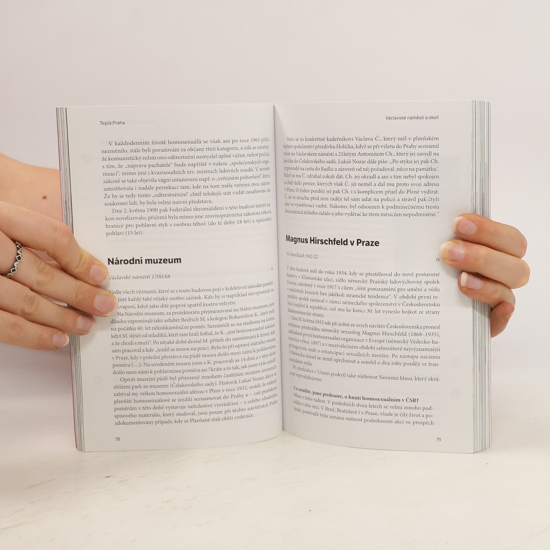 Podívejte se na Prahu jinýma očima. Poněkud neobvyklý průvodce Prahou vám to umožní. Kniha seznamuje se 150 místy, která jsou spojena s queer komunitou. Kniha je rozdělena do několika vycházek, každá vycházka je doplněna mapkou. Nevěnuje se jen centru města, ale zabíhá i do periferních oblastí. Z předmluvy ke knize: Turisté, kteří dnes stojíce před budovou Národního divadla fotografují mozaiku s kněžnou Libuší na průčelí Obecního domu, netuší, že někde v okolí, možná na záchodcíchna dnešním Náměstí Republiky, se v roce 1902 seznámil Gustav Wolf z Františkových Lázní s vojákem, který ho po několika okamžicích horečnaté vášně nedaleko potoka Brusnice zavraždil, že jeden z "mužů října", kteří 28.10. 1918 vyhlásili republiku, byl po deseti letech obětí vymyšlené kampaně v novinách, že měl podíl na "homosexuální aféře ve Vrútkách", že v dnešní budově Komerční banky vlevo od Obecního domu v roce 1956 politbyro KSČ jednalo o odtrestnění homosexuality, ale nakonec rozhodlo odtrestnit raději umělé přerušení těhotenství, a že když se otočí vpravo do Hybernské ulice, spatří bývalé sídlo Sudetoněmecké strany, kde byl v roce 1937 zatčen kvůli paragrafu 129 její čelný politik Heinz Rutha, který za měsíc spáchal ve vězení sebevraždu.