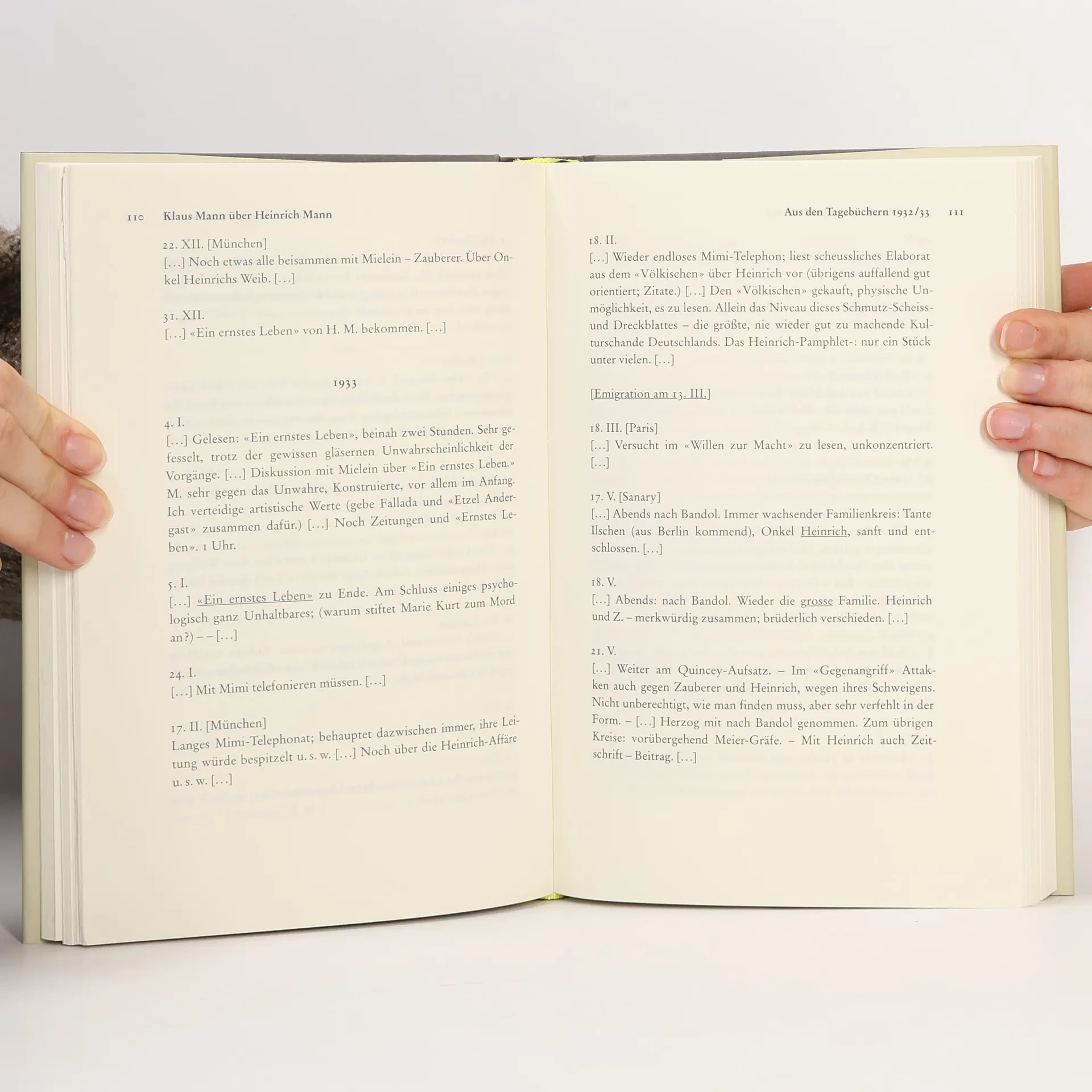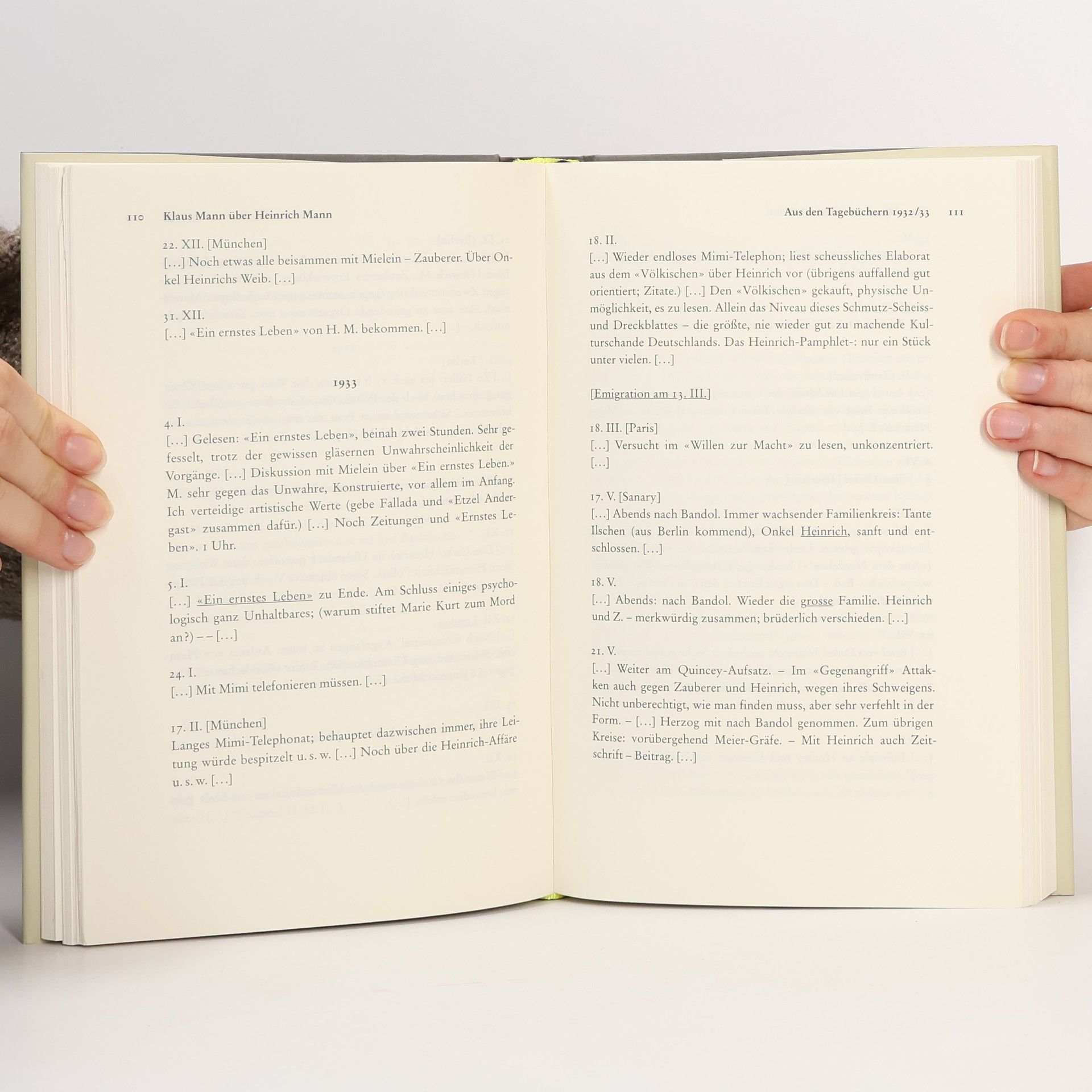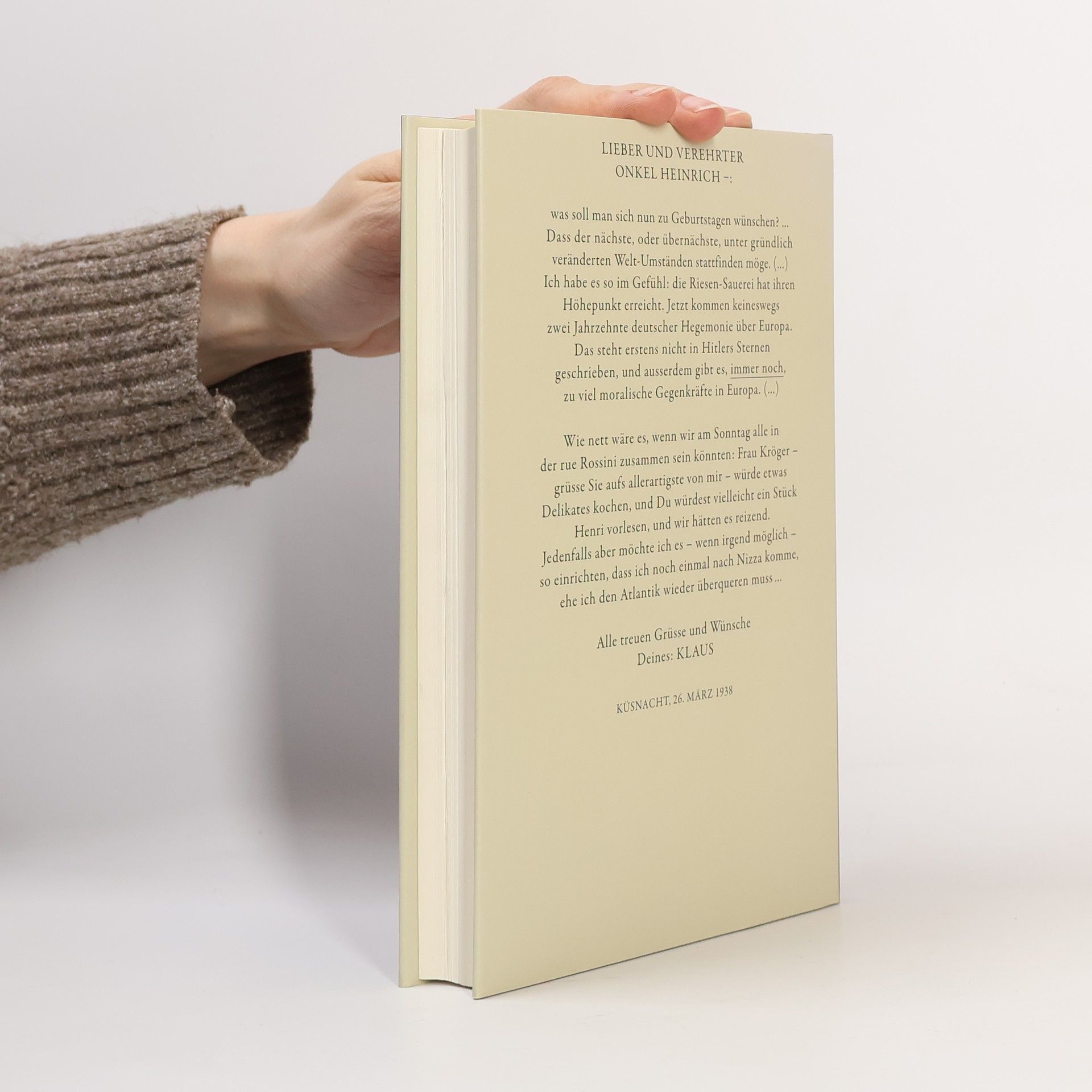 LIEBER UND VEREHRTER ONKEL HEINRICH –: was soll man sich nun zu Geburtstagen wünschen? … Dass der nächste, oder übernächste, unter gründlich veränderten Welt-Umständen stattfinden möge. (…) Ich habe es so im Gefühl: die Riesen-Sauerei hat ihren Höhepunkt erreicht. Jetzt kommen keineswegs zwei Jahrzehnte deutscher Hegemonie über Europa. Das steht erstens nicht in Hitlers Sternen geschrieben, und ausserdem gibt es, immer noch, zu viel moralische Gegenkräfte in Europa. (…) Wie nett wäre es, wenn wir am Sonntag alle in der rue Rossini zusammen sein könnten: Frau Kröger – grüsse Sie aufs allerartigste von mir – würde etwas Delikates kochen, und Du würdest vielleicht ein Stück Henri vorlesen, und wir hätten es reizend. Jedenfalls aber möchte ich es – wenn irgend möglich – so einrichten, dass ich noch einmal nach Nizza komme, ehe ich den Atlantik wieder überqueren muss … Alle treuen Grüsse und Wünsche Deines: KLAUS KÜSNACHT, 26. MÄRZ 1938