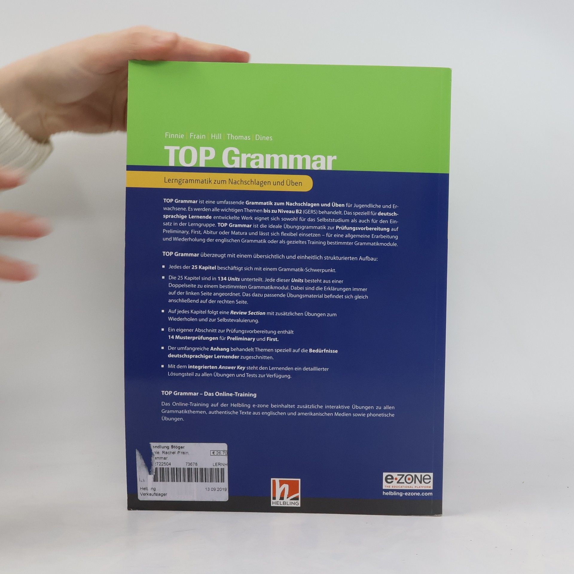 TOP Grammar ist eine umfassende Grammatik für Jugendliche und Erwachsene, die alle wichtigen Themen bis Niveau B2 des Gemeinsamen Europäischen Referenzrahmens abdeckt. Das Werk ist speziell für deutschsprachige Lerner konzipiert und eignet sich sowohl für das Selbststudium als auch für Lerngruppen. Es ist ideal zur Prüfungsvorbereitung auf PET, FCE, Abitur oder Matura und ermöglicht eine flexible Anwendung – sei es für allgemeine Erarbeitung oder gezieltes Training bestimmter Grammatikmodule. Die klare Struktur umfasst 25 Kapitel, die in 134 Lerneinheiten unterteilt sind. Jede Einheit besteht aus einer Doppelseite mit Erklärungen auf der linken Seite und passenden Übungen auf der rechten. Nach jedem Kapitel folgt eine Review-Section mit zusätzlichen Übungen zur Wiederholung und Selbstevaluation. Ein spezieller Abschnitt zur Prüfungsvorbereitung enthält 14 Musterprüfungen für PET, KET und FCE, die den Anforderungen der neuen ESOL Exams 2019 entsprechen. Der umfangreiche Anhang behandelt Themen wie false friends, prepositional verbs, phrasal verbs, leicht verwechselbare Wörter, Interpunktion und Aussprache, speziell für deutschsprachige Lerner. Ein integrierter Lösungsteil bietet detaillierte Antworten zu allen Übungen und Tests. Zusätzlich steht ein kostenloses Online-Training über einen im Buch abgedruckten Code auf der HELBLING e-zone zur Verfügung, das weitere Übungen mit automatischer Korrekturfunktion bietet.